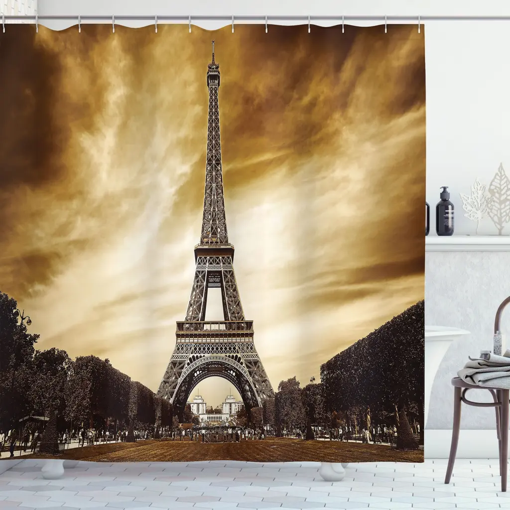 Ambesonne Eiffel Shower Curtain, Cloth Fabric Bathroom Decor Set With Hooks - 69 X 70 - Yellow And Brown