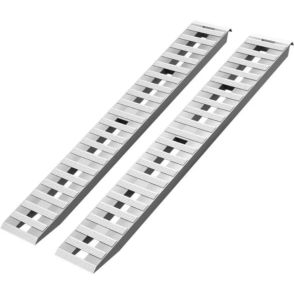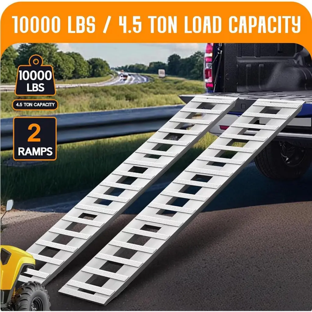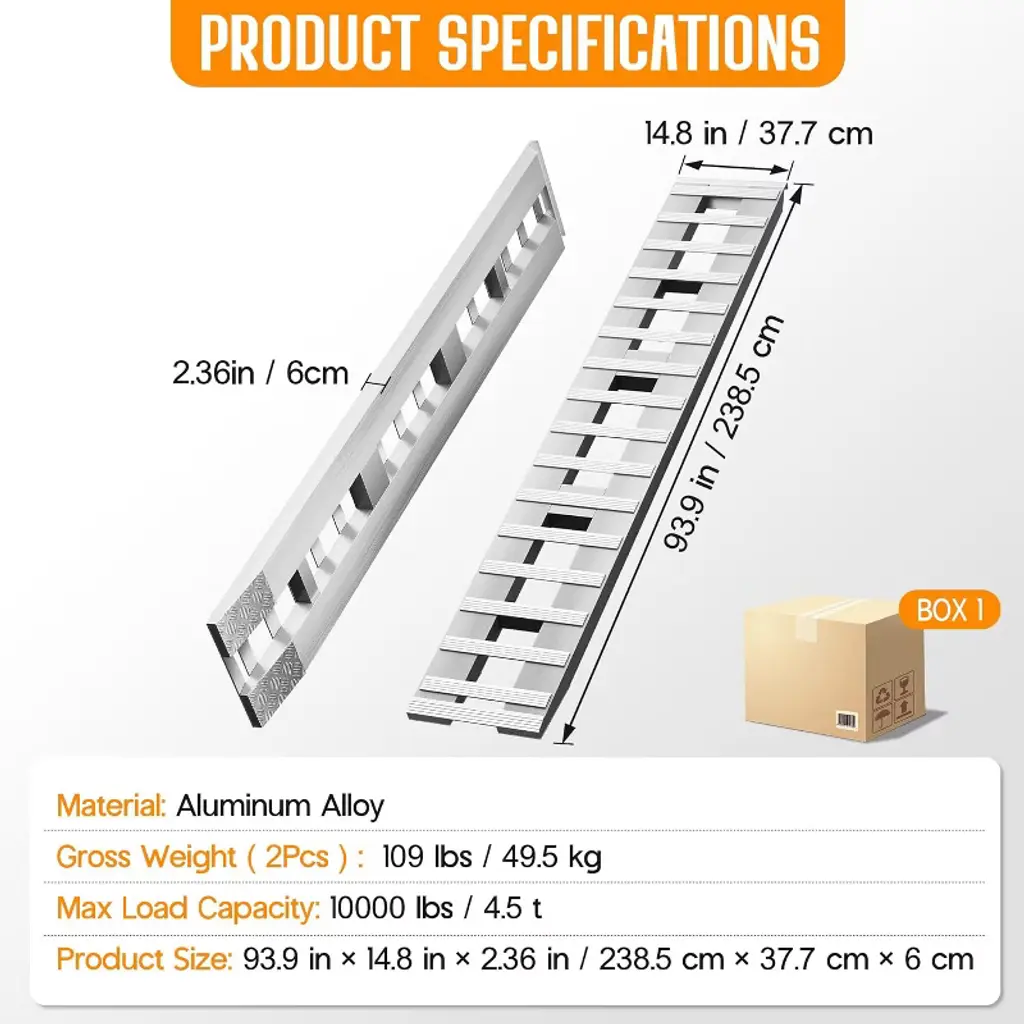 These 94" x 15" aluminum trailer ramps provide a reliable and heavy-duty loading solution with a 10,000 lbs total capacity per pair. Designed with U-shaped buckles and top hooks, they securely attach to trailers and prevent shifting during use. The 4" anti-slip rungs and textured surface increase tire grip, ensuring safe loading even in wet or rugged conditions. Made of high-strength aluminum alloy, the ramps are both lightweight and durable, suitable for long-term outdoor use. Perfect for loading ATVs, UTVs, motorcycles, lawnmowers, tractors, and trucks, they are widely applicable on farms, workshops, docks, and transport yards. Each ramp supports up to 5,000 lbs individually, offering dependable strength and stability. ·Material: Aluminum Alloy ·Color: Silver ·Product Size: 94" L × 15" W × 2.4" H ·Gross Weight (Pair): 109 lbs / 49.5 kg ·Load Capacity: 10,000 lbs / 4.5 t (per pair) ·Per Ramp Capacity: 5,000 lbs ·Recommended Load Height: 17" (Max 21") ·Features: U-shaped Buckle & Hook, Anti-Slip Rungs, Rust-Resistant