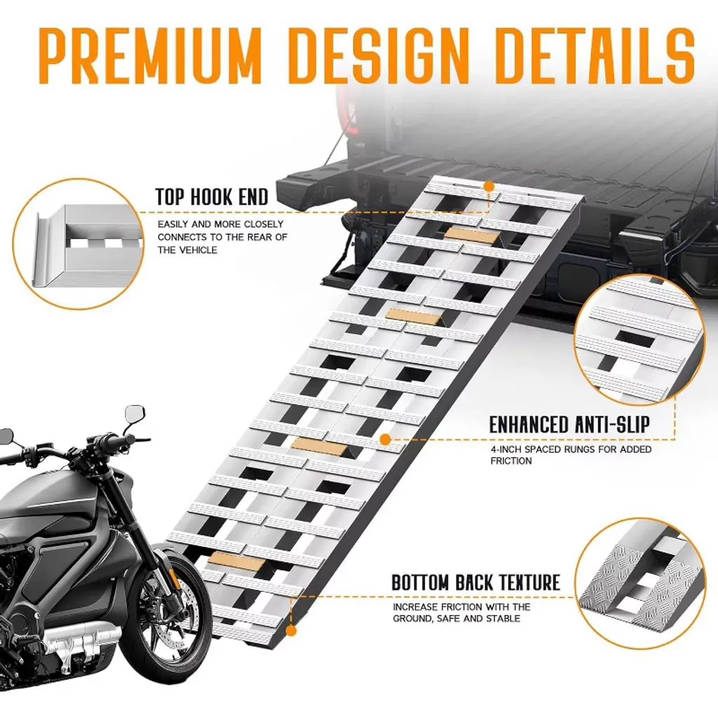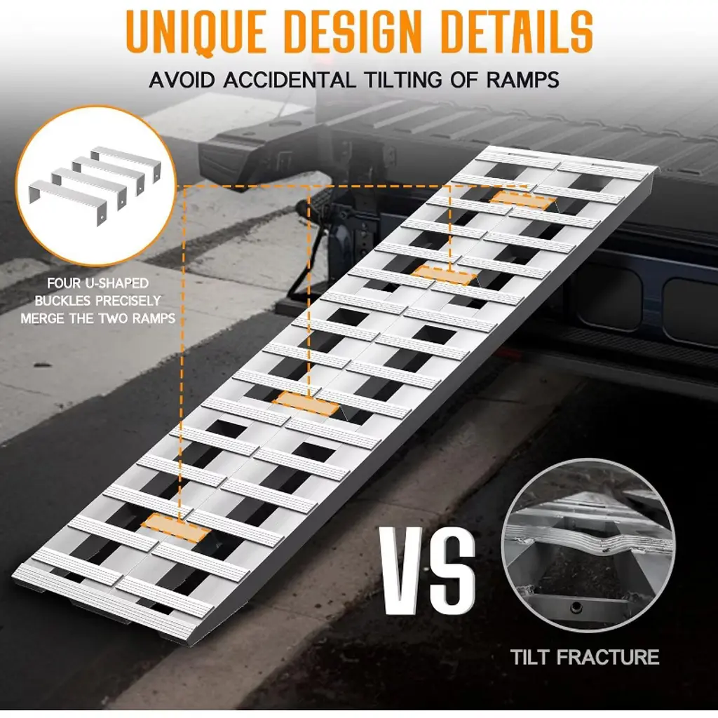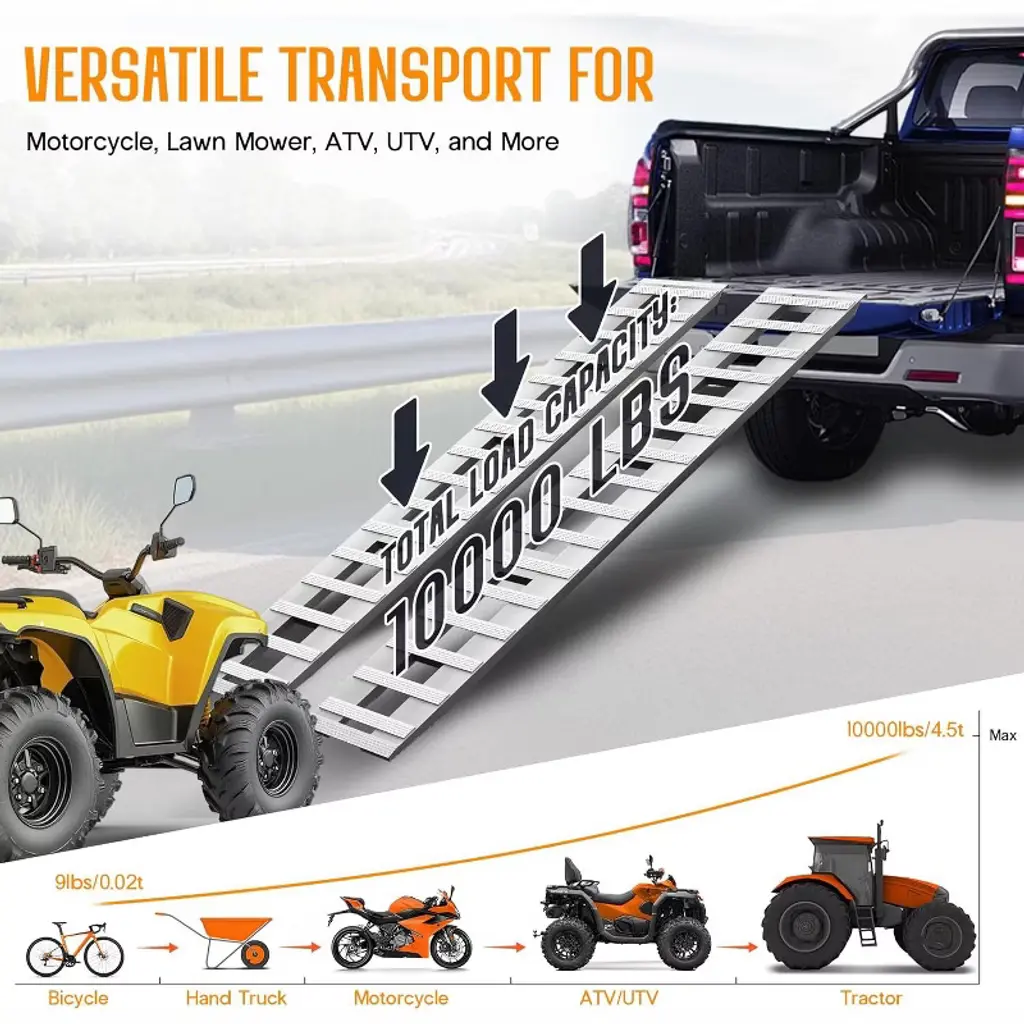 These 94" x 15" aluminum trailer ramps provide a reliable and heavy-duty loading solution with a 10,000 lbs total capacity per pair. Designed with U-shaped buckles and top hooks, they securely attach to trailers and prevent shifting during use. The 4" anti-slip rungs and textured surface increase tire grip, ensuring safe loading even in wet or rugged conditions. Made of high-strength aluminum alloy, the ramps are both lightweight and durable, suitable for long-term outdoor use. Perfect for loading ATVs, UTVs, motorcycles, lawnmowers, tractors, and trucks, they are widely applicable on farms, workshops, docks, and transport yards. Each ramp supports up to 5,000 lbs individually, offering dependable strength and stability. ·Material: Aluminum Alloy ·Color: Silver ·Product Size: 94" L × 15" W × 2.4" H ·Gross Weight (Pair): 109 lbs / 49.5 kg ·Load Capacity: 10,000 lbs / 4.5 t (per pair) ·Per Ramp Capacity: 5,000 lbs ·Recommended Load Height: 17" (Max 21") ·Features: U-shaped Buckle & Hook, Anti-Slip Rungs, Rust-Resistant