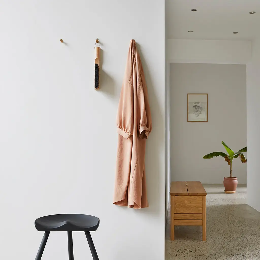 The brass hook has been processed from a single piece of lathe turned solid brass. The grid surface provides a structure that is pleasant to the touch and keeps clothes and towels from slipping off. Depending on your preference you can either let it patina, so it attains a darker shade or keep it polished and shiny. The hook is also well-suited as a handle on drawers, cupboards, etc."With the wall hook we wanted to underline the recurring and fantastic material with the grid surface. Its shape is built to balance the measurements of the Angle Stool perfectly." - Herman Studio