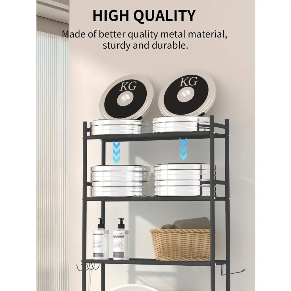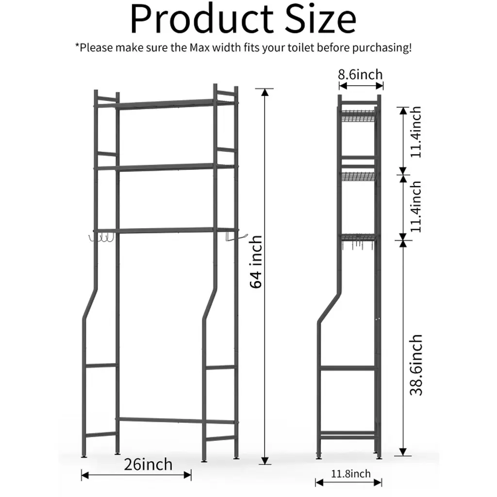 Maximize your bathroom space with this 3-tier over-the-toilet storage rack, featuring sturdy carbon steel shelves and 4 convenient hooks for organizing towels, toiletries, and more. The freestanding design fits most standard toilets, while anti-tilt kits ensure stability for safe, worry-free use. Versatile and stylish in sleek black, it’s the perfect solution for decluttering bathrooms, kitchens, or any room in need of extra organization.