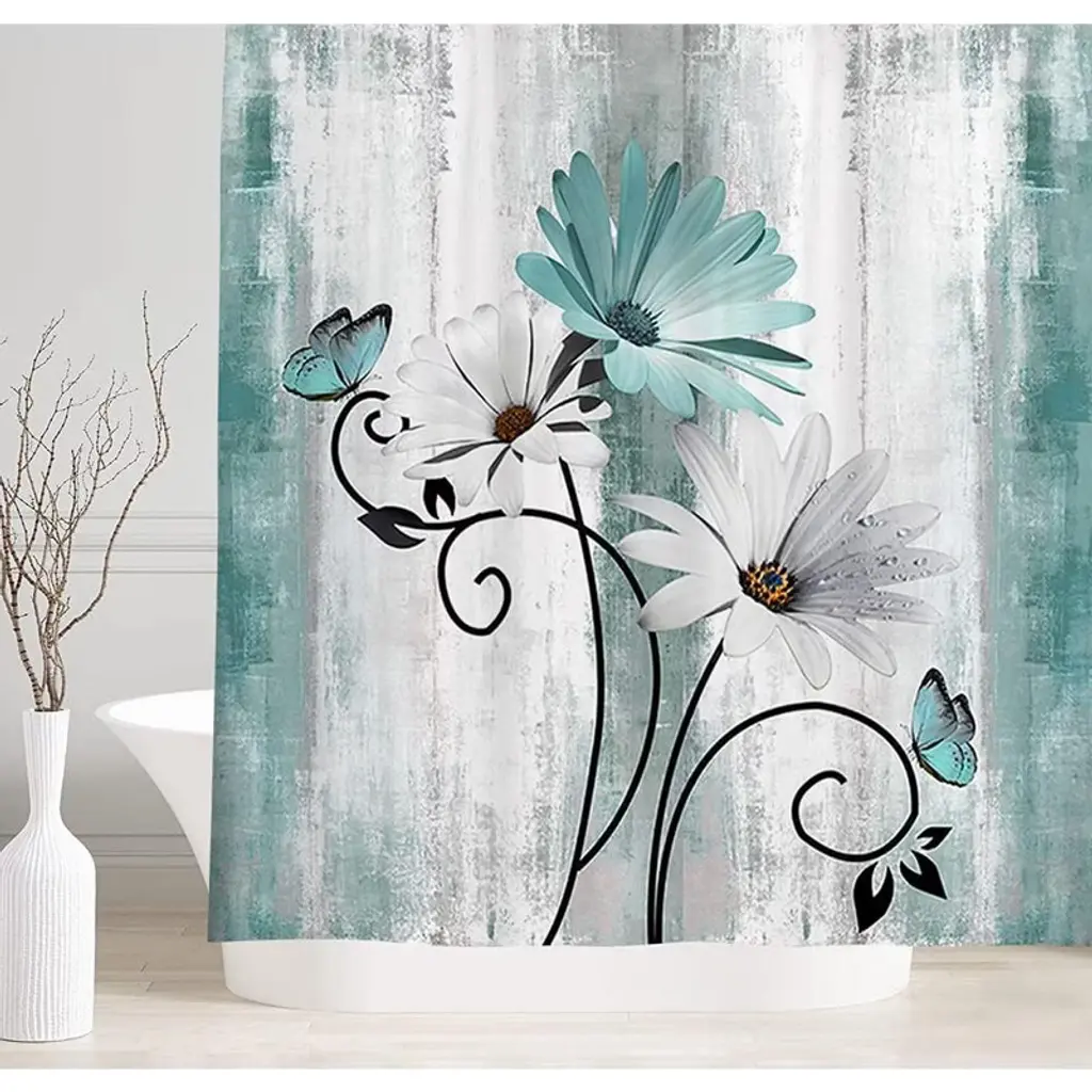 Aoibox Rustic Farmhouse Shower Curtain With Teal Daisy Floral And Butterfly Design For Bathroom Decor, Includes 12 Hooks