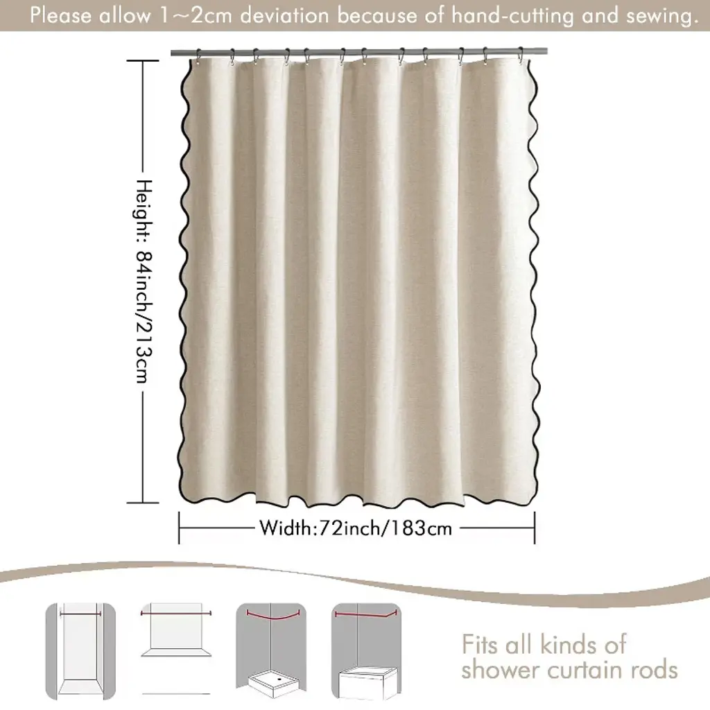 Enhance your bathroom with this exquisite scalloped shower curtain. It comes with 12 bonus metal hooks, which are rust - resistant and easy to slide, saving you money and hassle. The curtain is made of an upgraded faux linen fabric. Its two - yarn parallel weave creates an organic cross aesthetic, giving it a unique and elegant look. Treated with advanced water - repellent technology, it ensures water rolls off quickly, keeping your bathroom clean and dry. The fabric is thick and dense, providing maximum privacy without the need for a liner. Plus, premium dyeing means no fading. Available in multiple colors, its scalloped edges with black trim add a touch of elegance to any bathroom decor. To care for it, simply machine wash in cold water with mild detergent on a gentle cycle. Ideal for bathrooms in homes and hotels, this shower curtain is a practical and stylish addition to your daily life.