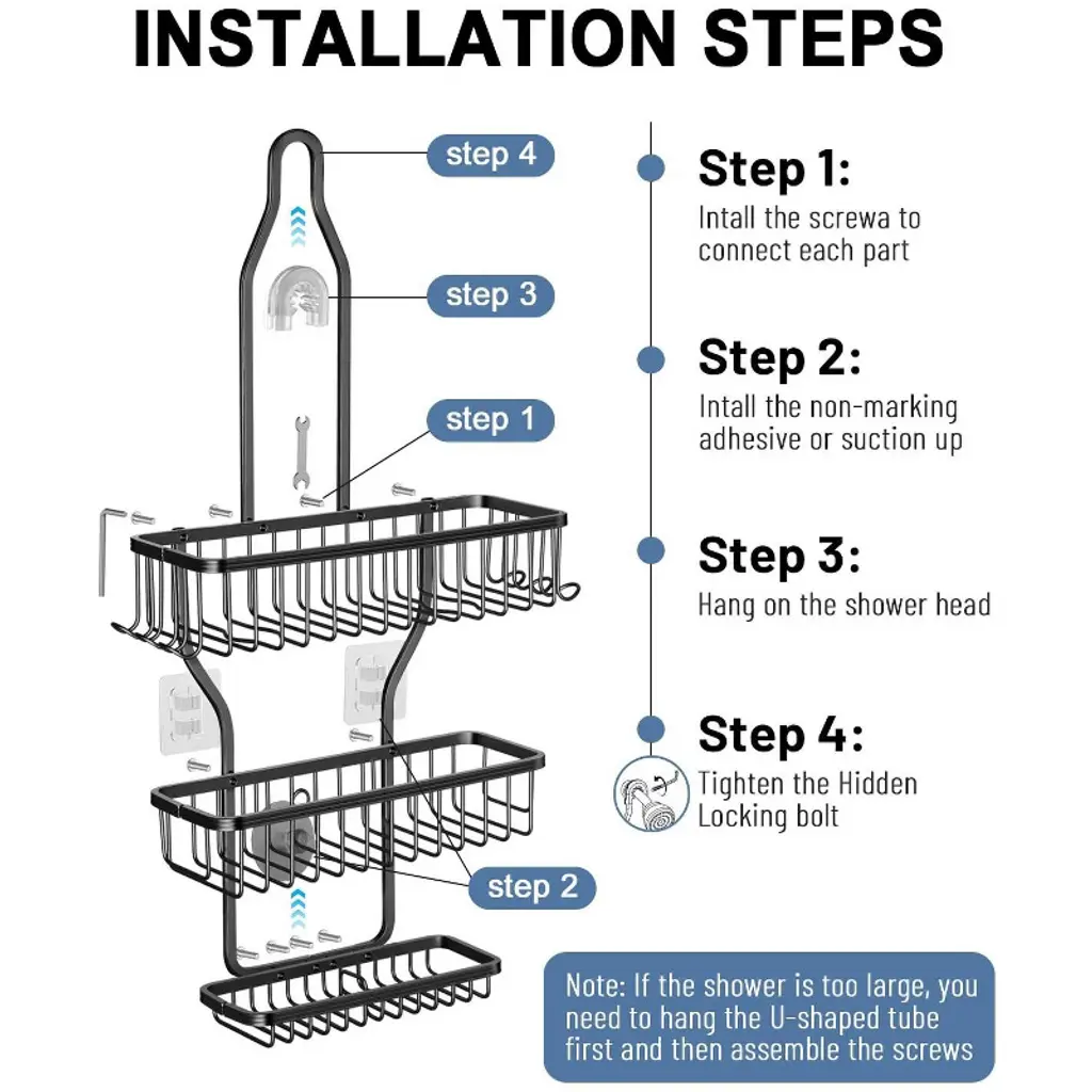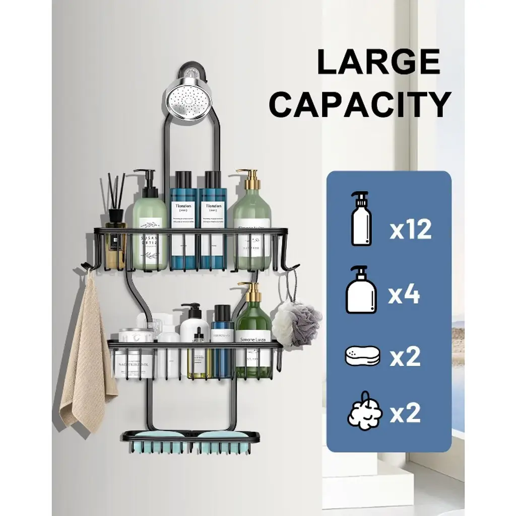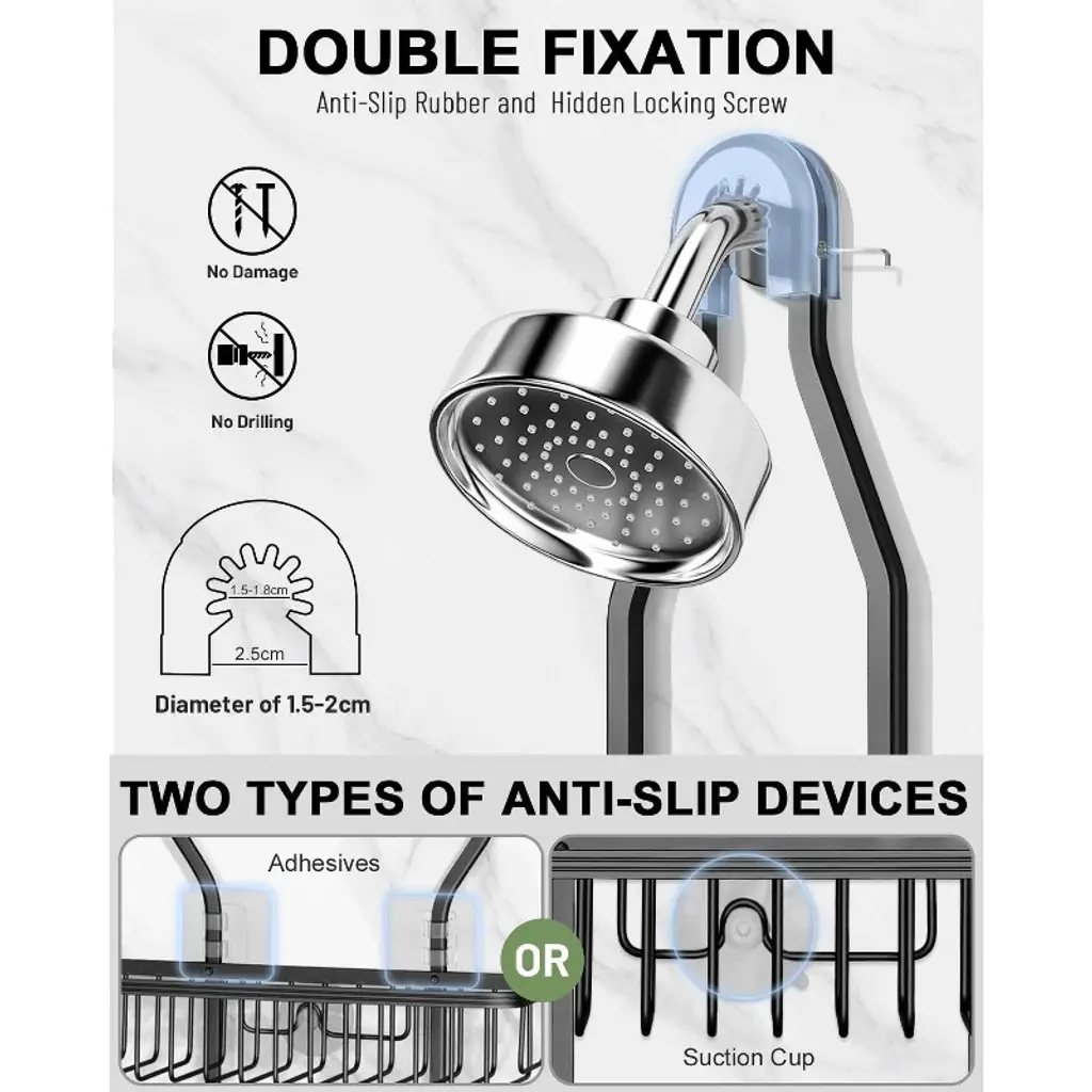 Upgrade your shower organization with this amazing shower caddy! It features a large capacity design with 3 baskets and 6 hooks. The top baskets have an inverted bottle storage design for easy dispensing of liquids like shampoo and shower gel. The bottom soap basket is perfect for soap. Made of aluminum alloy, it never rusts and can hold up to 40 pounds of toiletries, suitable for wet bathroom environments. The anti - slip and strong fixation design ensures stability when you take items. It can store all your shower essentials and has hooks for hanging towels and tools. Installation is a breeze - no need to drill holes in the wall, just assemble with a screwdriver. This caddy is a must - have for a tidy and convenient shower experience.