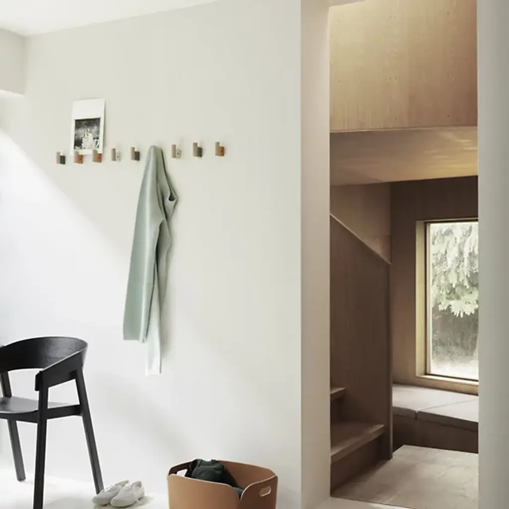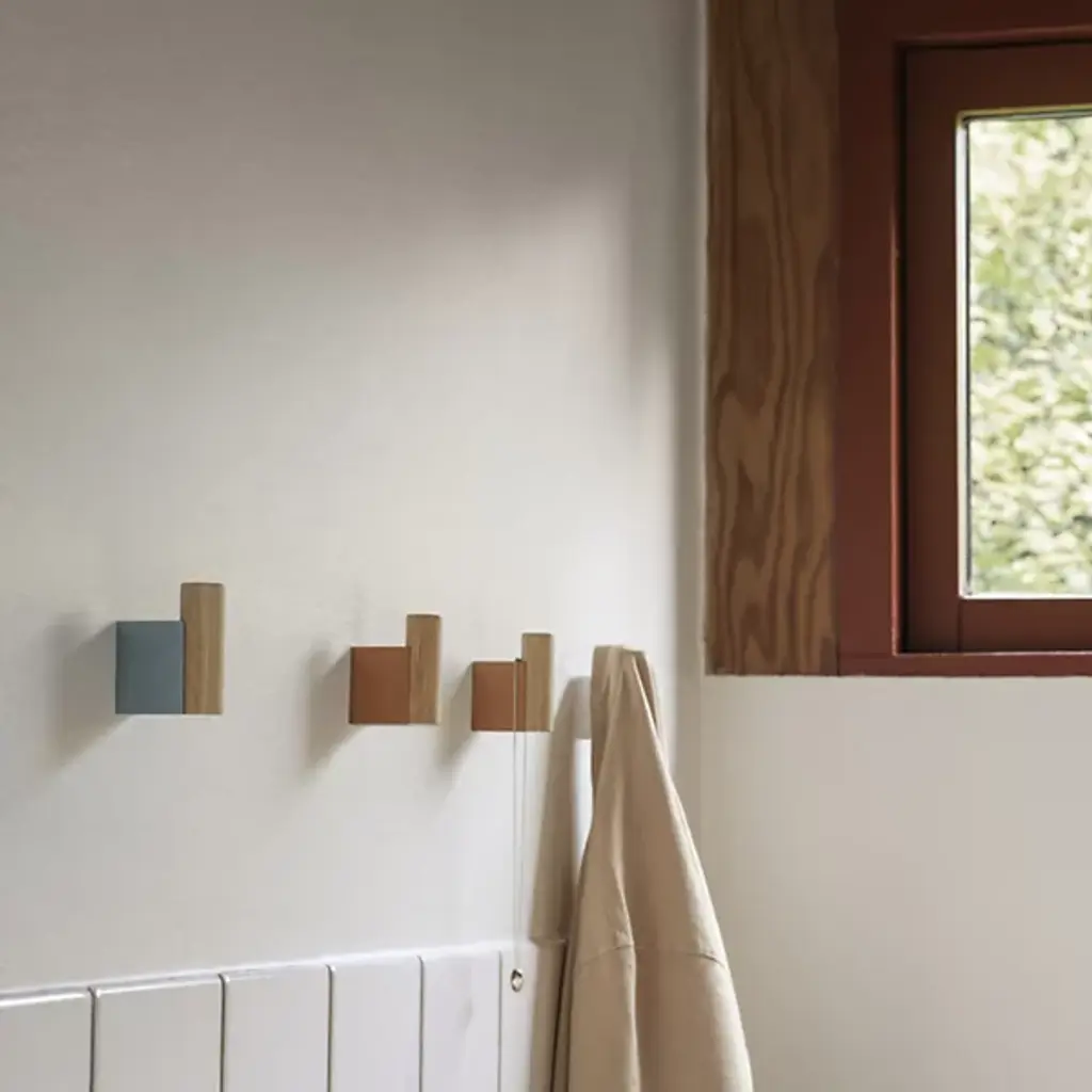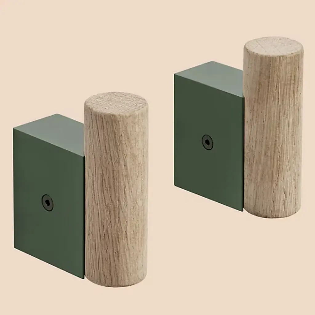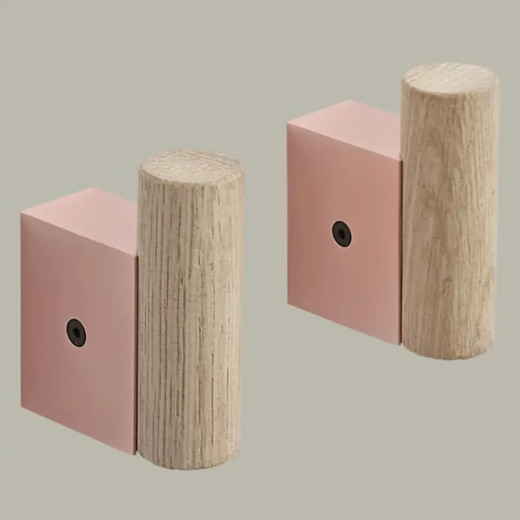 The Attach Coat Hook, Set of 2 from Muuto is where industrial elegance meets whimsy. Dimitri Bähler's design marries oak's warmth with aluminum's cool precision, creating a hook that's as much art as it is utility. The juxtaposition of round and square forms adds visual interest, while the PVD vacuum-treated surface ensures durability. Arrange these hooks in straight lines for a minimalist look, or mix colors for a more playful vibe.