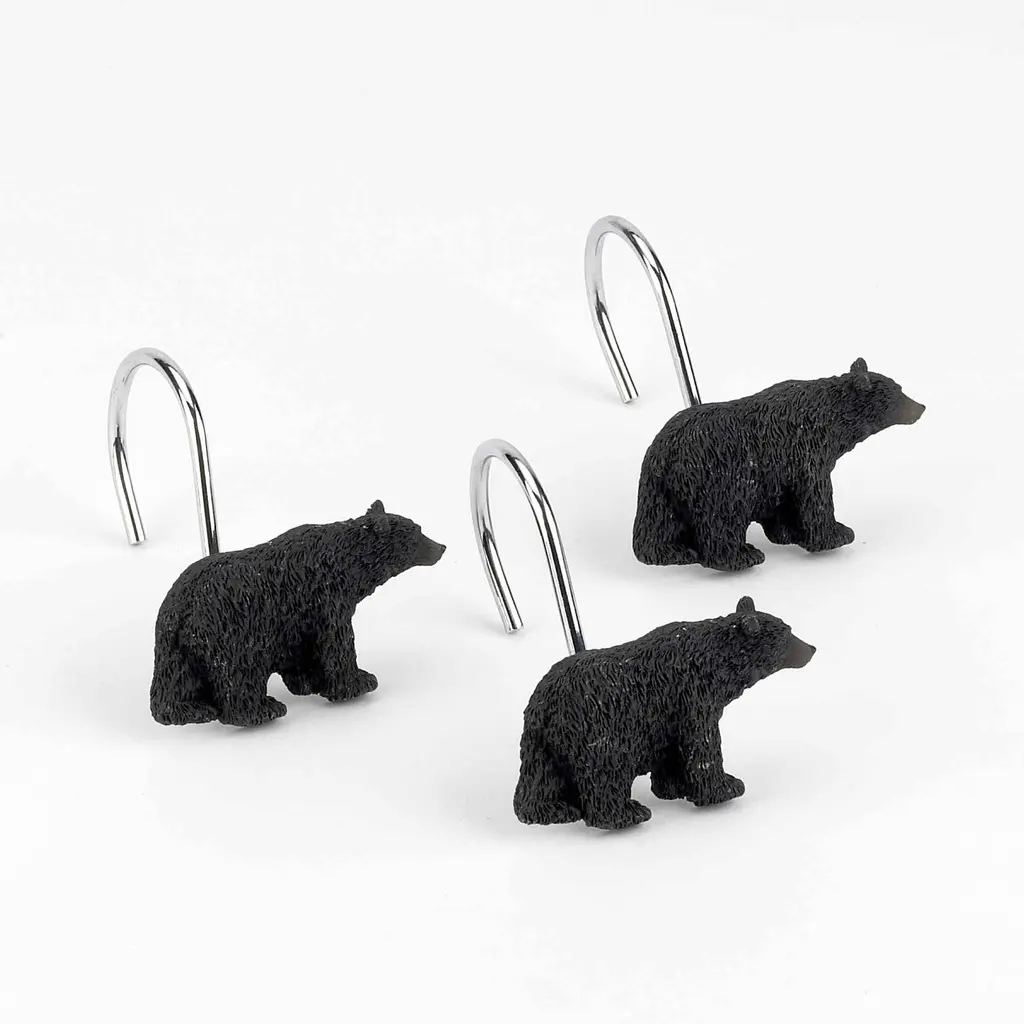 The Avanti Black Bear Lodge Shower Hook Set features a realistically crafted figural black bear on the move. Made of durable, hand-painted resin, includes 12 hooks. Coordinating shower curtain, accessories, towels and rug available.