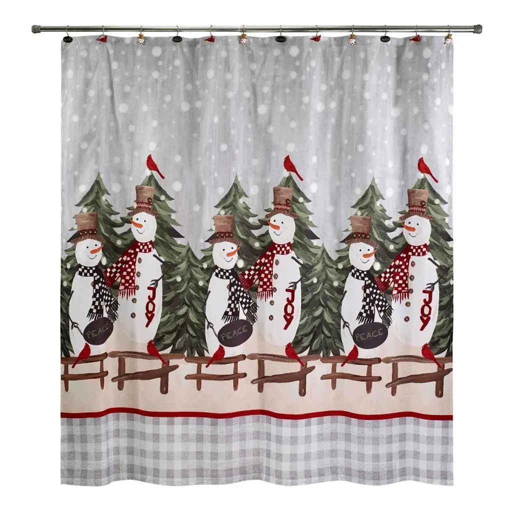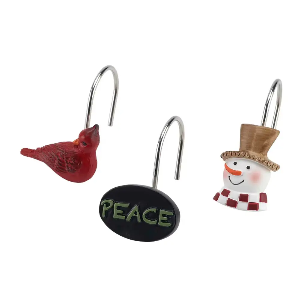 The Avanti Country Friends 13 Pc. Shower Curtain & Hook Set features a curtain with 2 happy snowmen in their black and burgundy checked scarves among many winter icons on a light grey background. Printed on 100% polyester, 72" x 72". Set of 12 hand-painted, resin hooks-4 of each of 3 designs.
