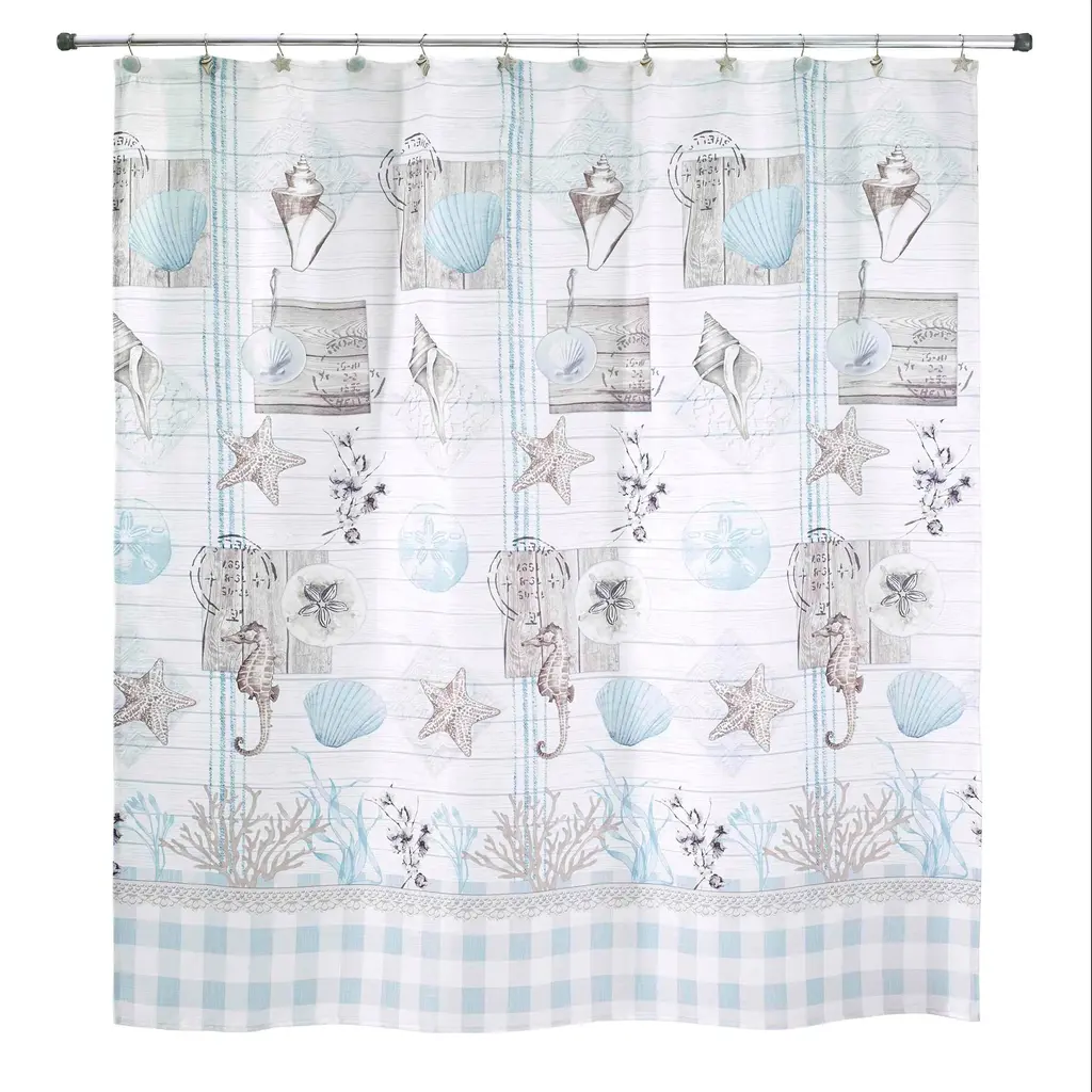 The Avanti Farmhouse Shell 13-Pc Shower Curtain & Hook Set features a printed curtain with shells, starfish, seahorses, coral in aqua and beige on an off-white, textured shiplap ground. Hook set made up of conch shell and sand dollar. Includes a 72" x 72" 100% polyester curtain, 12 resin hooks.