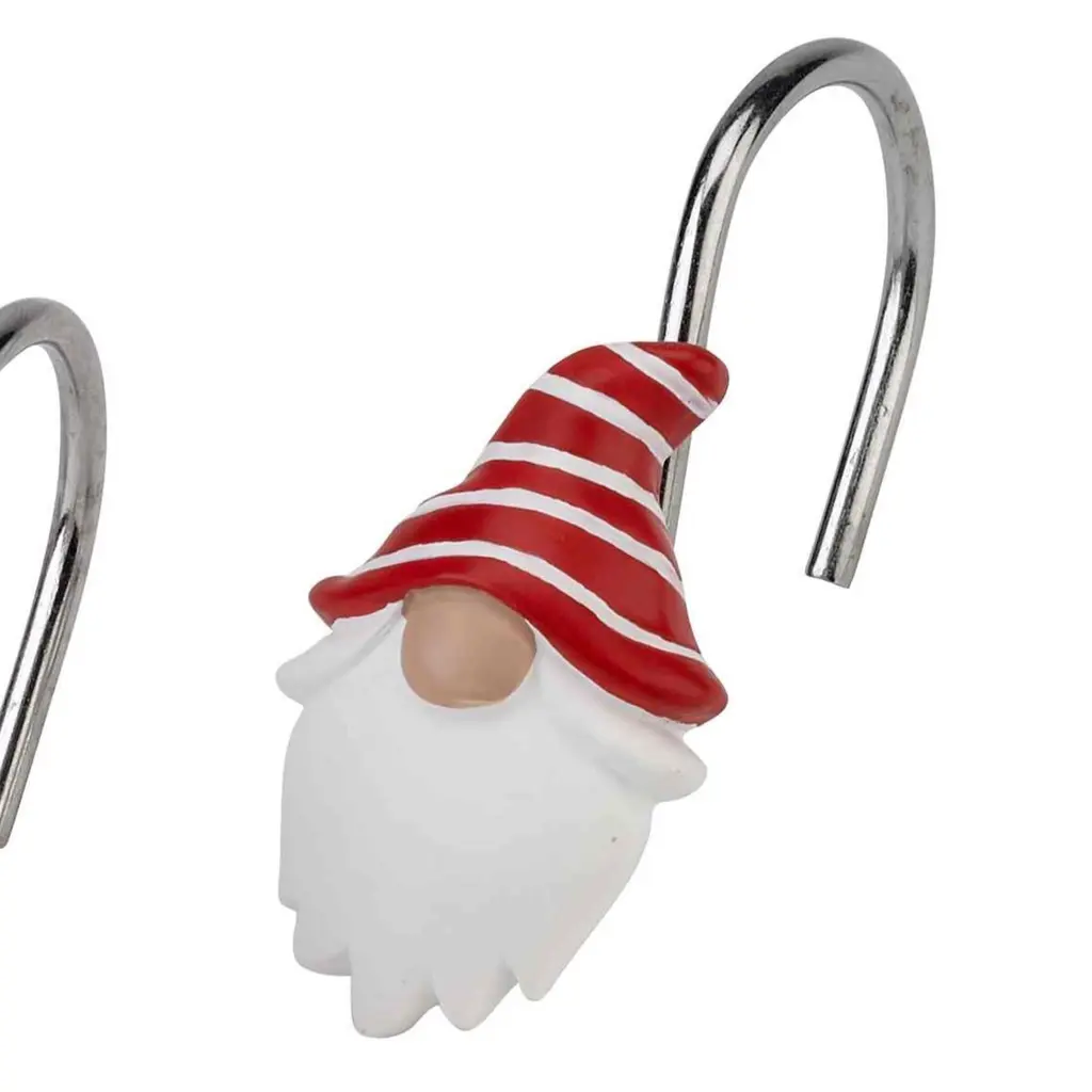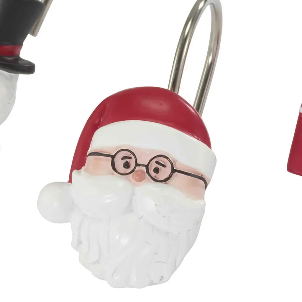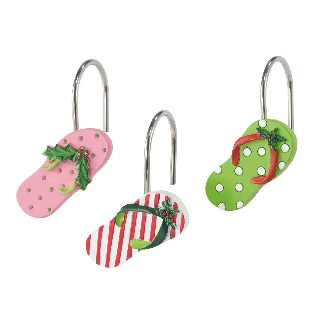 The Avanti Flamingo Jingle Shower Curtain Hook Set features 3 festively decorated flip flops in shades of red and green with holiday accents. Made of durable hand painted resin for long life and easy care. Set includes 12 hooks, 4 of each of the three designs.