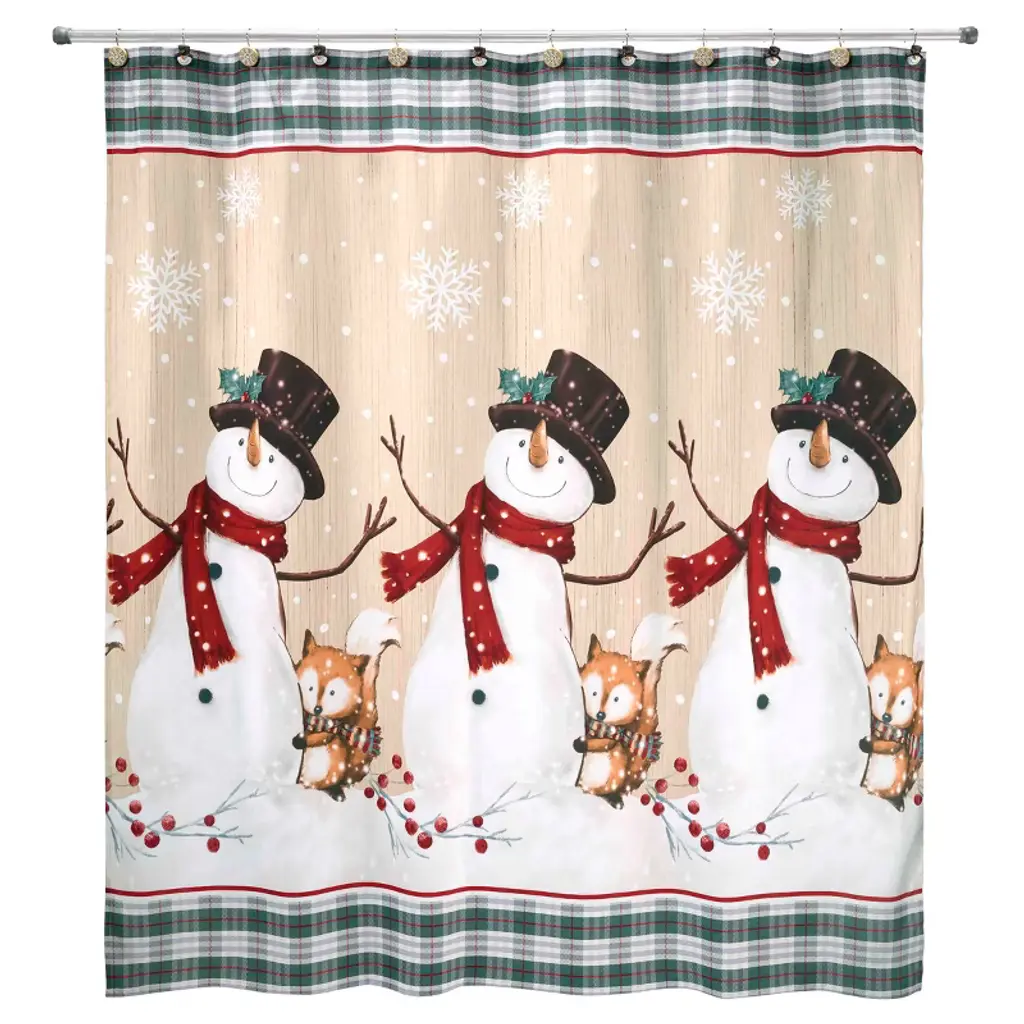 The Avanti Friends Gather 13 Pc Shower Curtain & Hook Set features a 72" x 72" polyester printed curtain decorated with 3 scarved snowmen and red foxes. The background is a faux beige woodgrain with green plaid borders. The 12 hand-painted resin hooks include 6 each of the snowman and snowflake.