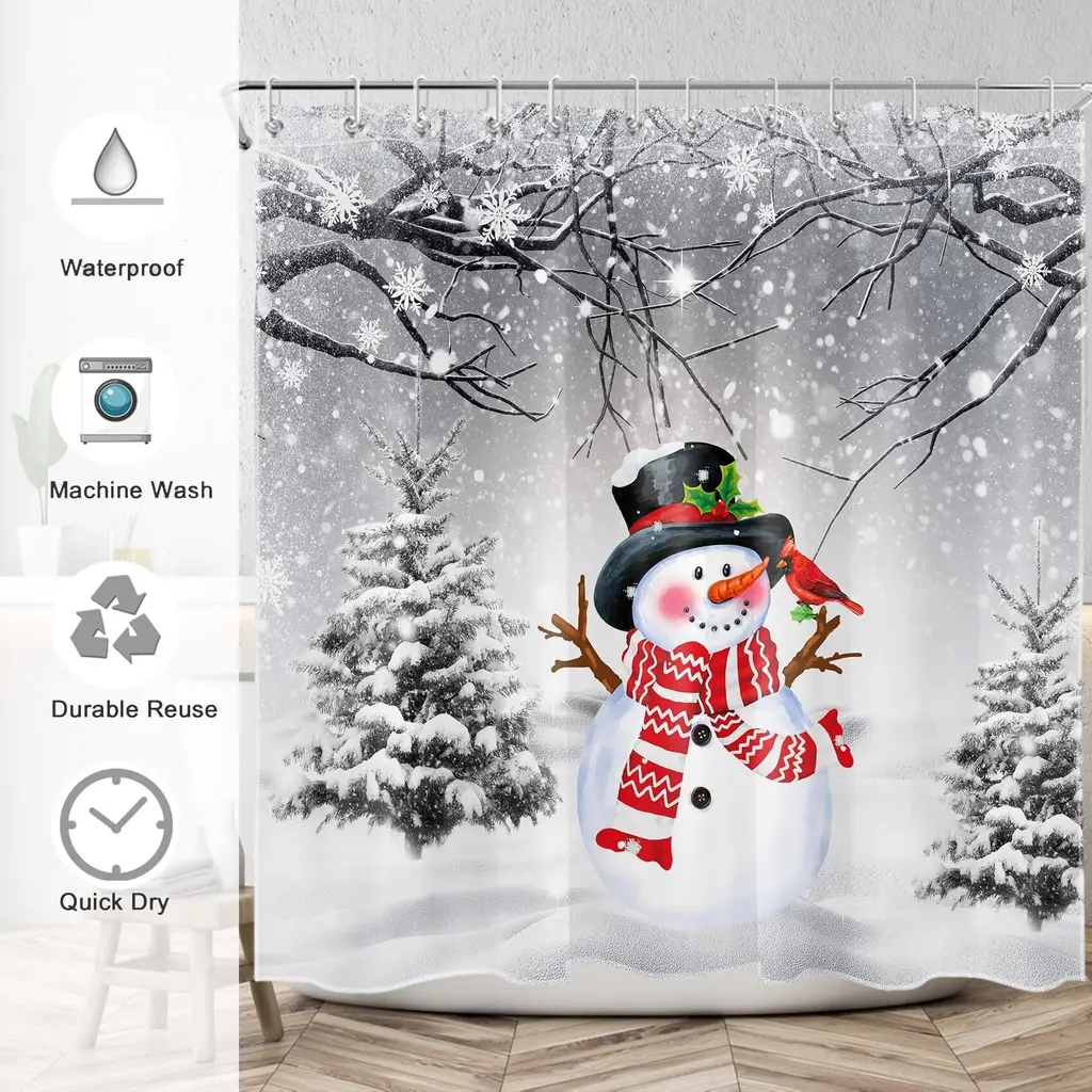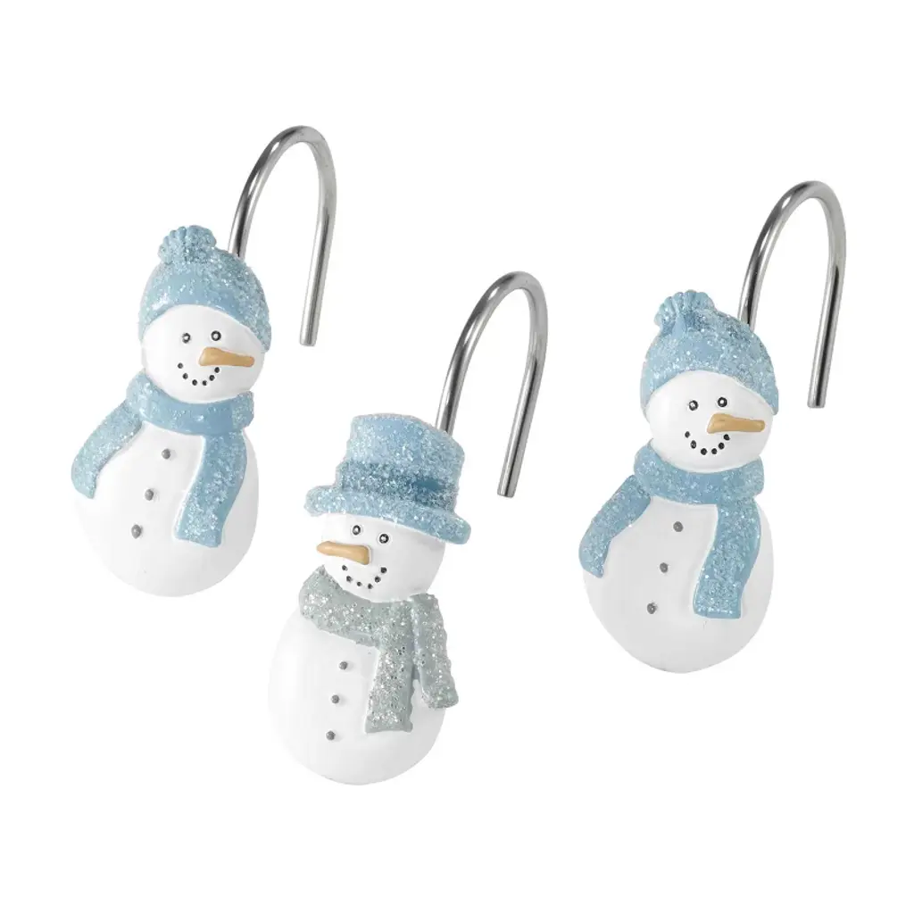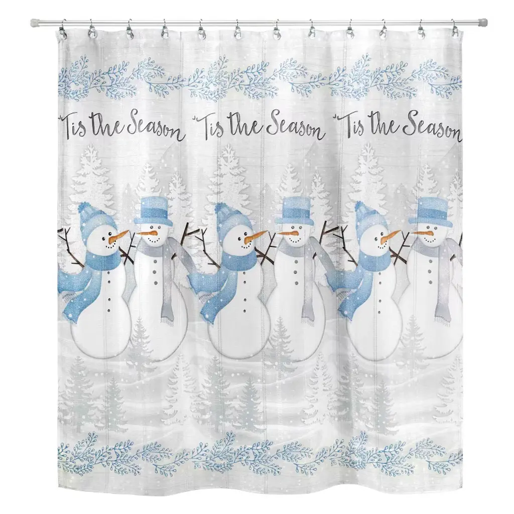 The Avanti Frosty Friends 13-Pc. Shower Curtain & Hook Set features a curtain with a beautifully printed winter scene with pairs of snowmen, pine trees and "'Tis the Season" on an off-white ground. 100% polyester, 72" x 72". Set of 12 hooks: 2 designs, 6 of each, made in hand-painted resin.