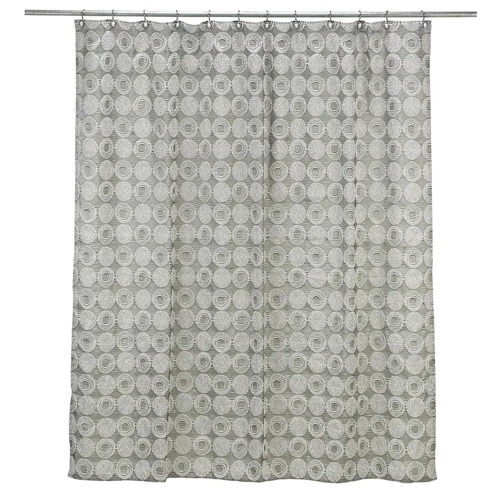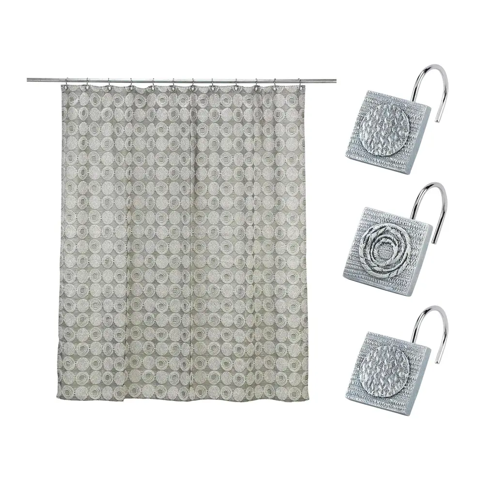 The Avanti Galaxy Silver 13-Pc Shower Curtain & Hook Set features a curtain with rows of irregular, textured grey circles on a shimmering silver cloth. The shower hooks mirror the fabric design in grey and silver hand painted resin. 100% polyester, 72" x 72" curtain, 12 resin hooks, 6 of each style.
