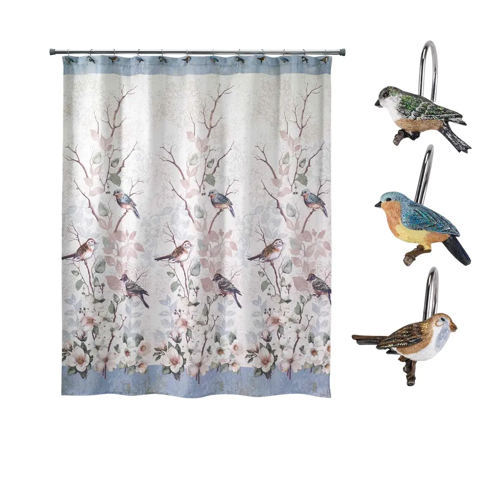 The Avanti Love Nest 13-Pc Shower Curtain & Hook Set features a printed shower curtain with beautifully rendered birds sitting on branches on an ivory ground. The hooks feature 3 different birds made of hand-painted resin. Includes 1 72" x 72" 100% polyester curtain and 12 hooks, 4 of each design.