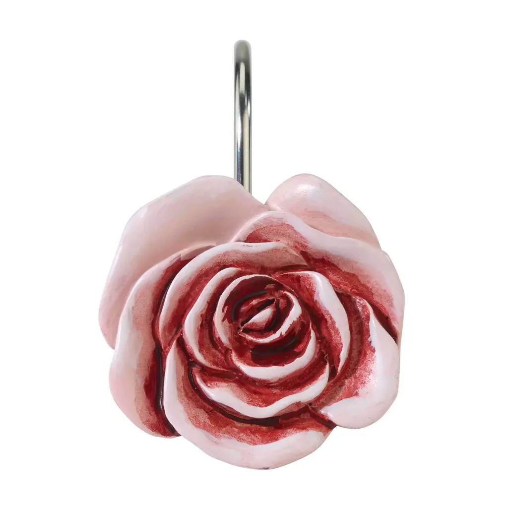 The Avanti Spring Garden Collection Shower Curtain Hook Set features 3 different colored peonies in shades of pink and white. Made of durable hand-painted resin and coordinates perfectly with the matching shower curtain, accessories, towels and rug. Set of 12, 4 of each design.