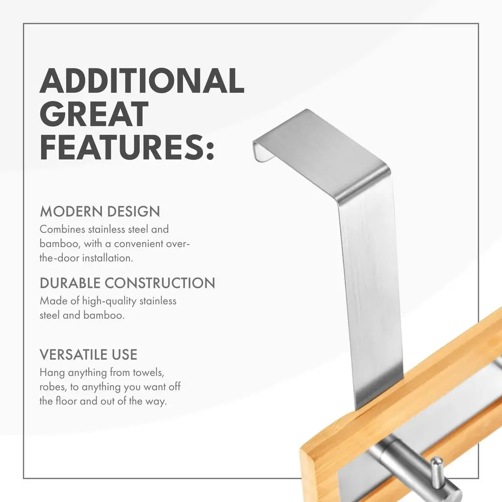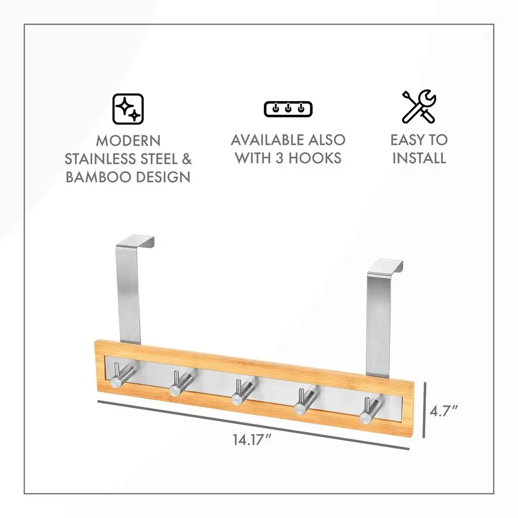 ToiletTree Products Stainless Steel and Bamboo Over-the-Door Hooks - 5 HookStay organized and elevate the style of your home with the ToiletTree Products Stainless Steel and Bamboo Over-the-Door Hooks. This modern, versatile organizer is an excellent solution for keeping your bathroom tidy, but its functionality extends far beyond just the bathroom. Crafted from a beautiful combination of bamboo and stainless steel, this 5-hook over-the-door rack effortlessly blends with any room’s décor, providing both utility and sophistication.Efficient Organization for Every RoomThe ToiletTree Products Over-the-Door Hooks are perfect for hanging towels, bathrobes, pajamas, and more. The five sturdy hooks allow you to keep your clothes and other items off the floor and organized. No longer will your towels be scattered or left on the floor to dampen and create clutter. Simply hang them on this sleek rack, and they’ll be neatly stored, ready to dry quickly and efficiently. The smooth bamboo design combined with stainless steel ensures that this organizer will remain strong and stylish for years to come.Ideal for Bathrooms, Closets, and MoreThis 5-hook hanging rack is designed to be placed over your door, providing a space-saving solution in any room. It works wonderfully in your bathroom, where you can keep towels and bathrobes easily accessible without taking up valuable counter space. The rack is also ideal for laundry rooms, where it serves as a convenient place to hang clothes to dry, sort laundry, or even store items that need mending. In your closet, it can hold purses, belts, scarves, and other accessories, keeping them organized and within easy reach.Multipurpose and Sturdy DesignThe ToiletTree Products Over-the-Door Hooks are incredibly versatile. In addition to its use in the bathroom, you can place it in your entryway, utility room, or bedroom. It’s perfect for hanging coats, hats, umbrellas, and other outdoor gear when you need additional space in your entry closet. Whether you're looking to declutter your home or simply need an extra spot to hang your belongings, this hanging rack is a dependable and functional solution.Its sturdy construction ensures that it will safely and securely hold all of your items, providing the reliability you need. With its dimensions of 4.7"H x 14.1"W x 3.5"D, this 5-hook organizer is designed to fit comfortably over most doors without taking up too much space. It’s the ideal size for a variety of needs throughout your home, and it’s not limited to the bathroom or laundry room.A Clean and Modern Look for Your HomeThe bamboo and stainless steel design is sleek and contemporary, making it a perfect addition to any décor. Whether your style is modern, rustic, or traditional, this over-the-door organizer will fit right in. It’s designed to be both functional and stylish, enhancing the look of your home while helping you stay organized.Perfect for a Variety of UsesThis over-the-door hook rack is perfect for organizing more than just bathroom essentials. Use it in your laundry room to hang freshly washed clothes, in your utility room for drying clothes, or in your front entryway to store your outerwear. You can even place it in your bedroom or closet for accessories or to hang out-of-season clothing.Available in a 3-Hook VersionFor those with more limited space or fewer items to store, the ToiletTree Products Over-the-Door Hooks are also available in a 3-hook version. Whether you need the larger 5-hook version or the more compact 3-hook option, there’s a size that will suit your needs perfectly.