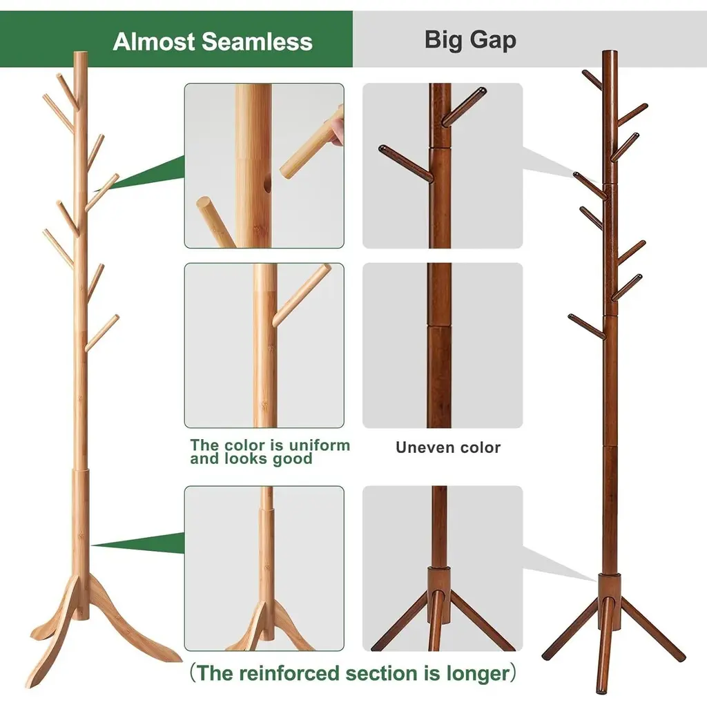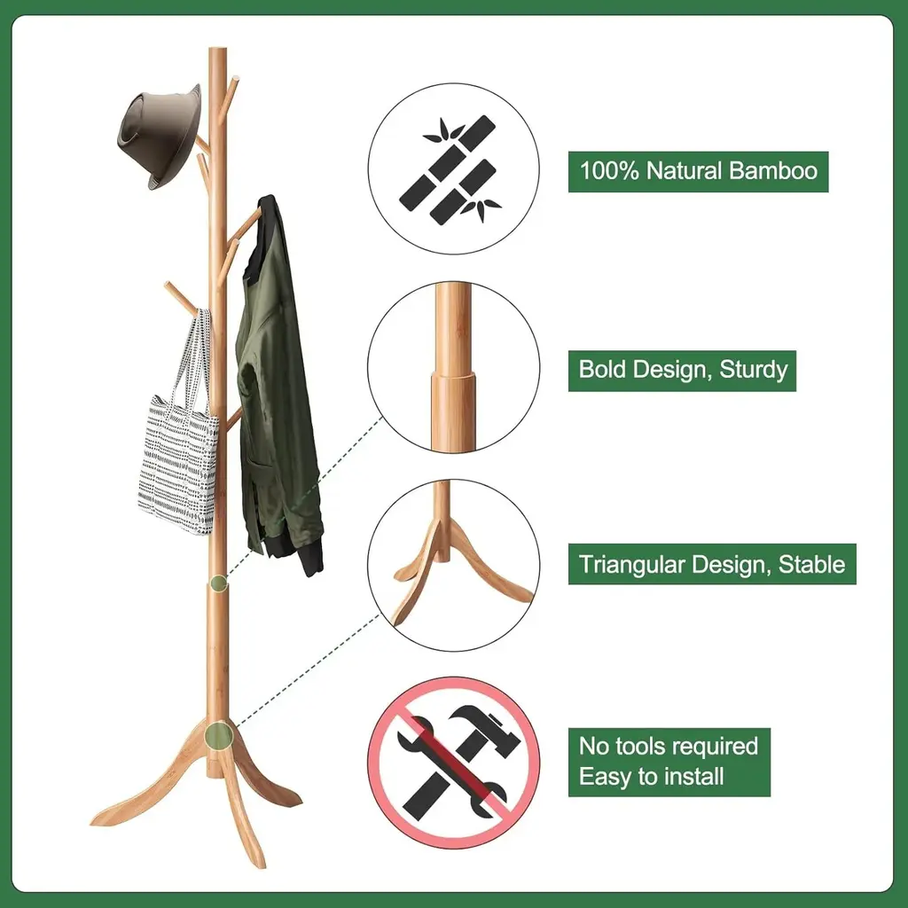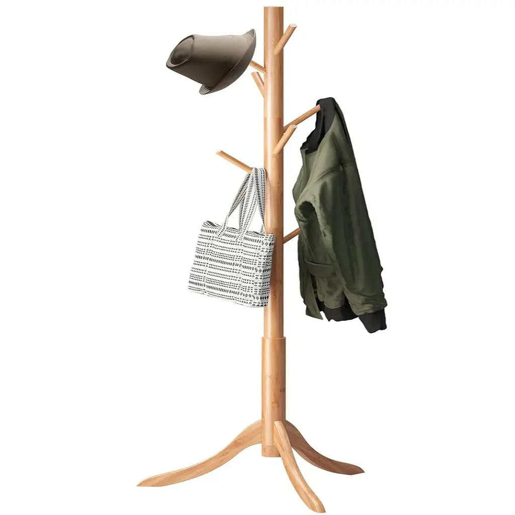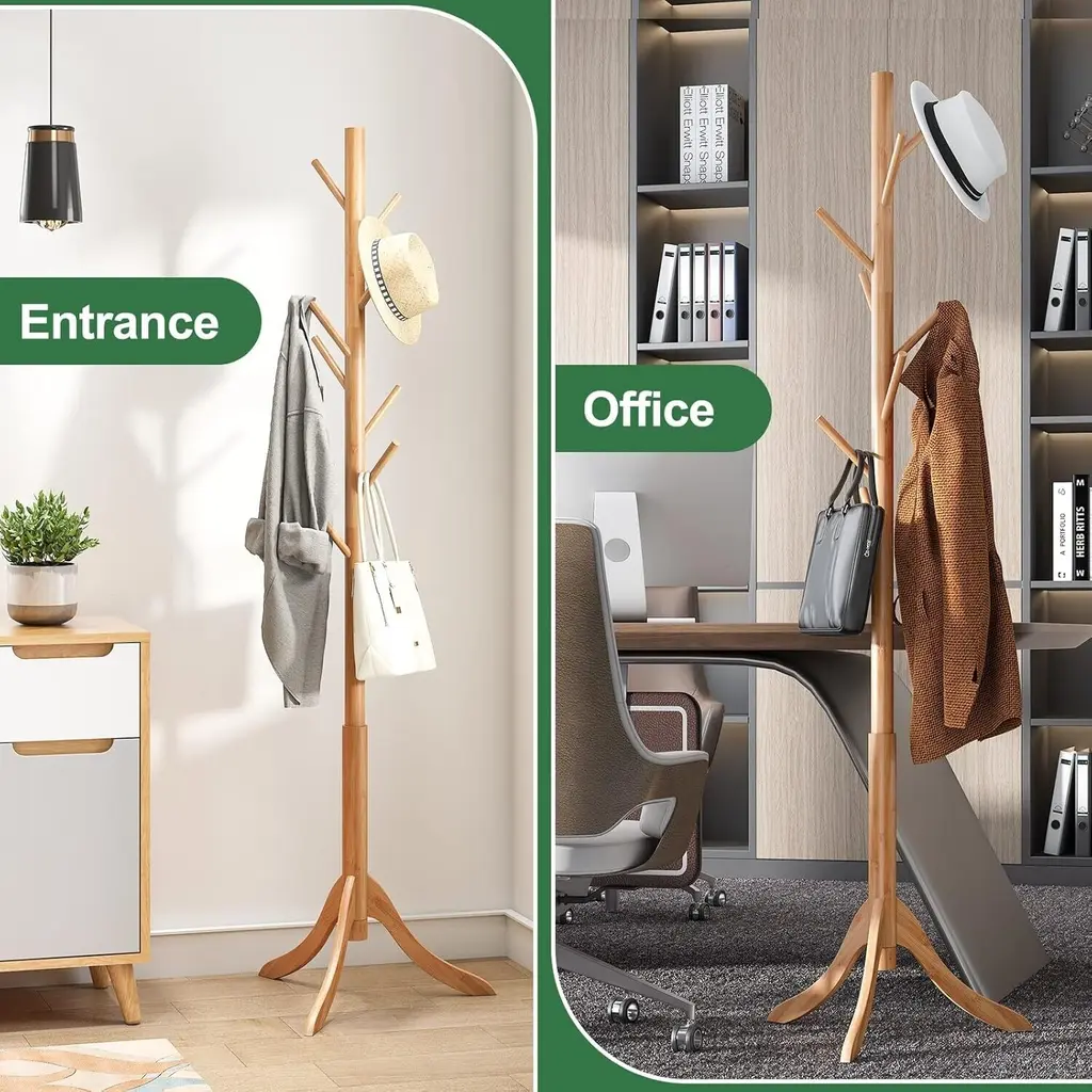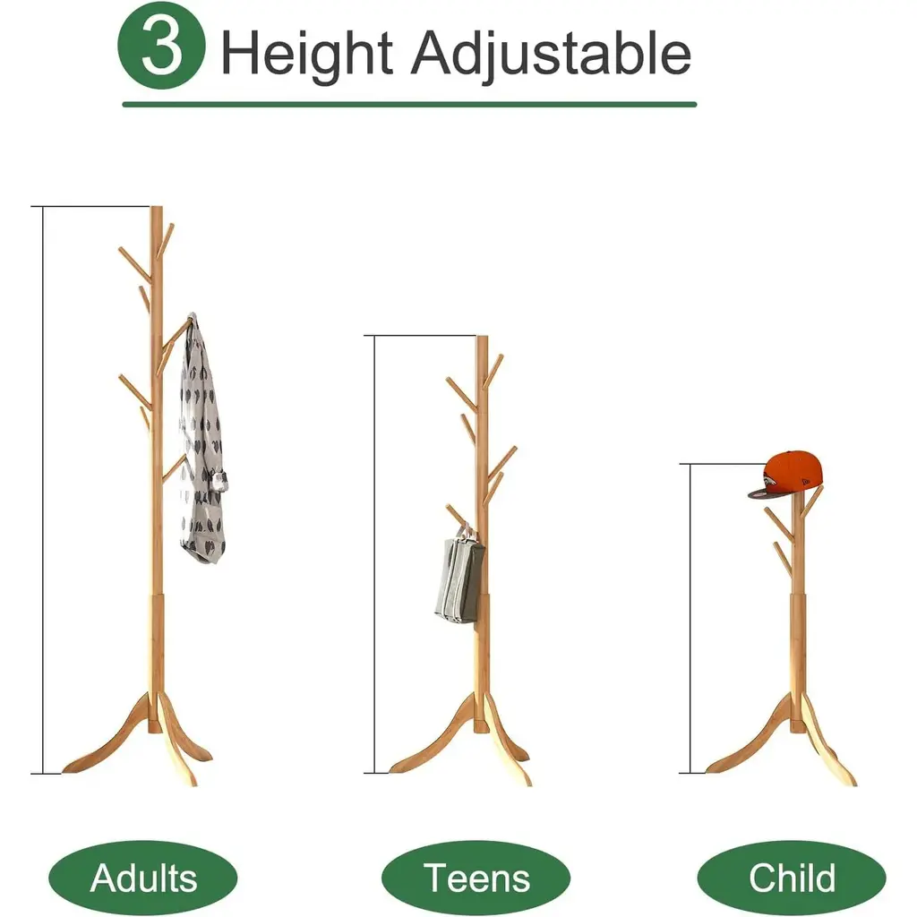 【ADJUSTABLE SIZES】- Assemble the coat rack according to the height you need; use 1 sections for a toddler-sized rack, 2 sections for a kid’s sized rack, or use all 3 for a standard, adult sized rack. 【HEAVY DUTY CONSTRUCTION】 - Super Durable - Made of 1.5 inch thick, high-quality lacquered rubberwood screw-on pieces and 3 prong legs for stability that supports multiple heavy garments and outerwea. 【SPACE SAVING 】- This coat rack takes up minimal space in foyers, living rooms, office work space, doctors' offices and keeps coats and accessories out of cramped closets and easily accessible with hooks all around the rack. 【EASY TO ASSEMBLE】 - No Tools Required - Assemble the coat rack in just a few quick steps. No tools are required, and a clear assembly instruction manual walks users clearly through the entire process. 【MULTIPURPOSE】 - Clothing and Accessories - 6 sturdy, convenient hooks allow you to hang several clothing items such as coats, jackets, and cardigans along with accessories like scarves, hats, handbags, briefcases, laptop bags, and umbrellas. Adjustable sizes, Assemble the coat rack according to the height you need. Use 1 sections for a toddler-sized rack. 2 sections for a kid’s sized rack. Use all 3 for a standard, adult sized rack. Super Durable - Made of 1.5 inch thick, high-quality lacquered rubberwood screw-on pieces and 3 prong legs.