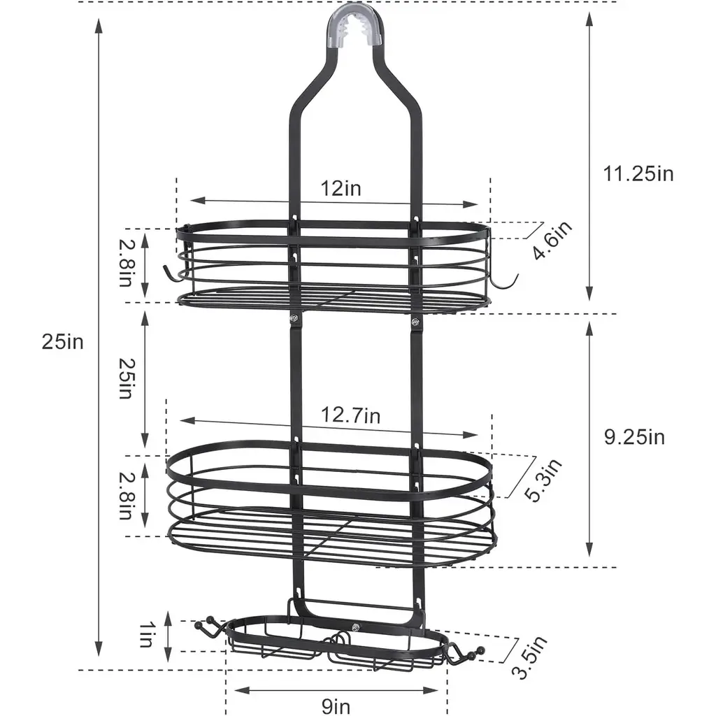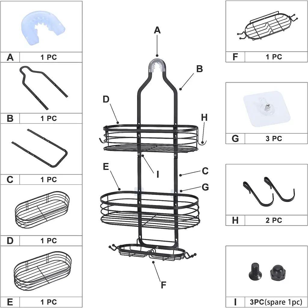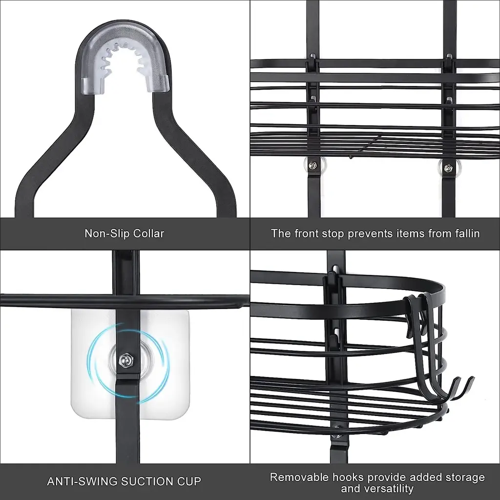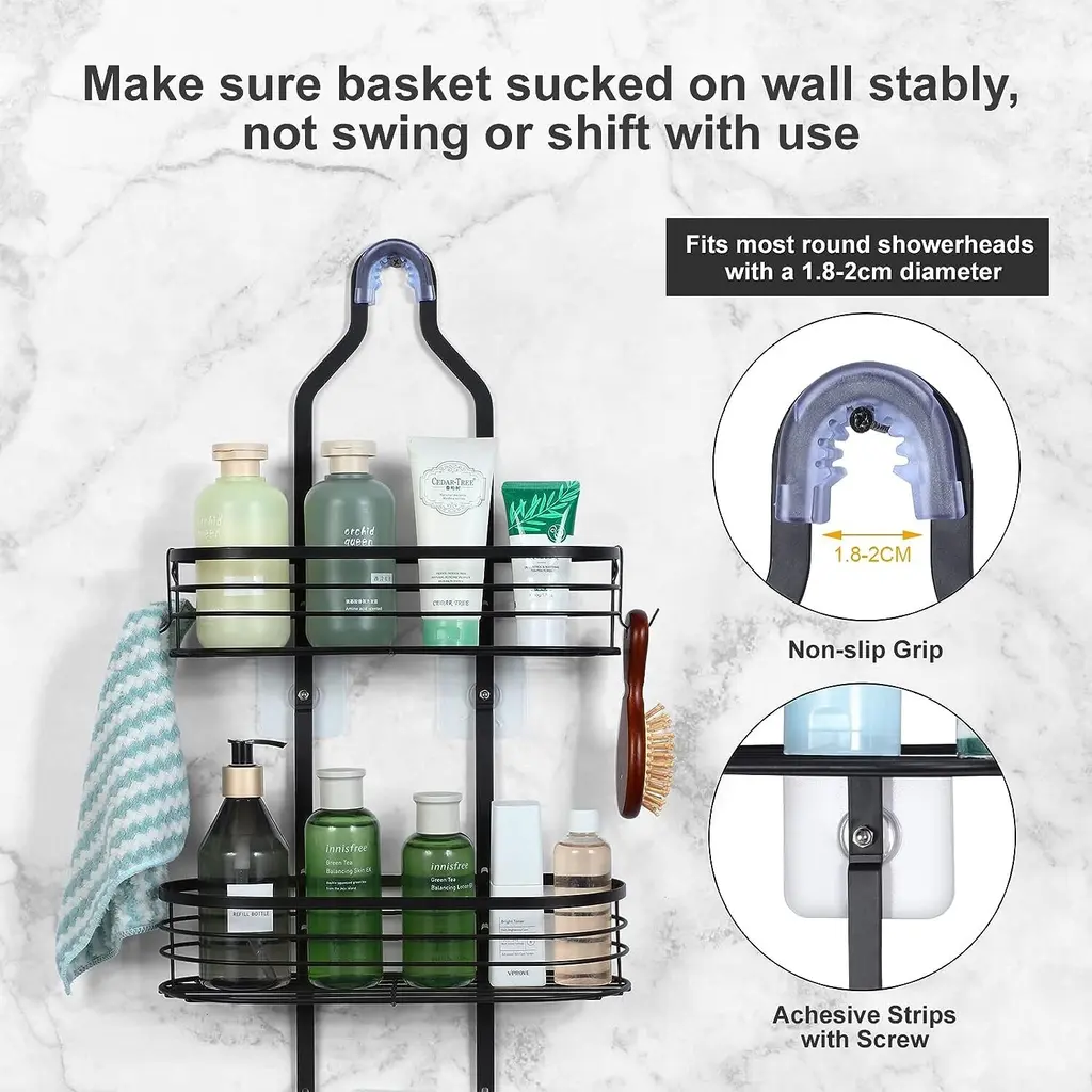【Shower Caddy Hanging】Large-capacity shower rack. Layered design, there are two layers on the top, you can put all kinds of shower gels, shampoos, etc,and there is a soap holder on the bottom layer, you can put soap boxes, and hooks for razors, bath balls and towels. 【With Hook and Soap Holder】: The double design of the hook is used to hang our shaver, bath sponge and brush, which is more convenient. The shower organizer comes with a built-in soap holder, so you don't need to buy it extra. Open-vented design for fast draining- The hollow and open bottom allows water to dry quickly, making it easy to keep bathroom items clean. 【Suction cup fixed】The shower caddy over the door has suction cups and screws to hold it in place , so you can secure it from the back, the suction cups hold it tightly to the shower wall, it won't slide on the glass door, we don't need to worry about it when we use it Shake and cause confusion. 【Sturdy, Rust-proof and Easy to Assemble】: Our hanging shower is easy to install on any standard shower head, just push the suction cup to the wall to install, no installation or hardware required, it can also be installed on the wall with drilled screws , which can be installed in just a few minutes. Made of solid metal with metal coating, the overall structure is stable and strong, durable and rust-free.