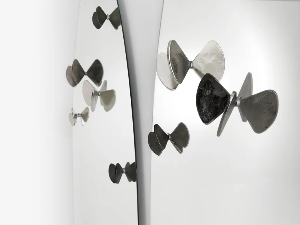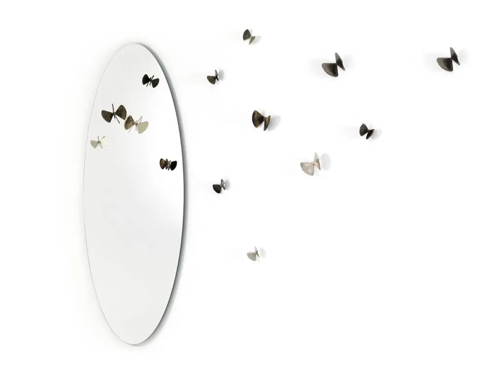 "Bice is a set of 6 wall hanging butterflies in brass casting designed by Roberto Mora for the brand Mogg, with two different sizes. The butterflies are available in copper or nickel finish.Bice is a coat hanger delightfully playful: stylized butterflies come into your home in copper finish or, for the nickel version, in a mix of different metallic tones: 2 butterflies polished finish, 2 black nickel plated butterflies and 2 oxidized butterflies. To this, adding a cool aesthetic to a feminine touch. The butterflies have two different sizes and can be organized freely in the wall spaces".