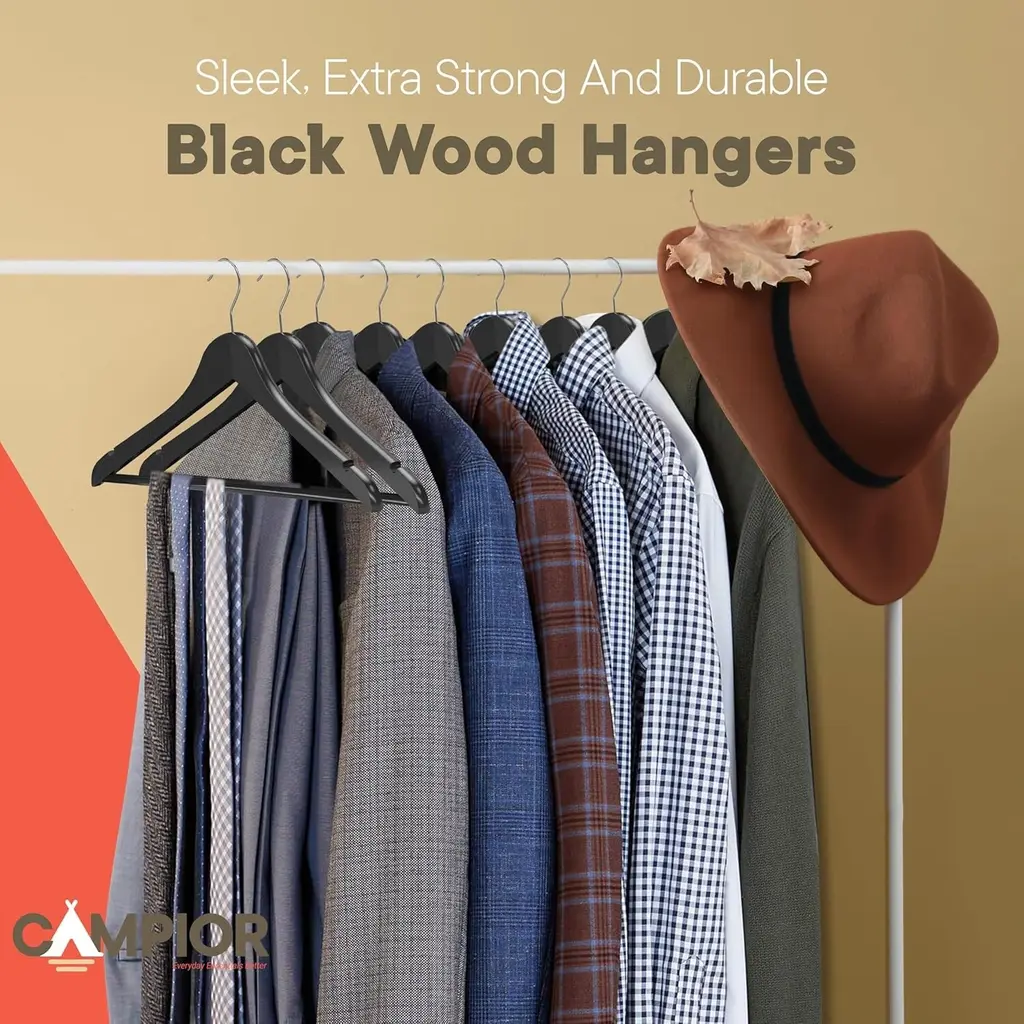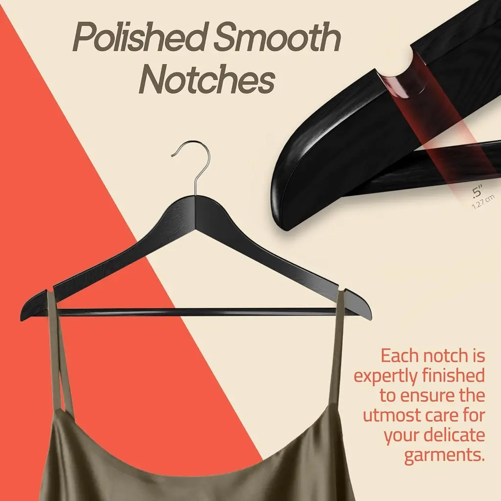 Upgrade your closet with these hangers , premium wooden hangers, designed to keep your clothes looking their best while maximizing space. Made from high-quality solid wood with a black grain finish, these hangers combine elegance with durability, offering reliable support for everything from lightweight blouses to heavy coats and suits. The contoured shoulder design preserves the shape of your garments, preventing awkward bumps and ensuring your jackets, shirts, and dresses stay in perfect condition. For added convenience, these clothes hangers feature precisely cut notches on each side, securely holding camisoles, dresses, and other strappy clothing without slipping. The sturdy non-slip pants bar allows for effortless hanging of trousers, jeans, and skirts, keeping them wrinkle-free and neatly stored. Finished with a smooth, splinter-free coating, these hangers are gentle on delicate fabrics, preventing snags and damage. Designed for easy access, the 360° swivel chrome hook lets you hang and retrieve clothing from any angle, making organization effortless. Despite their slim 0.47-inch profile, these wooden hangers are strong and space-saving, helping you keep your closet neat and clutter-free. Whether you're organizing everyday essentials or your finest wardrobe pieces, these hangers provide the perfect blend of style, function, and durability."