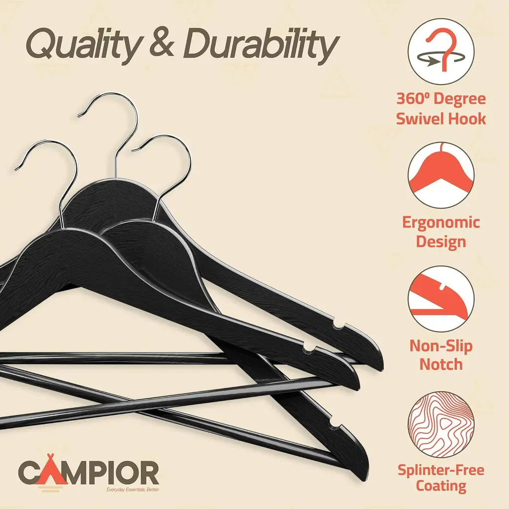Black Wooden Hangers – Heavy-Duty With 360° Swivel Hook, Non-Slip, Pants Bar & Shoulder Grooves - Wooden Hangers For Suits, - 50 Pack