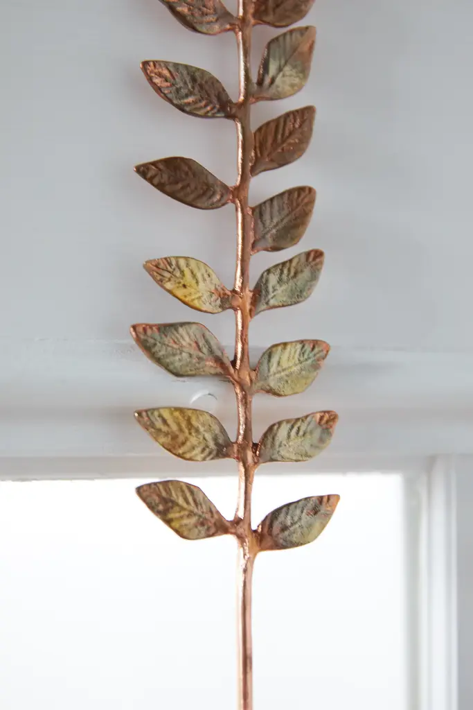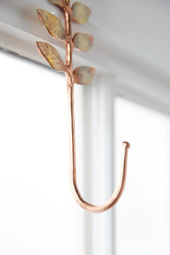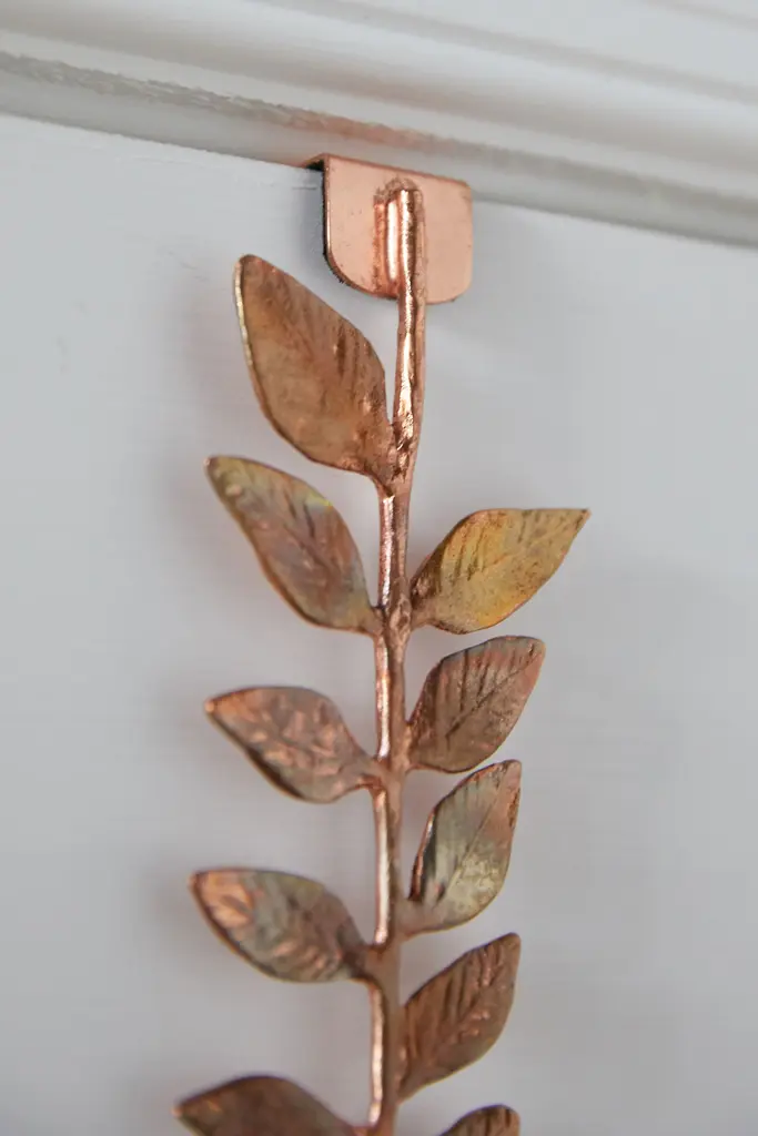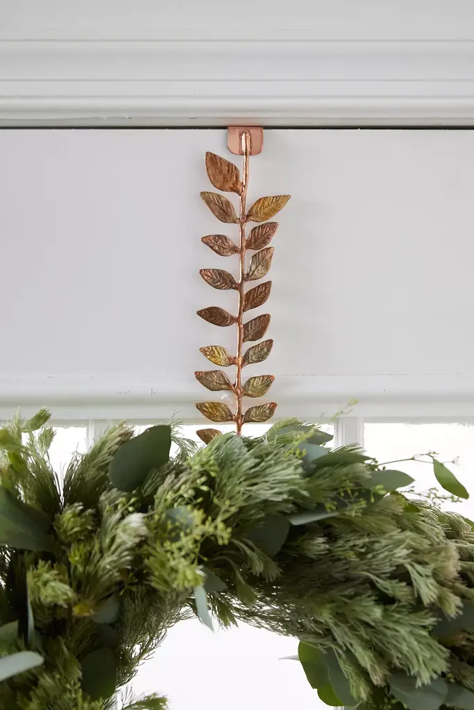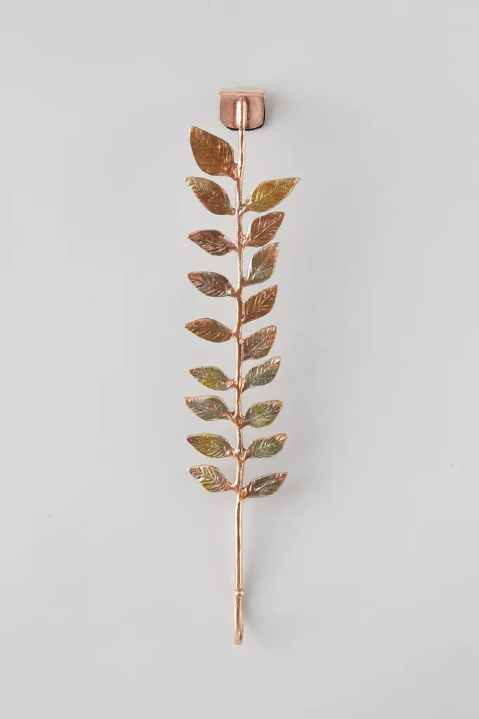 Crafted from brass for a natural finish, this durable wreath hanger takes the shape of a leaf.