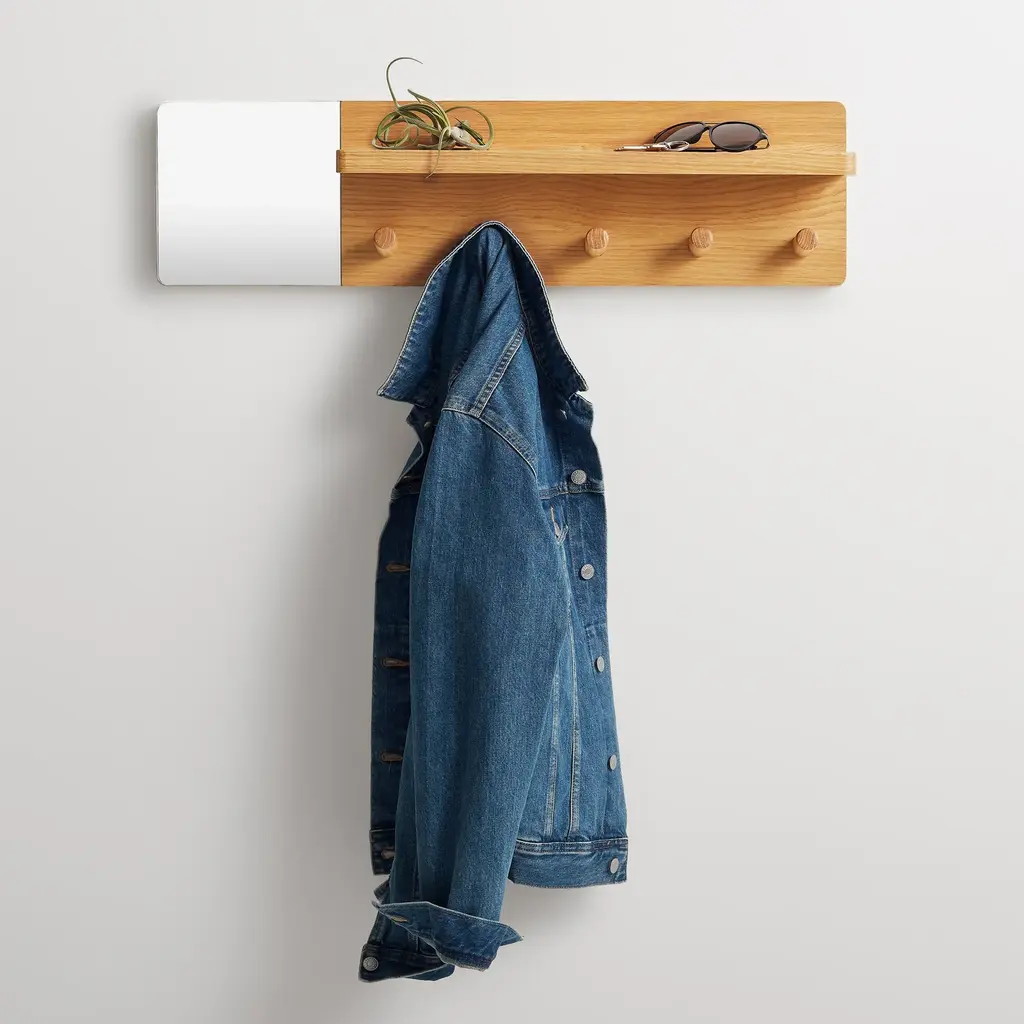 Keep your entryway ensemble looking cute. Simple wood pegs, a tidy shelf and a handy side mirror provide a straightforward space to hang your bags, toss your keys and check your pearly-whites.