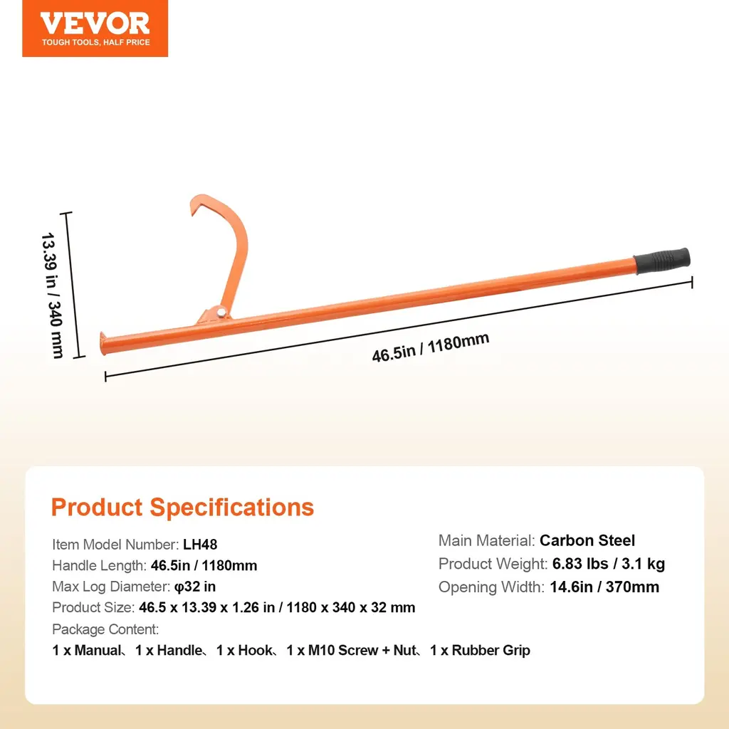 Log Lifter for Easy Handling: Our log jack uses leverage to effortlessly stack and transport wood, making it an essential tool for moving logs in forests, yards, and sawmills. Compatible with Various Log Sizes: The cant hook comes with adjustable iron hook that accommodates logs up to φ32" / φ15" / φ19" / φ25" / φ18", allowing for easy handling of different sizes. Ergonomic Handle: With handles measuring 46.5" / 48" / 59", covered in rubber grips, this log roller provides a comfortable and secure hold while lifting and dragging logs, reducing strain and preventing fatigue. Durable Material: Constructed from heavy-duty carbon steel with robust welds, this timberjack is designed for durability. The orange powder-coated surface protects against rust and corrosion, extending its lifespan. Easy Assembly and Use: Assembly this cant hook is straightforward with screws and nuts, requiring no additional power tools, making it simple for one person to set up. 46.5" handle, φ32" / φ18" Package Content 1 x Manual 1 x Handle 1 x Hook 1 x M10 Screw + Nut 1 x Rubber Grip (only for 46.5" handle, φ32" option) 46.5"handle, φ15" Package Content 1 x User Manual 1 x Pipe 1 1 x Pipe 2 1 x Hook 1 x Flat Iron 2 x T-Shaped Legs 7 x M10 Screws and Nuts 48" handle, φ15" Package Content 1 x User Manual 1 x Pipe 1 1 x Pipe 2 1 x Hook 1 x T-Shaped Leg 3 x M10 Screws and Nuts 1 x Pointed Nail and Nut 46.5'' handle, φ19" / 59" handle, φ32" Package Content 1x User Manual 1 x Handle 1 x Hook 1 x M10 Screw + Nut 2 x M8 Screws + Nuts 1 x Rubber Grip 46.5" handle, φ25" Package Content 1 x User Manual 1 x Claw 1 x Bar 1 x Handle 1 x Support Rod 1 x T-Shaped Leg 5 x Screws 5 x Nuts 46.5'' handle, φ15" Package Content 1 x User Manual 1 x Handle 1 x Hook 1 x T-Shaped Leg 3 x M10 Screws and Nuts