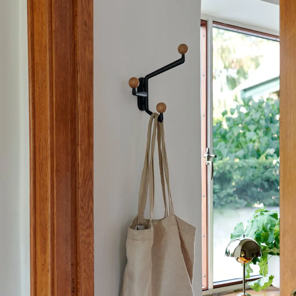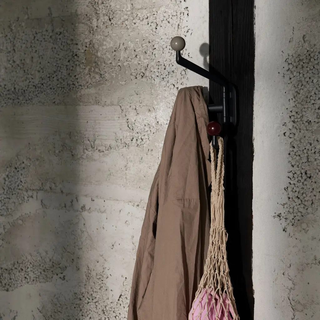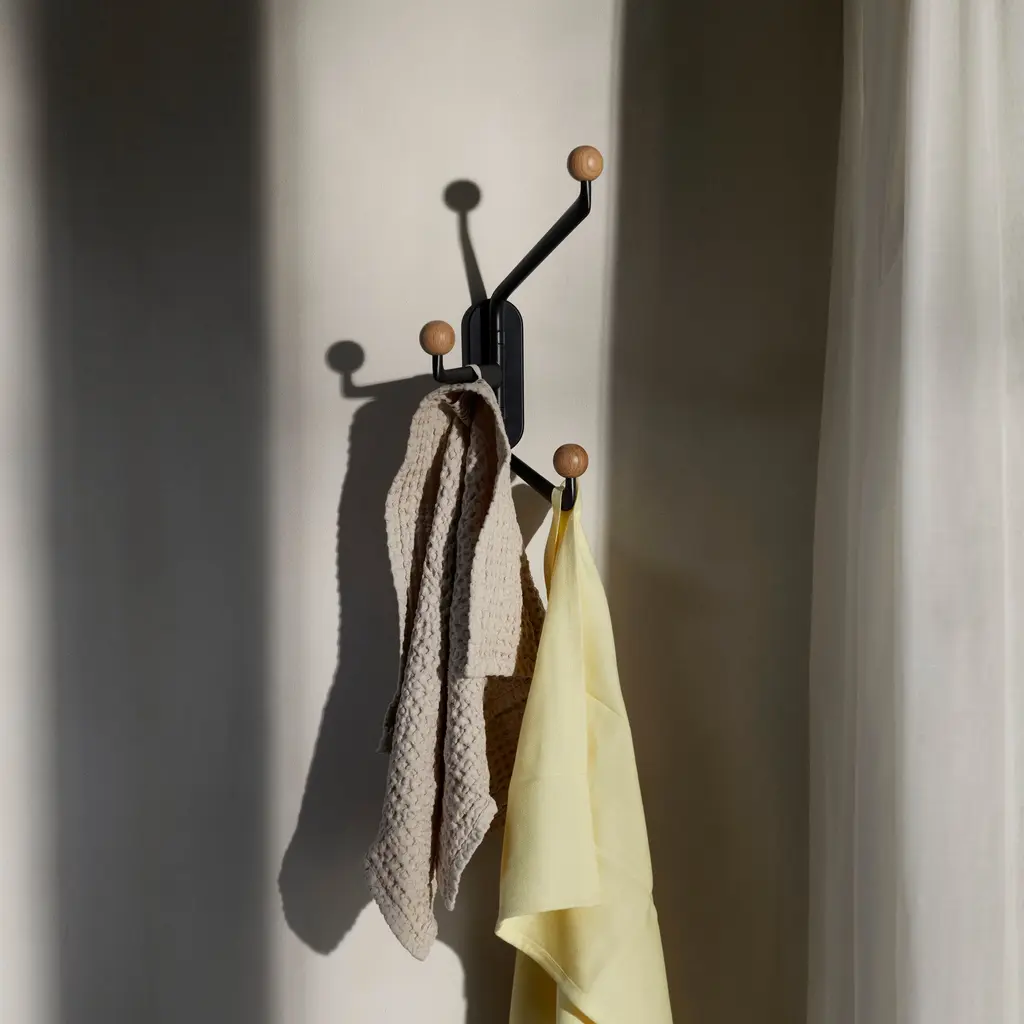 The Capture Hooks SC74 and SC75 provide practical hanging options for different areas. Each hook has three movable arms made from powder-coated aluminum, with knobs in lacquered oak or colored finishes. They are ideal for hanging towels, coats, or bags in bathrooms, kitchens, or entryways. Inspired by tree branches, their design is simple and lightweight, fitting seamlessly into both private and public spaces. Available in two sizes, SC74 (small) and SC75 (large), the hooks can be used individually, in groups, or paired with other items from the Capture series to maximize functionality.