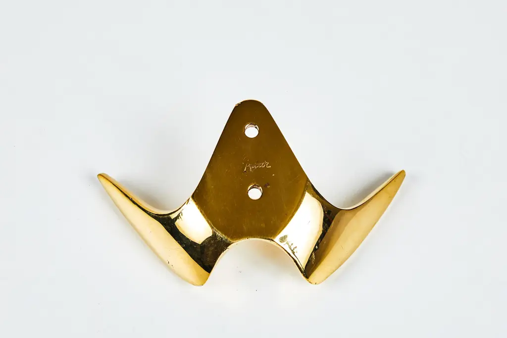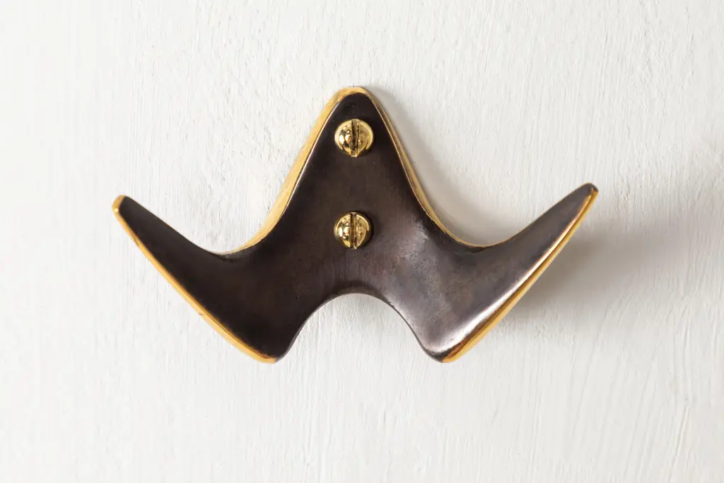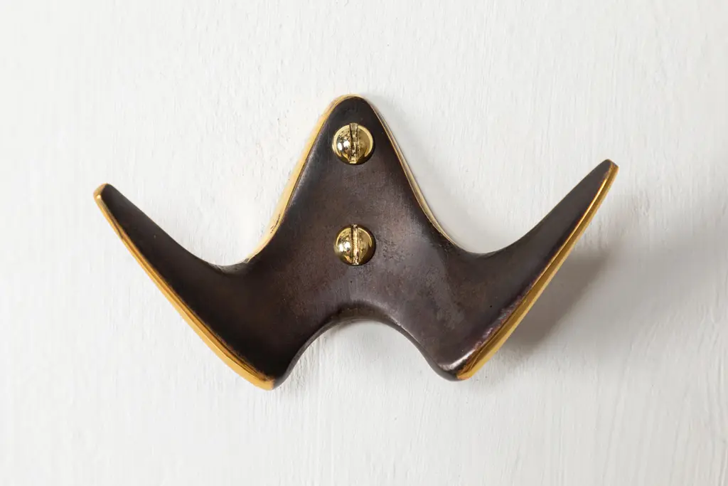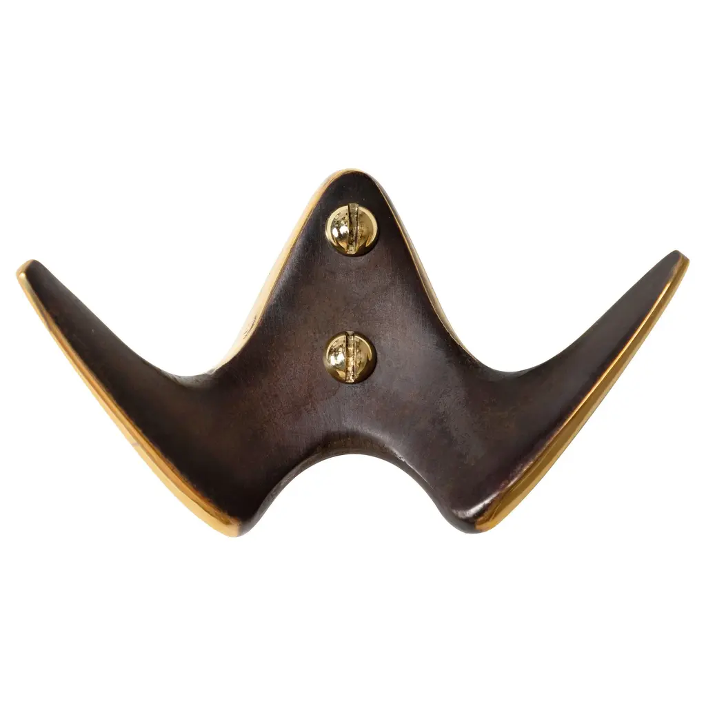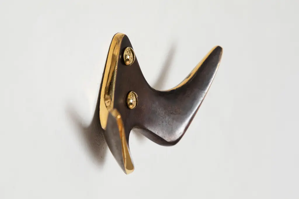 Carl Auböck brass #4995 patinated brass hook. Designed in the 1950s, this versatile and Minimalist Viennese candleholder is executed in polished and patinated brass by Werkstätte Carl Auböck, Austria. Price is per item. Available in unlimited quantities. Can take up to 8 weeks. Produced by Carl Auböck IV in the original Auböck workshop in the 7th district of Vienna using the same exacting standers, high-quality materials, original molds and techniques of his legendary namesake. Auböck's design career was long and varied, reaching its pinnacle of prestige at the Triennale di Milano in 1954, where he received four gold medals in recognition of his iconic work. Please note that only one representative example of each item is shown in the images. Finish varies from item to item due to the handmade nature of their fabrication and due to the unique chemical patination process, which is meant to simulate 80-100 years of exposure of brass to sunlight. Made to order.