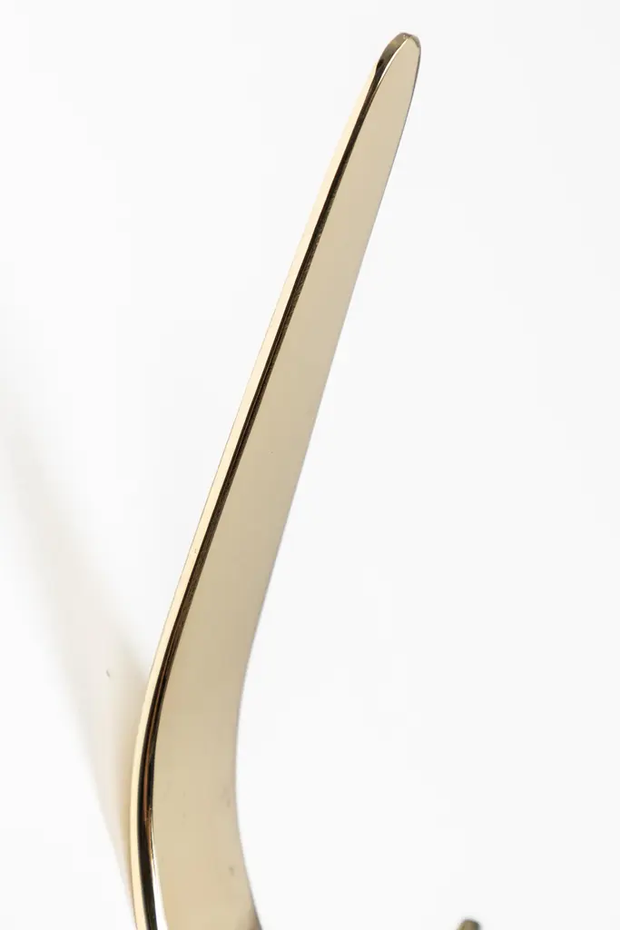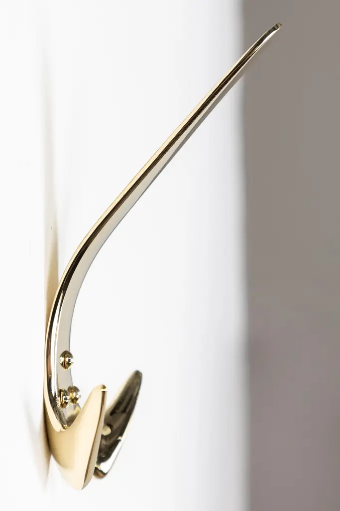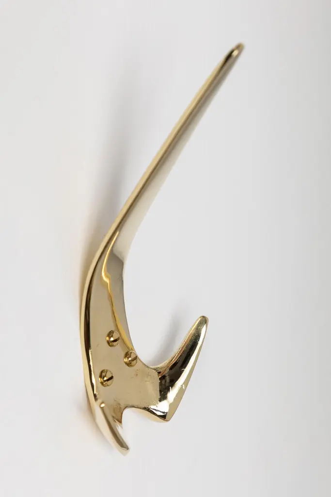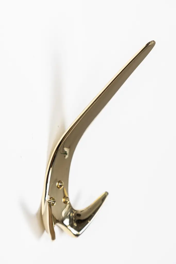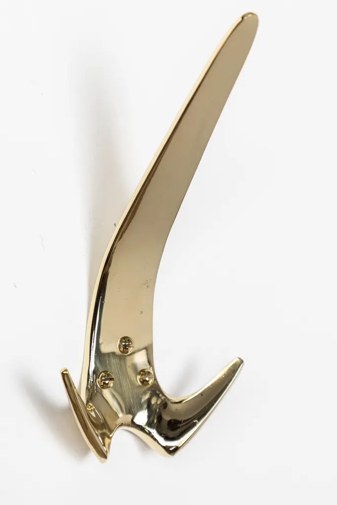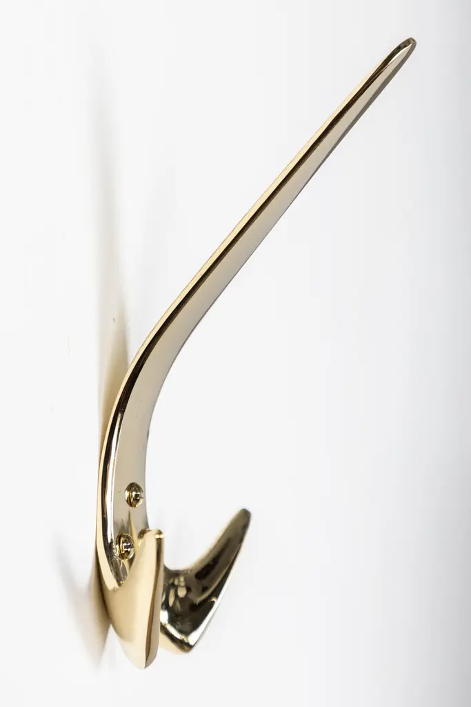 Carl Auböck brass #4056 brass hook. Designed in the 1950s, this versatile and Minimalist Viennese candleholder is executed in polished brass by Werkstätte Carl Auböck, Austria. Price is per item. Two in stock ready to ship. Available in unlimited quantities. Please note that in-stock availability is subject to change at any time. Allow additional 3-4 weeks for items not in stock. Can take up to 8 weeks.Produced by Carl Auböck IV in the original Auböck workshop in the 7th district of Vienna using the same exacting standards, high-quality materials, original molds and techniques of his legendary namesake. Auböck's design career was long and varied, reaching its pinnacle of prestige at the Triennale di Milano in 1954, where he received four gold medals in recognition of his iconic work.Please note that only one representative example of each item is shown in the images. Finish varies from item to item due to the handmade nature of their fabrication.