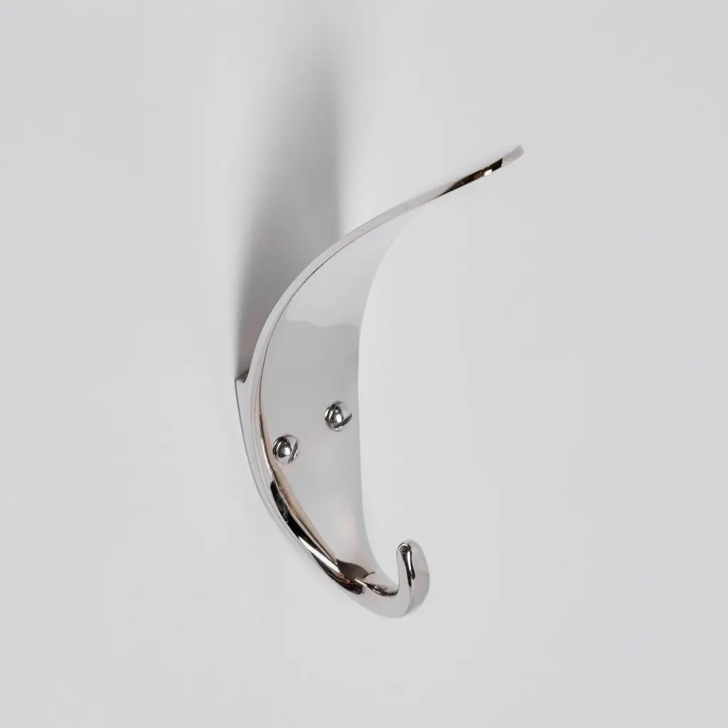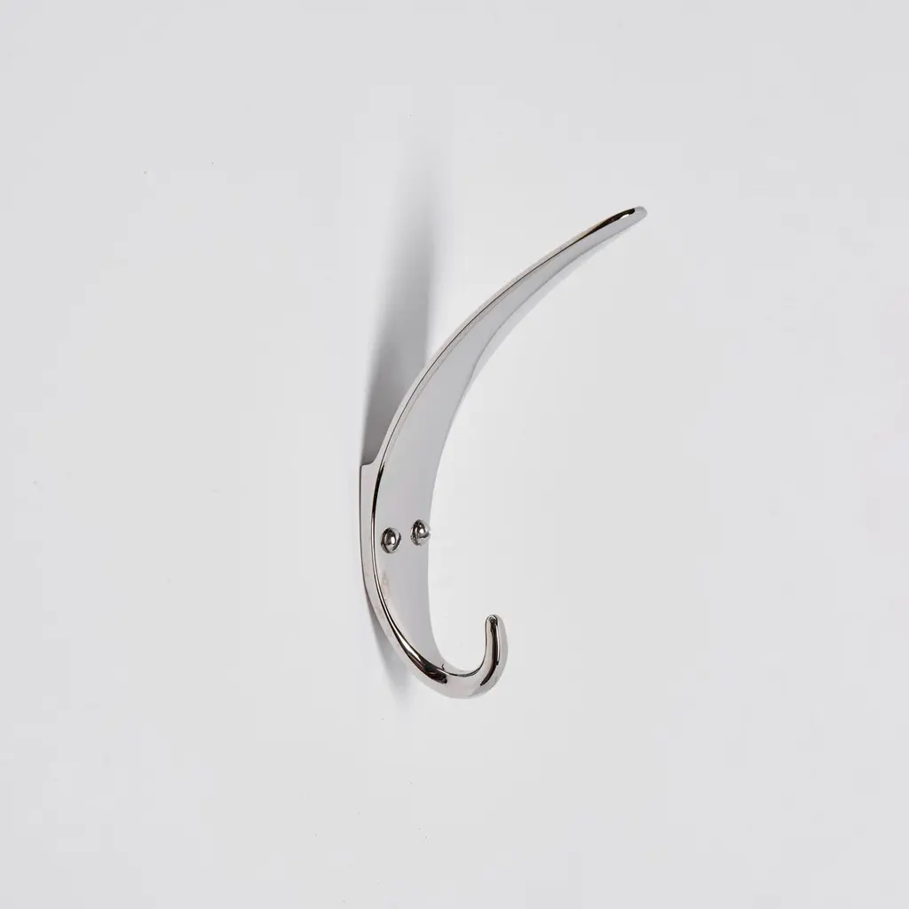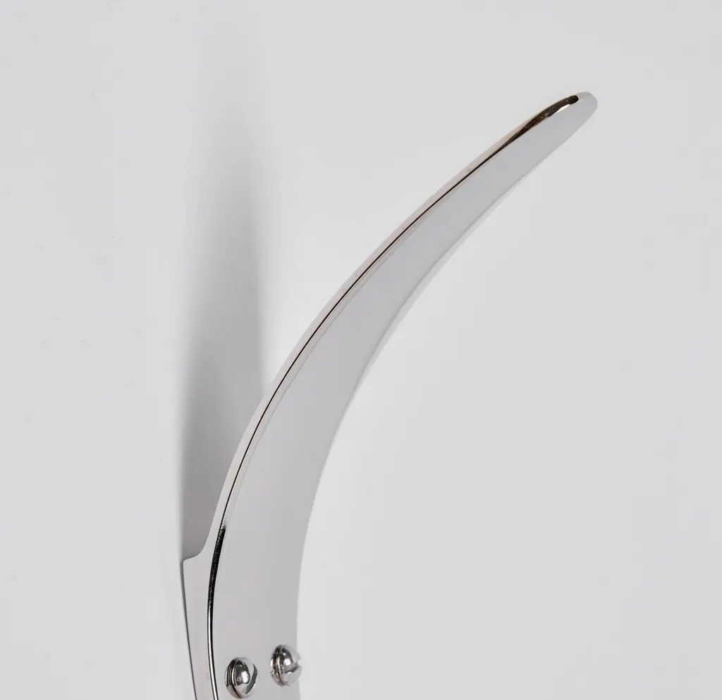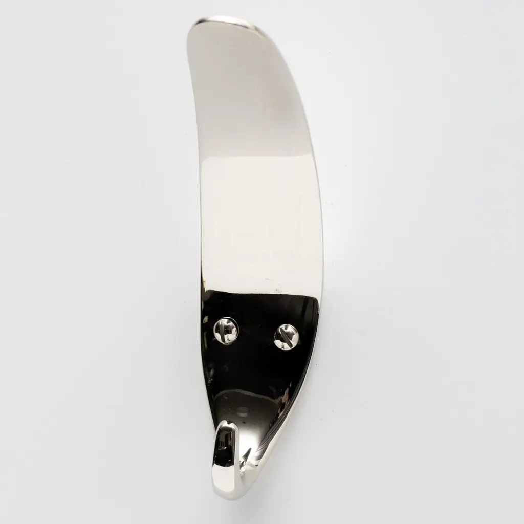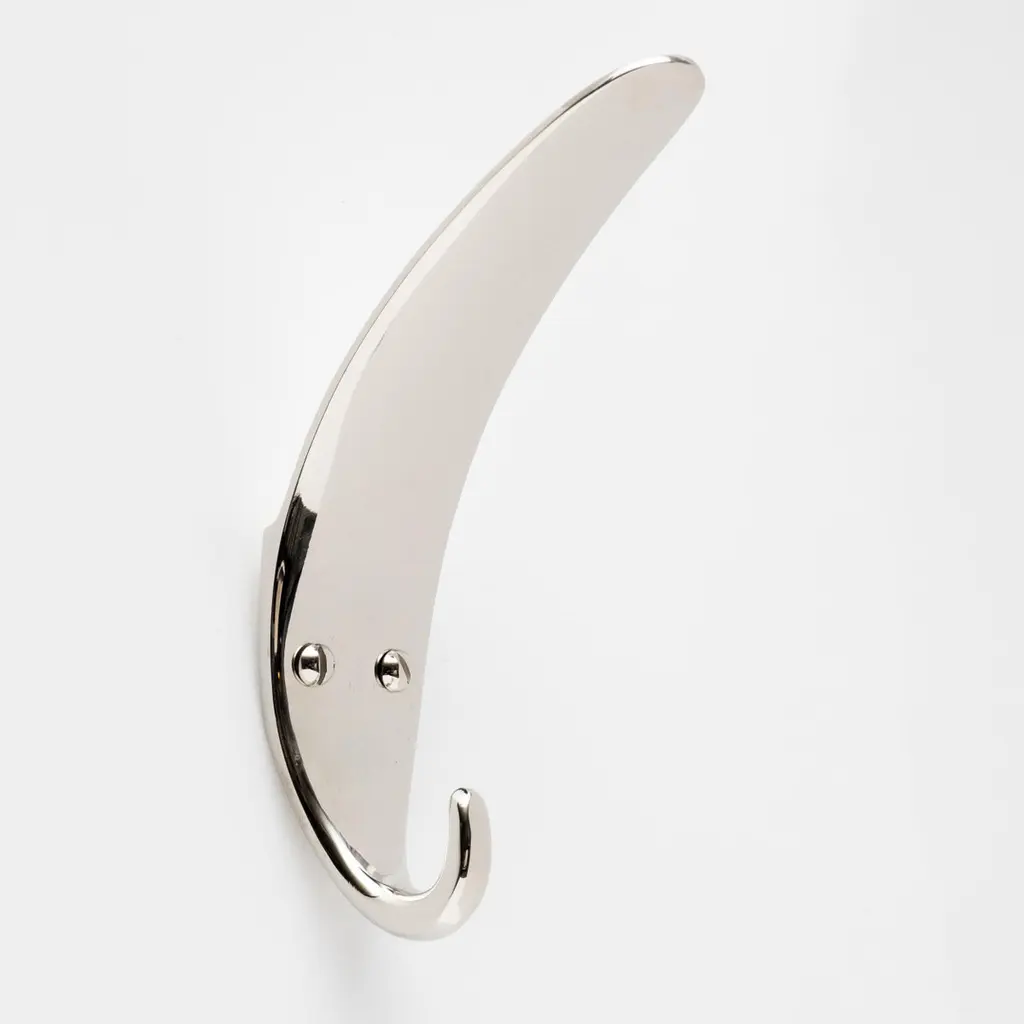 Carl Auböck Model #4329 Polished Nickel Hook.Designed in the 1950s, this versatile and minimalist midcentury wall hook is executed in choice of patinated brass, polished brass, or polished nickel-plated brass by Werkstätte Carl Auböck, Austria. This versatile hook can be used in entry halls, closets, bathrooms or more. Includes screws for mounting.Produced by Carl Auböck IV in the original Auböck workshop in the 7th district of Vienna using the same exacting standards, high-quality materials, original molds and techniques of his legendary namesake. Auböck's design career was long and varied, reaching its pinnacle of prestige at the Triennale di Milano in 1954, where he received four gold medals in recognition of his iconic work.Price is per item. Available in choice of patinated brass, polished brass, polished nickel, or brushed nickel. This listing is for the Model #4329 hook in polished nickel-plated brass.Several in stock and ready to ship. Inventory availability subject to change without notice. Out of stock lead time can add 2-3 weeks or more. For time-sensitive orders, kindly inquire prior to purchasing.Please note that only one representative example of each item is shown in the images. Finish varies from item to item due to the handmade nature of their fabrication. Note that polished brass hooks are fabricated in unlacquered brass which will naturally patinate over time and can already show varied signs of patination from handling, exposure to the elements, etc.Made to order. All sales are final.