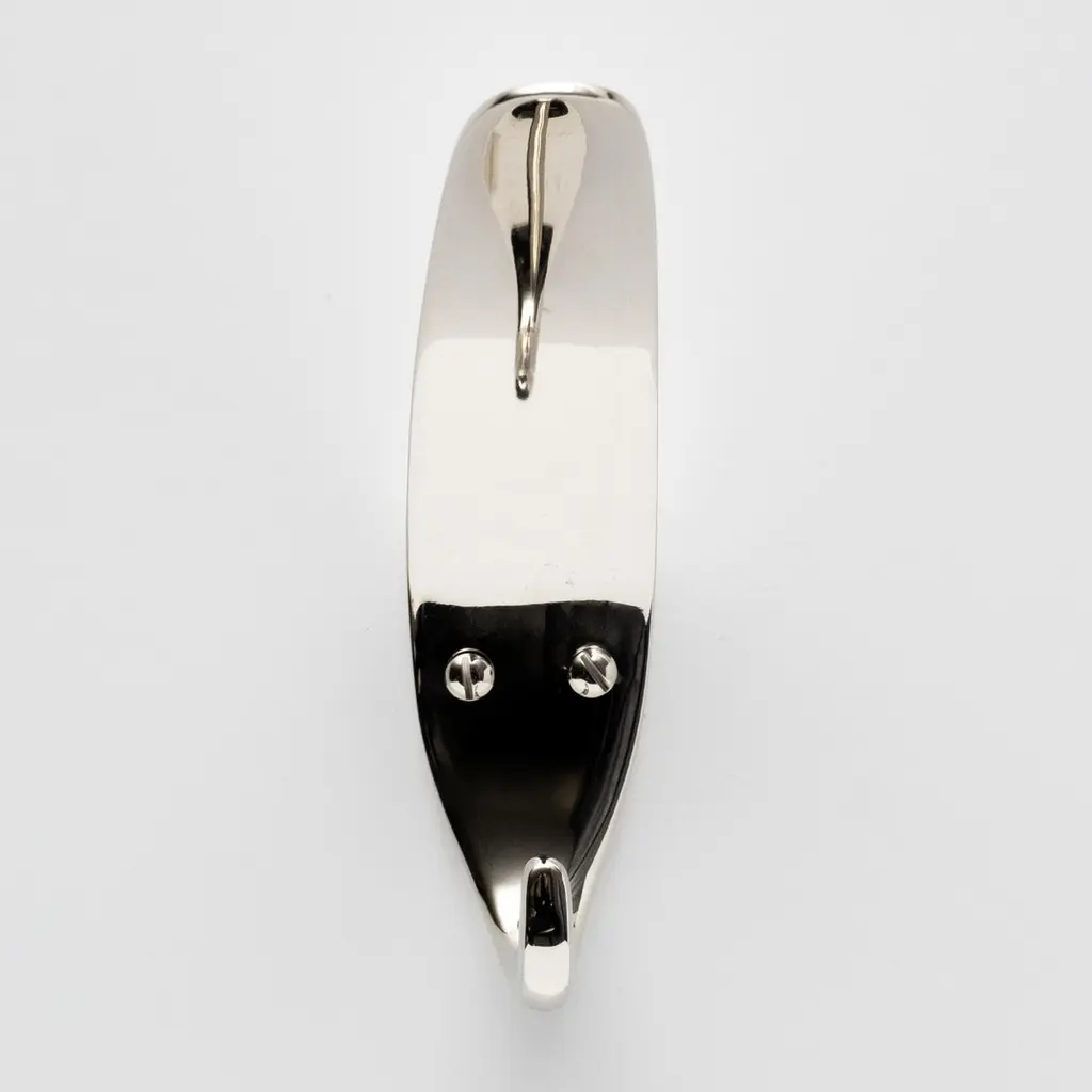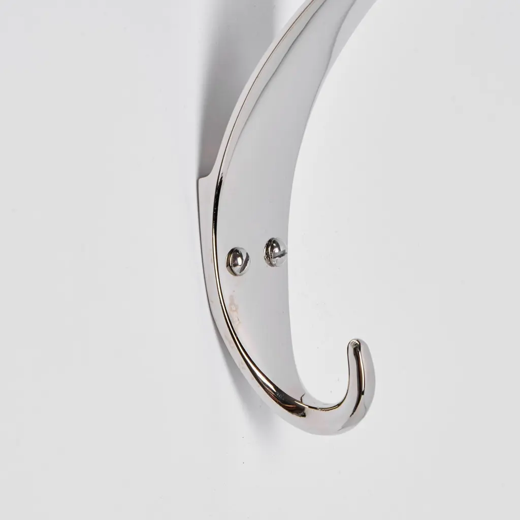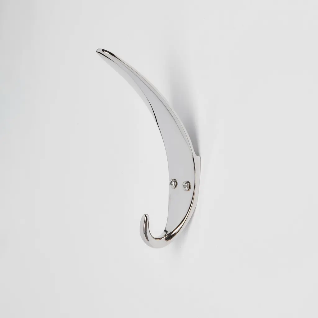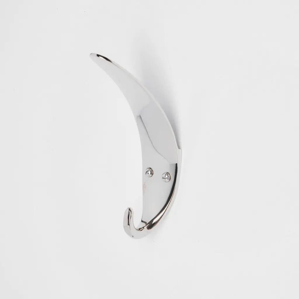 Carl Auböck Model #4329 Polished Nickel Hook.Designed in the 1950s, this versatile and minimalist midcentury wall hook is executed in choice of patinated brass, polished brass, or polished nickel-plated brass by Werkstätte Carl Auböck, Austria. This versatile hook can be used in entry halls, closets, bathrooms or more. Includes screws for mounting.Produced by Carl Auböck IV in the original Auböck workshop in the 7th district of Vienna using the same exacting standards, high-quality materials, original molds and techniques of his legendary namesake. Auböck's design career was long and varied, reaching its pinnacle of prestige at the Triennale di Milano in 1954, where he received four gold medals in recognition of his iconic work.Price is per item. Available in choice of patinated brass, polished brass, polished nickel, or brushed nickel. This listing is for the Model #4329 hook in polished nickel-plated brass.Several in stock and ready to ship. Inventory availability subject to change without notice. Out of stock lead time can add 2-3 weeks or more. For time-sensitive orders, kindly inquire prior to purchasing.Please note that only one representative example of each item is shown in the images. Finish varies from item to item due to the handmade nature of their fabrication. Note that polished brass hooks are fabricated in unlacquered brass which will naturally patinate over time and can already show varied signs of patination from handling, exposure to the elements, etc.Made to order. All sales are final.