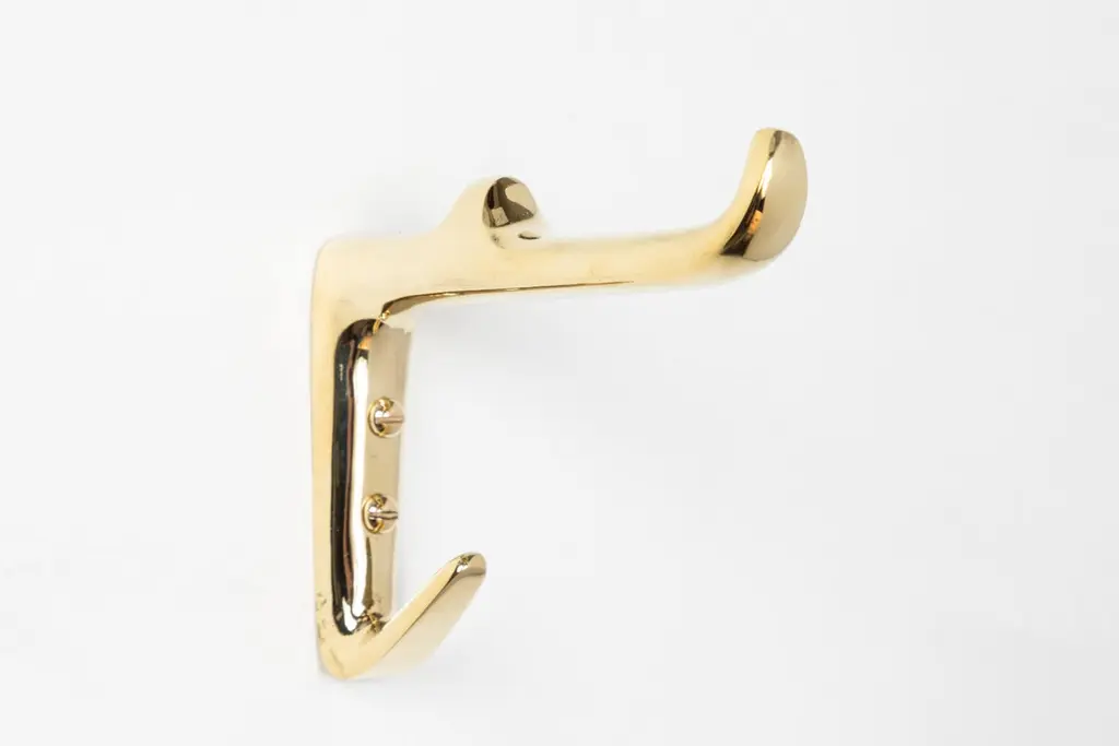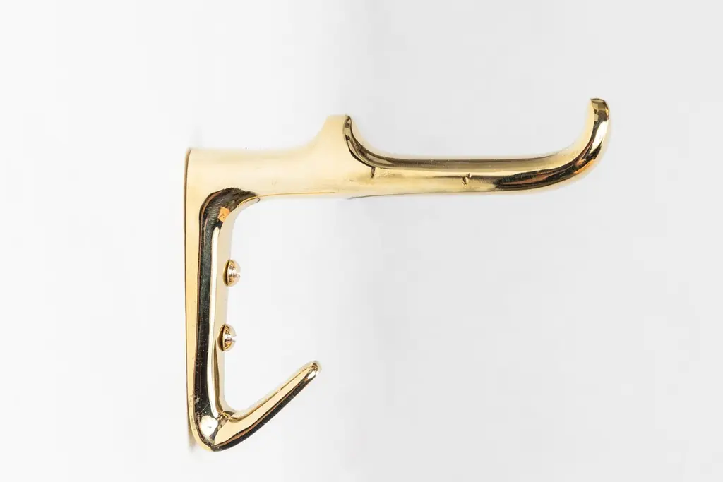 Carl Auböck brass #4956 brass hook. Designed in the 1950s, this versatile and Minimalist Viennese hook is executed in polished brass by Werkstätte Carl Auböck, Austria.Price is per item. Two in stock ready to ship. Available in unlimited quantities. Please note that in-stock availability is subject to change at any time. Allow additional 3-4 weeks for items not in stock. Can take up to 8 weeks. Produced by Carl Auböck IV in the original Auböck workshop in the 7th district of Vienna using the same exacting standards, high-quality materials, original molds and techniques of his legendary namesake. Auböck's design career was long and varied, reaching its pinnacle of prestige at the Triennale di Milano in 1954, where he received four gold medals in recognition of his iconic work.Please note that only one representative example of each item is shown in the images. Finish varies from item to item due to the handmade nature of their fabrication.