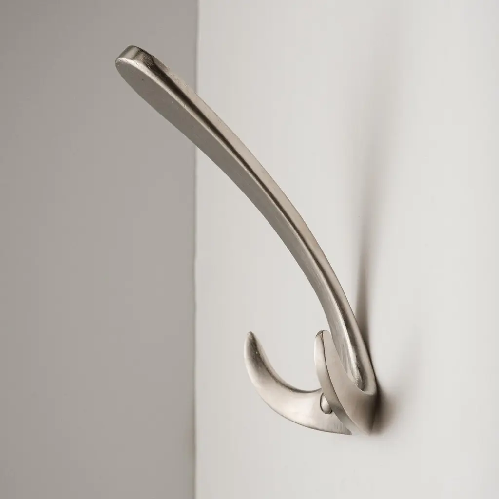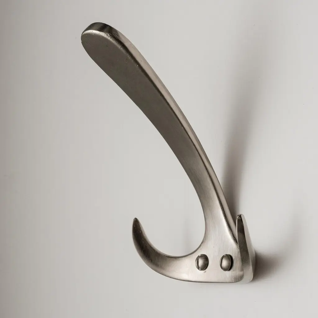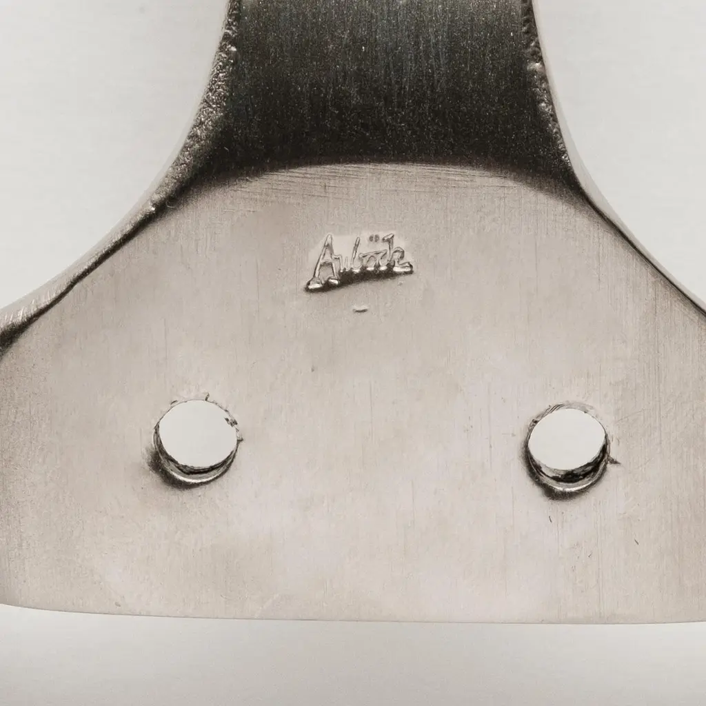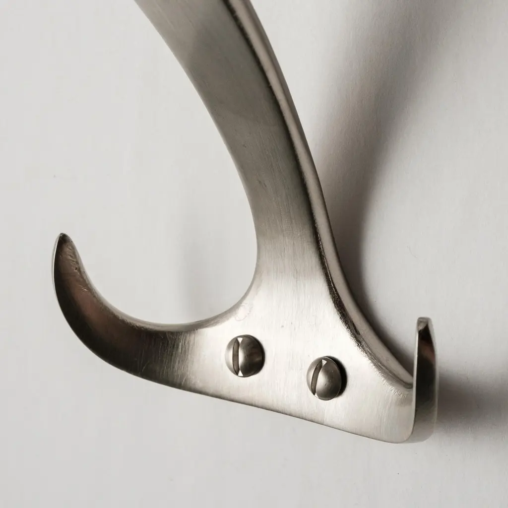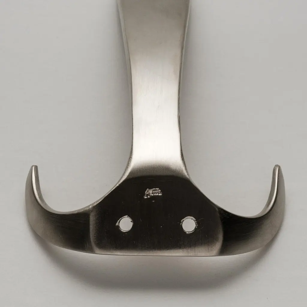 Carl Auböck model #4982 hook in nickel. Designed in the 1950s, this versatile and minimalist Viennese hook is executed in softly brushed nickel by Werkstätte Carl Auböck, Austria. Produced by Carl Auböck IV in the original Auböck workshop in the 7th district of Vienna using the same exacting standards, high-quality materials, original molds and techniques of his legendary namesake. Auböck's design career was long and varied, reaching its pinnacle of prestige at the Triennale di Milano in 1954, where he received four gold medals in recognition of his iconic work.Price is per item. Available in unlimited quantities. Two hooks in stock and ready to ship. Please note that in-stock availability is subject to change at any time. Out of stock can add additional 4 weeks or more. Please note that only one representative example of each item is shown in the images. Finish varies from item to item due to the handmade nature of their fabrication.Made to order. All sales are final.