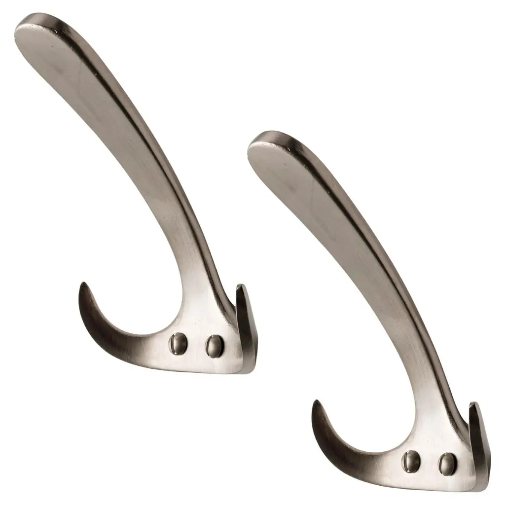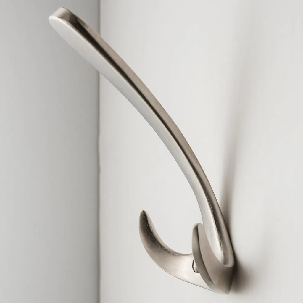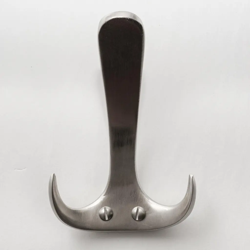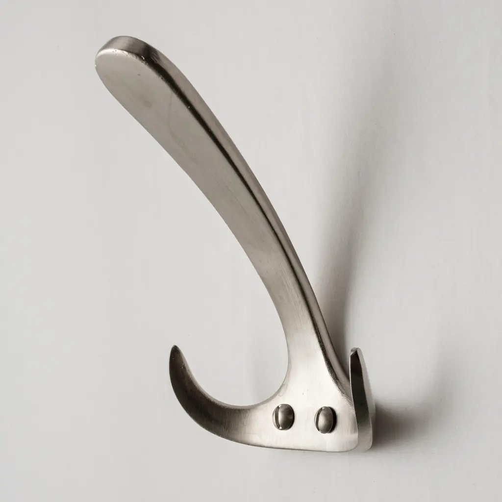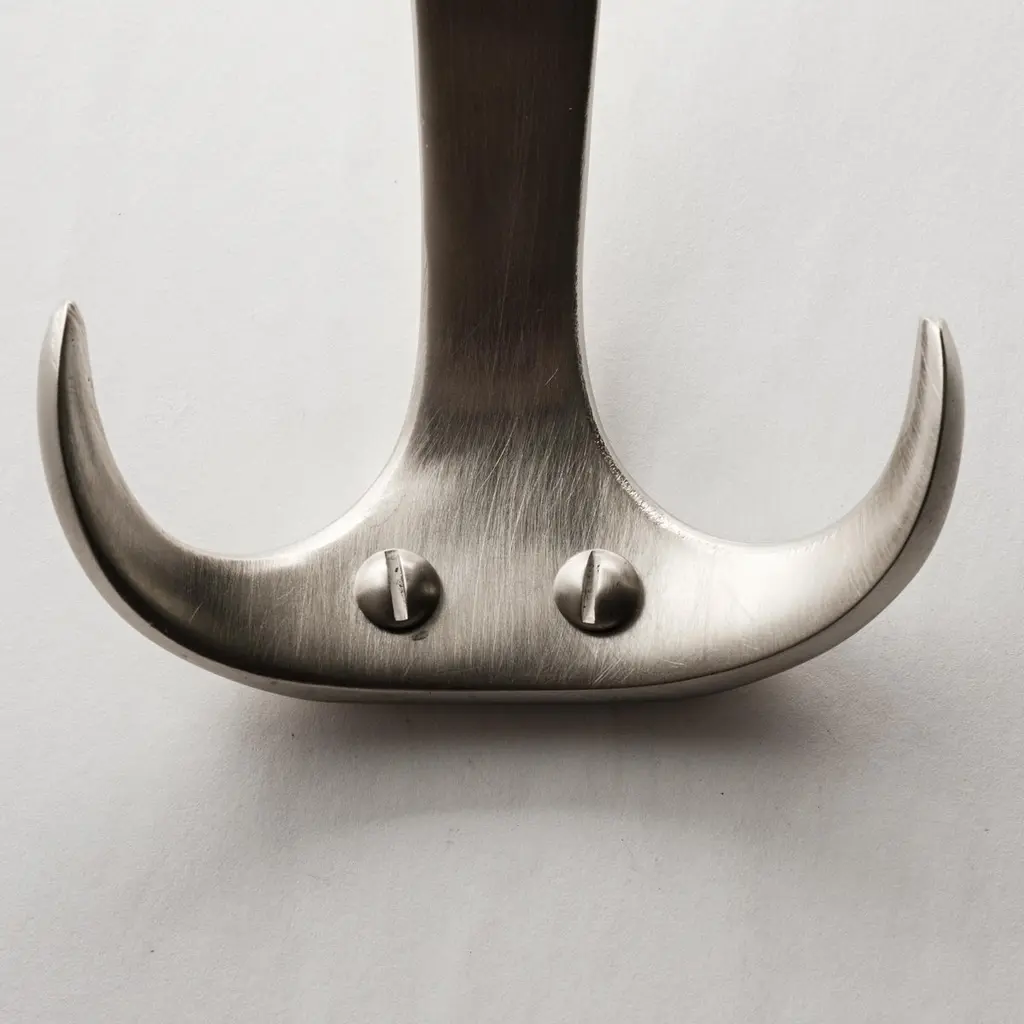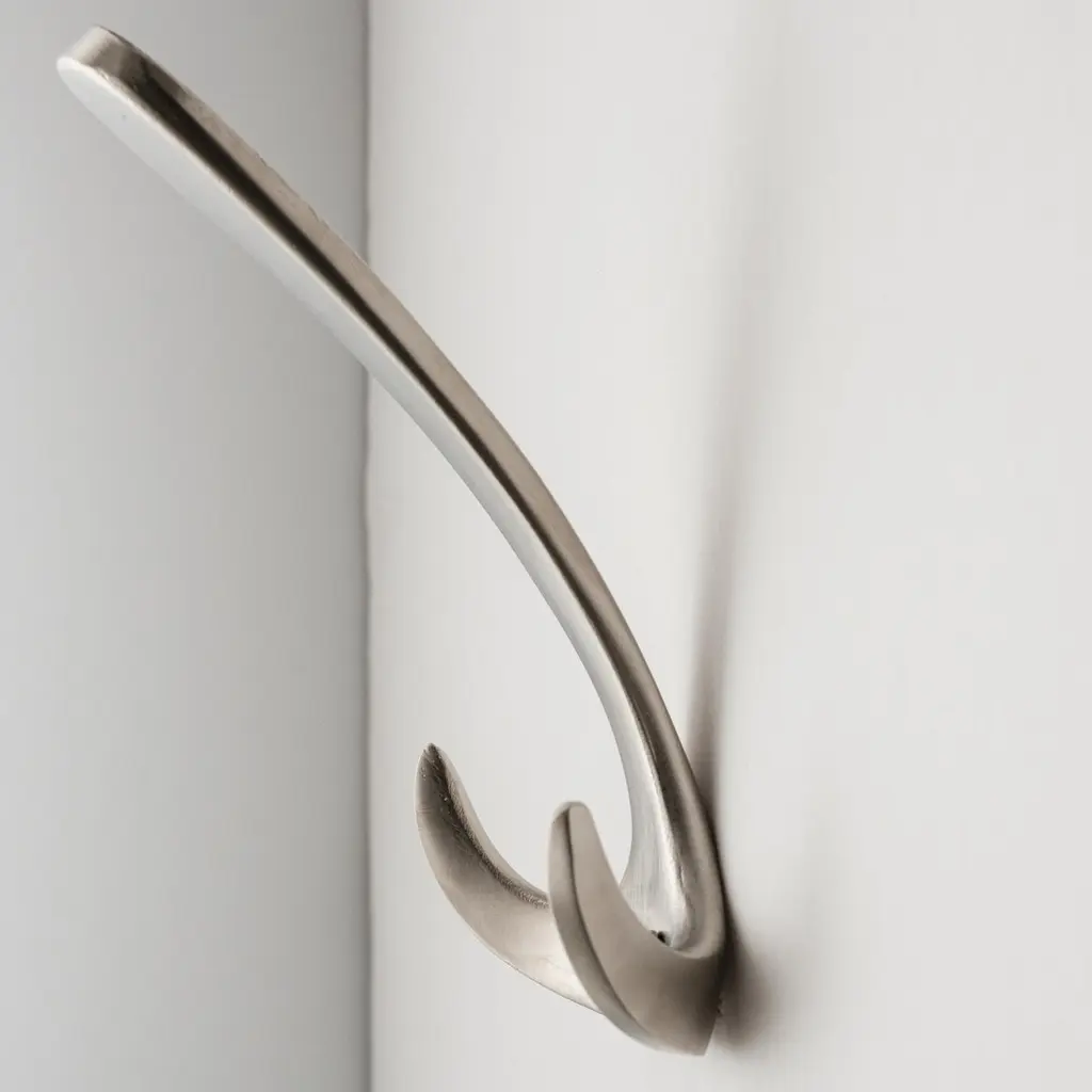 Carl Auböck model #4982 hook in nickel. Designed in the 1950s, this versatile and minimalist Viennese hook is executed in softly brushed nickel by Werkstätte Carl Auböck, Austria. Produced by Carl Auböck IV in the original Auböck workshop in the 7th district of Vienna using the same exacting standards, high-quality materials, original molds and techniques of his legendary namesake. Auböck's design career was long and varied, reaching its pinnacle of prestige at the Triennale di Milano in 1954, where he received four gold medals in recognition of his iconic work.Price is per item. Available in unlimited quantities. Two hooks in stock and ready to ship. Please note that in-stock availability is subject to change at any time. Out of stock can add additional 4 weeks or more. Please note that only one representative example of each item is shown in the images. Finish varies from item to item due to the handmade nature of their fabrication.Made to order. All sales are final.