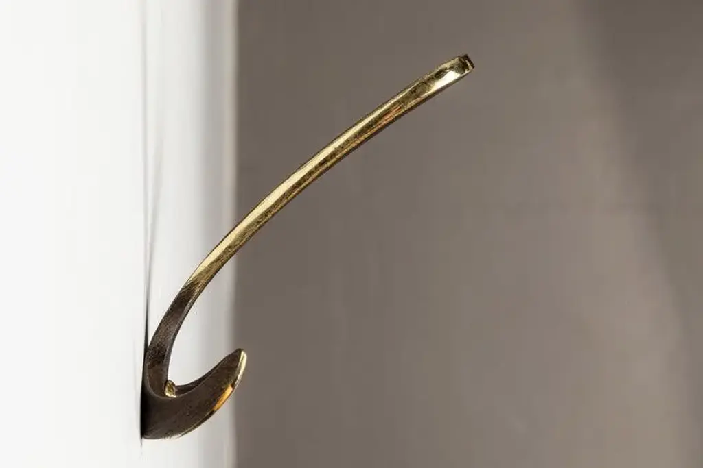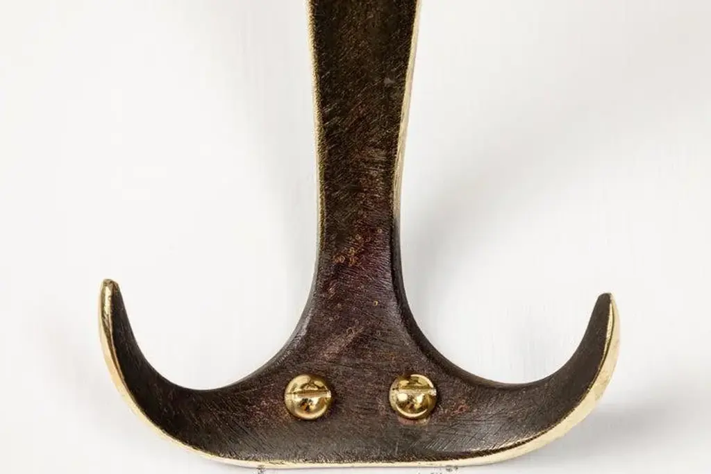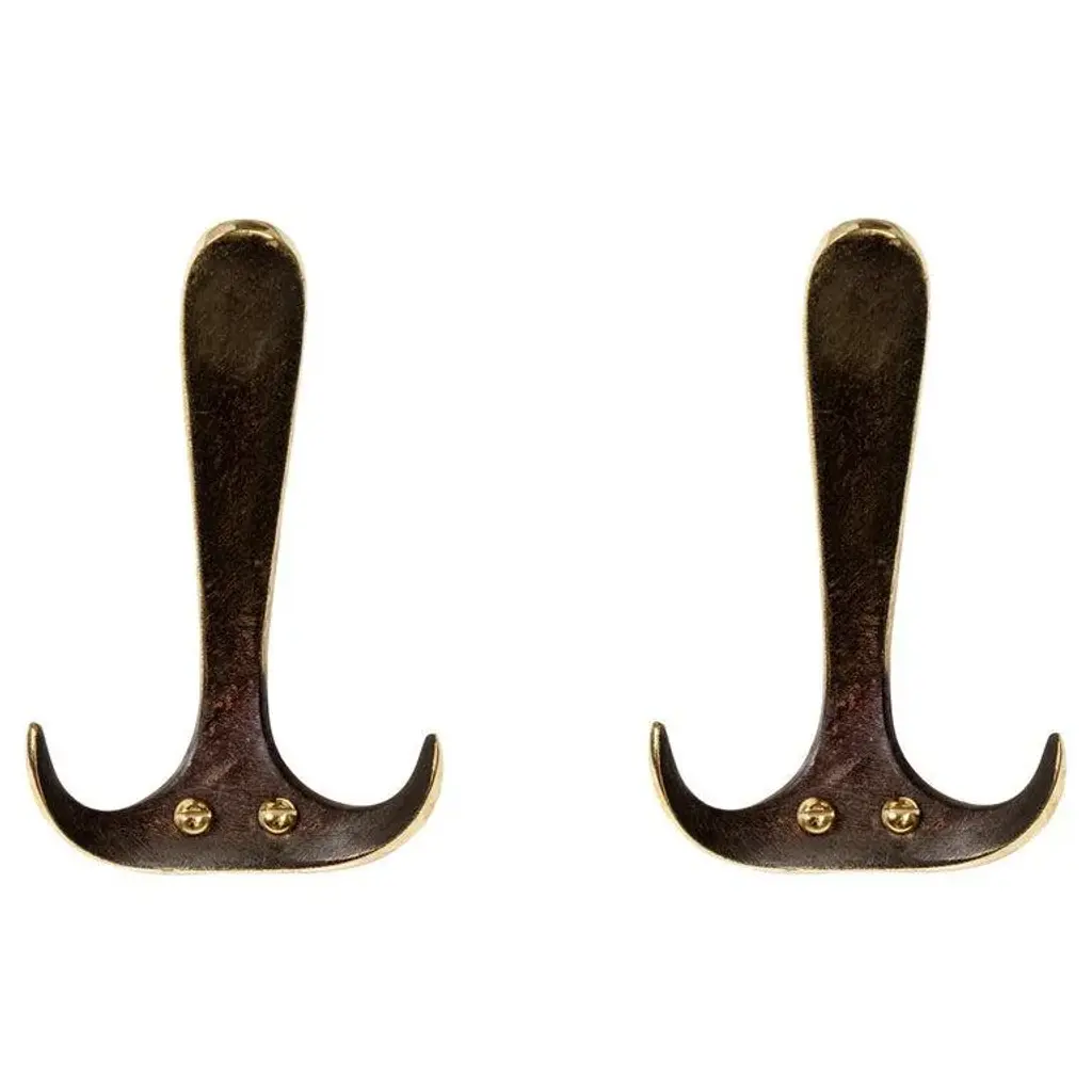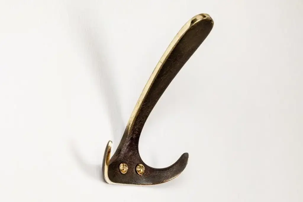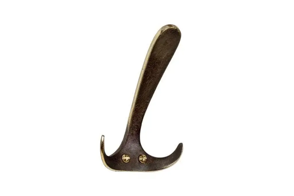 Carl Auböck brass #5439 patinated brass hook. Designed in the 1950s, this versatile and minimalist Viennese candleholder is executed in polished and patinated brass by Werkstätte Carl Auböck, Austria. Price is per item. Produced by Carl Auböck IV in the original Auböck workshop in the 7th district of Vienna using the same exacting standers, high-quality materials, original molds and techniques of his legendary namesake. Auböck's design career was long and varied, reaching its pinnacle of prestige at the Triennale di Milano in 1954, where he received four gold medals in recognition of his iconic work. Price is per item. Available in unlimited quantities. Please note lead time can take 6 weeks or more. Please note that only one representative example of each item is shown in the images. Finish varies from item to item due to the handmade nature of their fabrication and due to the unique chemical patination process, which is meant to simulate 80-100 years of exposure of brass to sunlight. Made to order.