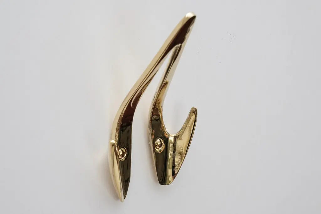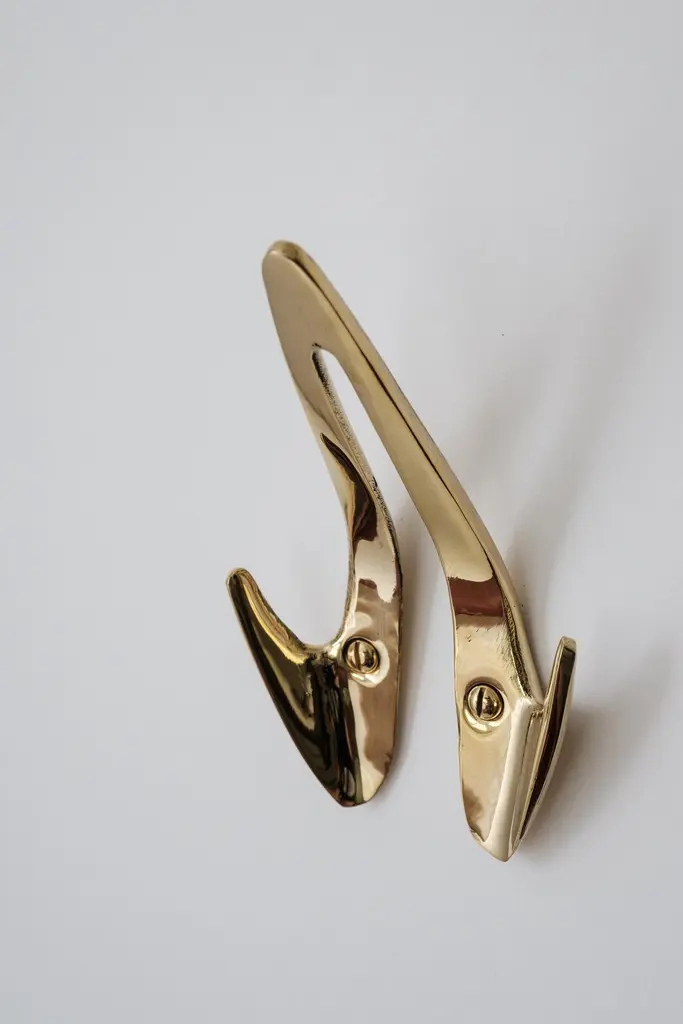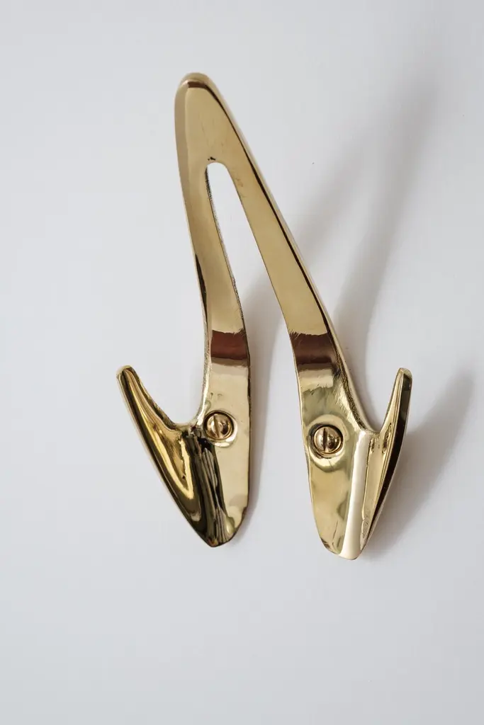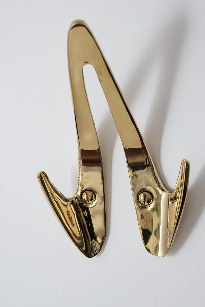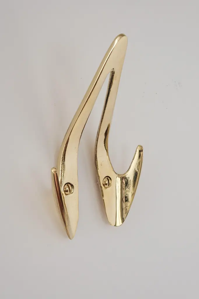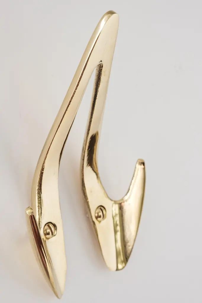 Carl Auböck Model #4994 polished brass hook. Designed in the 1950s, this versatile and Minimalist Viennese hook is executed in polished brass by Werkstätte Carl Auböck, Austria. Produced by Carl Auböck IV in the original Auböck workshop in the 7th district of Vienna using the same exacting standards, high-quality materials, original molds and techniques of his legendary namesake. Auböck's design career was long and varied, reaching its pinnacle of prestige at the Triennale di Milano in 1954, where he received four gold medals in recognition of his iconic work.Price is per item. Also available in patinated brass finish.4 hooks in stock and ready to ship. Inventory availability subject to change without notice. Out of stock lead time can add 2-3 weeks or more.Please note that only one representative example of each item is shown in the images. Finish varies from item to item due to the handmade nature of their fabrication.Made to order. All sales are final.