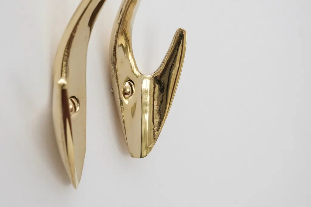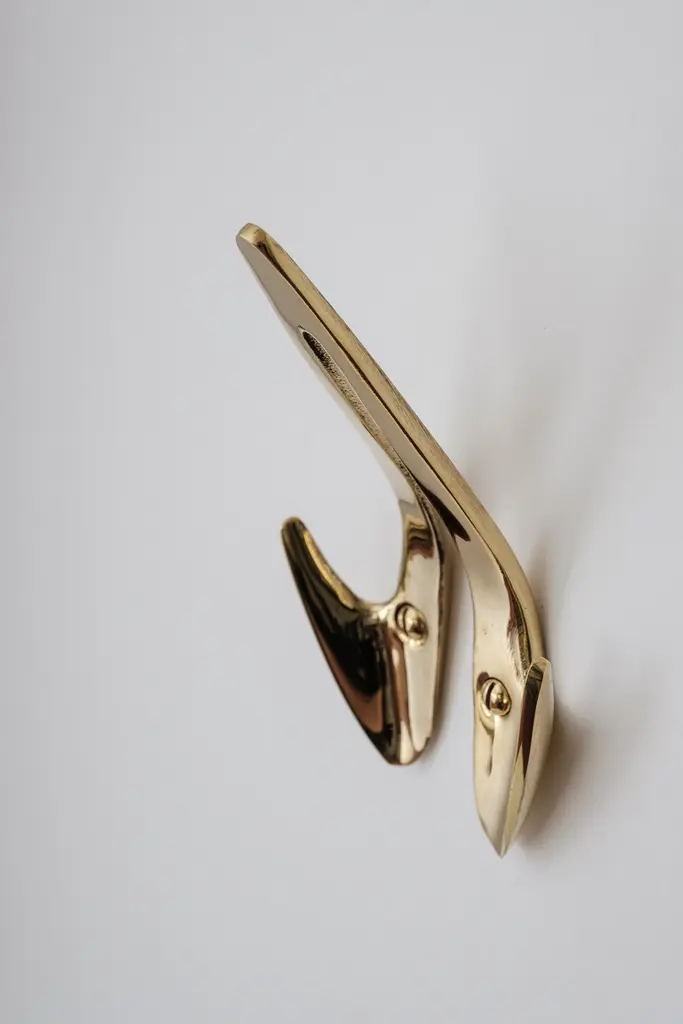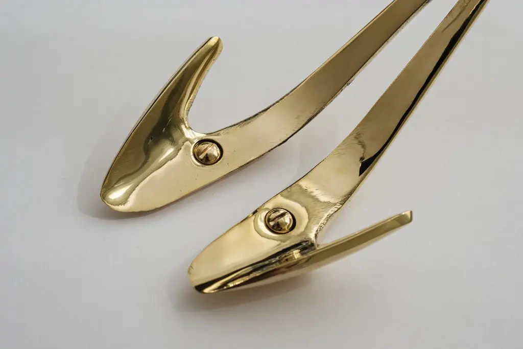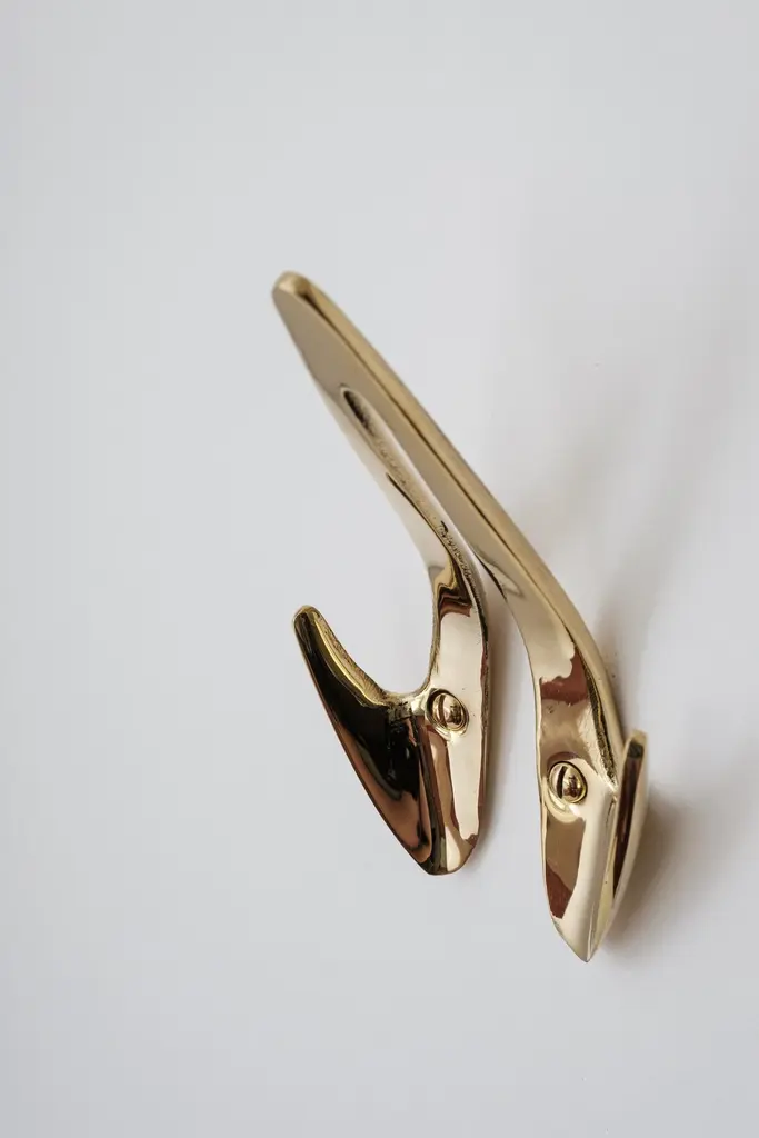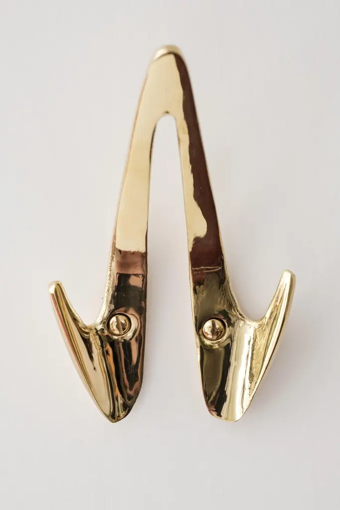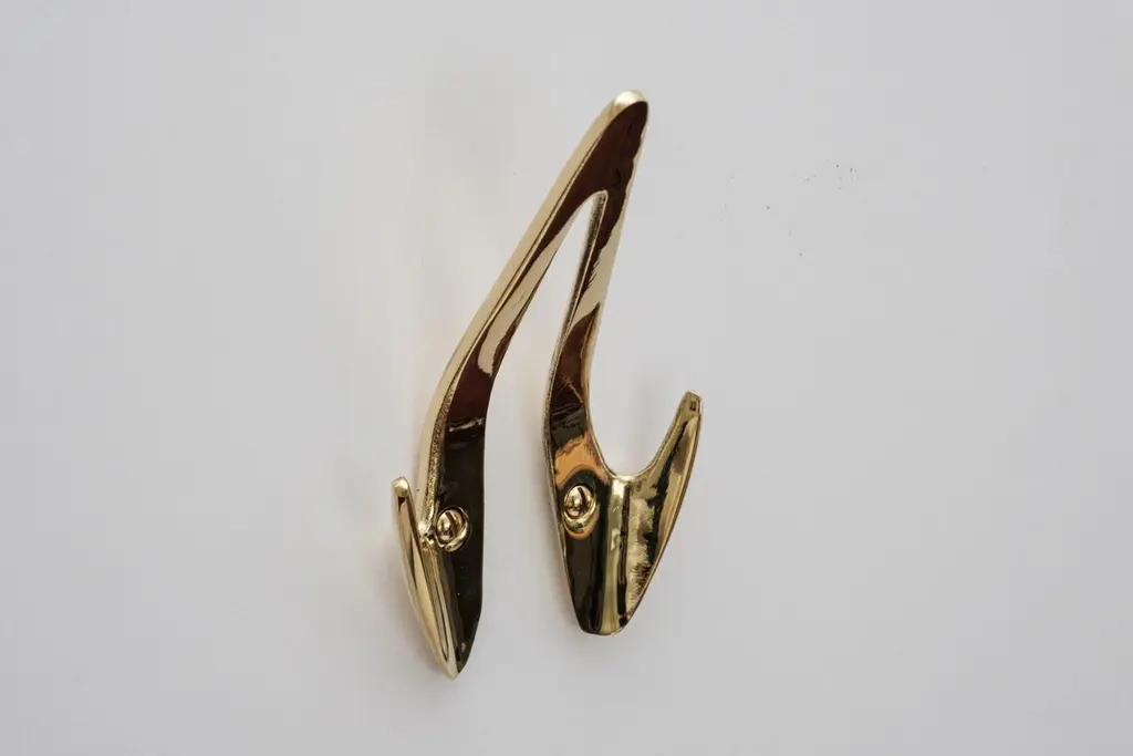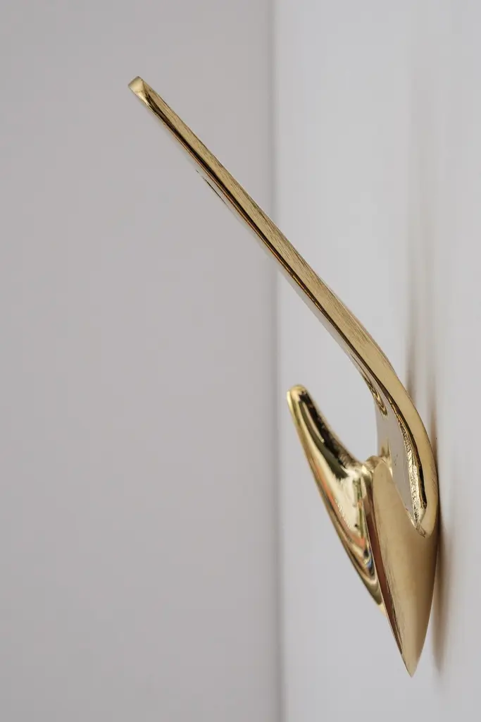 Carl Auböck Model #4994 polished brass hook. Designed in the 1950s, this versatile and Minimalist Viennese hook is executed in polished brass by Werkstätte Carl Auböck, Austria. Produced by Carl Auböck IV in the original Auböck workshop in the 7th district of Vienna using the same exacting standards, high-quality materials, original molds and techniques of his legendary namesake. Auböck's design career was long and varied, reaching its pinnacle of prestige at the Triennale di Milano in 1954, where he received four gold medals in recognition of his iconic work.Price is per item. Also available in patinated brass finish.4 hooks in stock and ready to ship. Inventory availability subject to change without notice. Out of stock lead time can add 2-3 weeks or more.Please note that only one representative example of each item is shown in the images. Finish varies from item to item due to the handmade nature of their fabrication.Made to order. All sales are final.