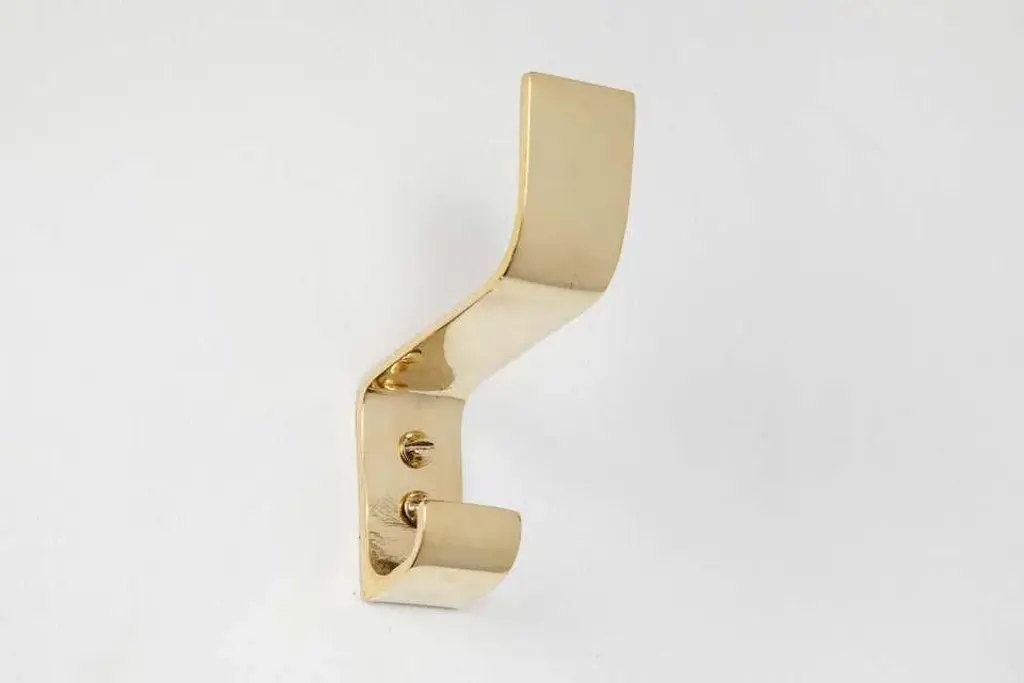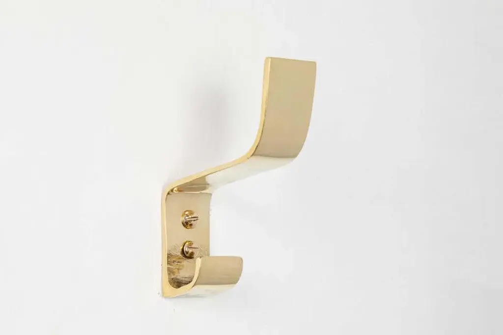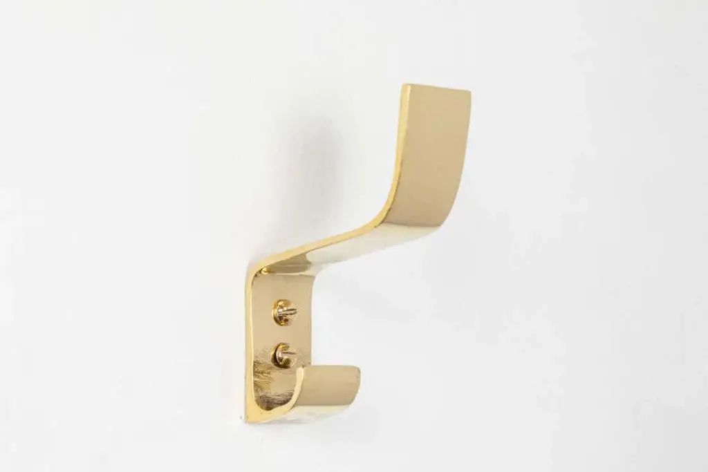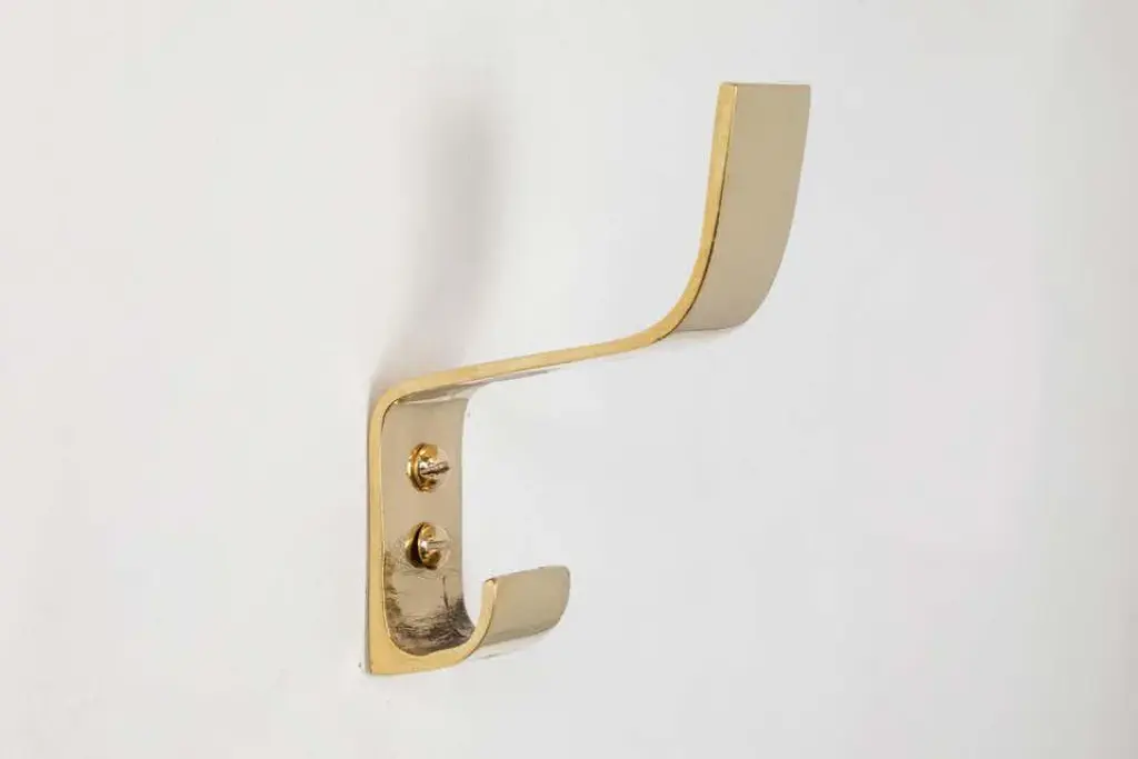 Carl Auböck brass #5261 brass hook. Designed in the 1950s, this versatile and Minimalist Viennese candleholder is executed in polished brass by Werkstätte Carl Auböck, Austria. Price is per item. Two in stock ready to ship. Available in unlimited quantities. Can take up to 8 weeks. Produced by Carl Auböck IV in the original Auböck workshop in the 7th district of Vienna using the same exacting standers, high-quality materials, original molds and techniques of his legendary namesake. Auböck's design career was long and varied, reaching its pinnacle of prestige at the Triennale di Milano in 1954, where he received four gold medals in recognition of his iconic work. Please note that only one representative example of each item is shown in the images. Finish varies from item to item due to the handmade nature of their fabrication.