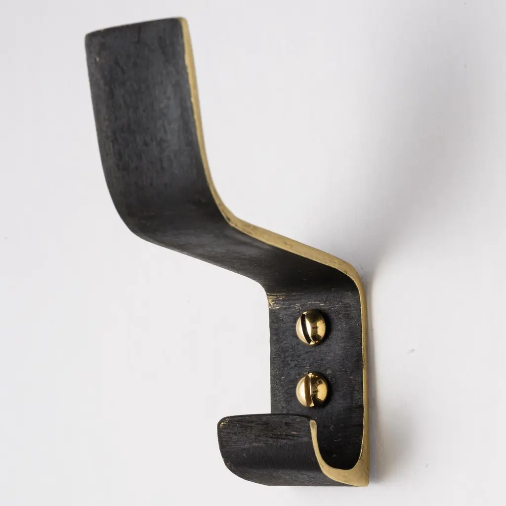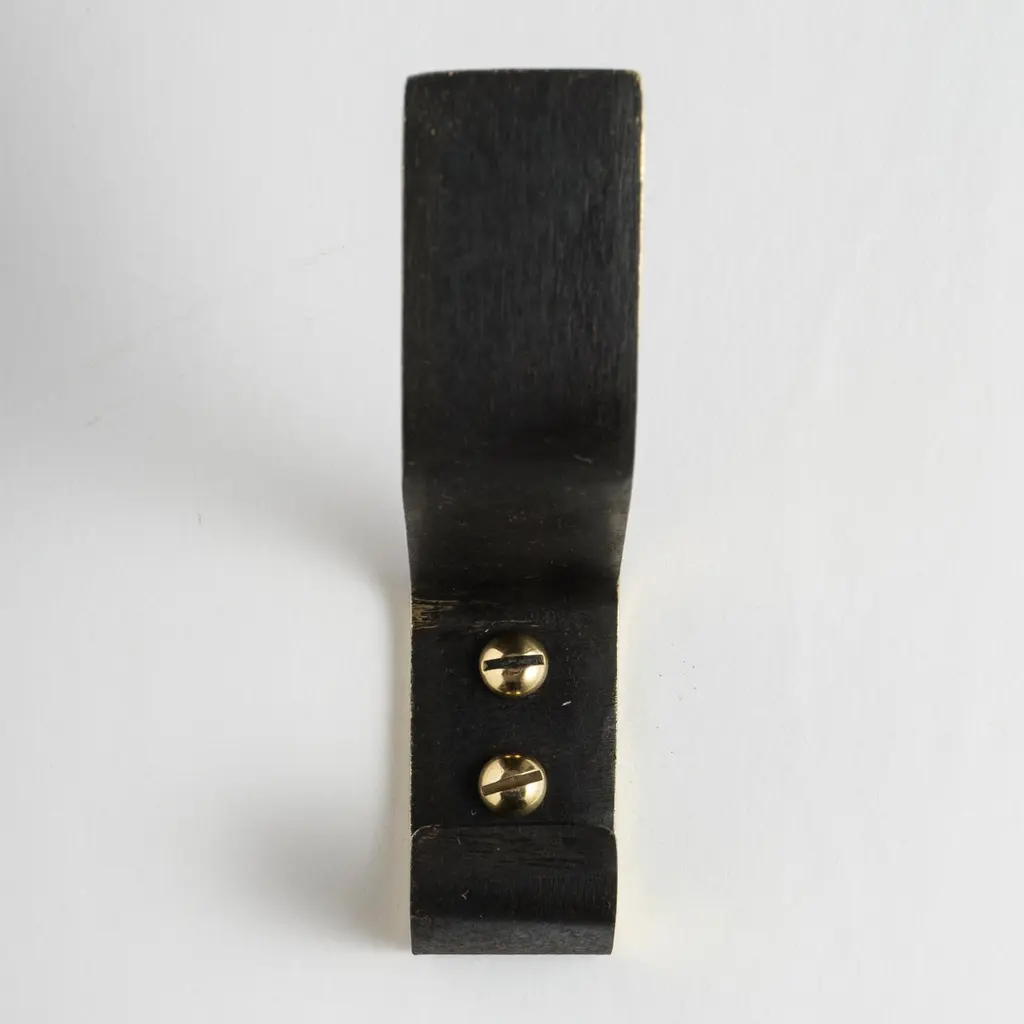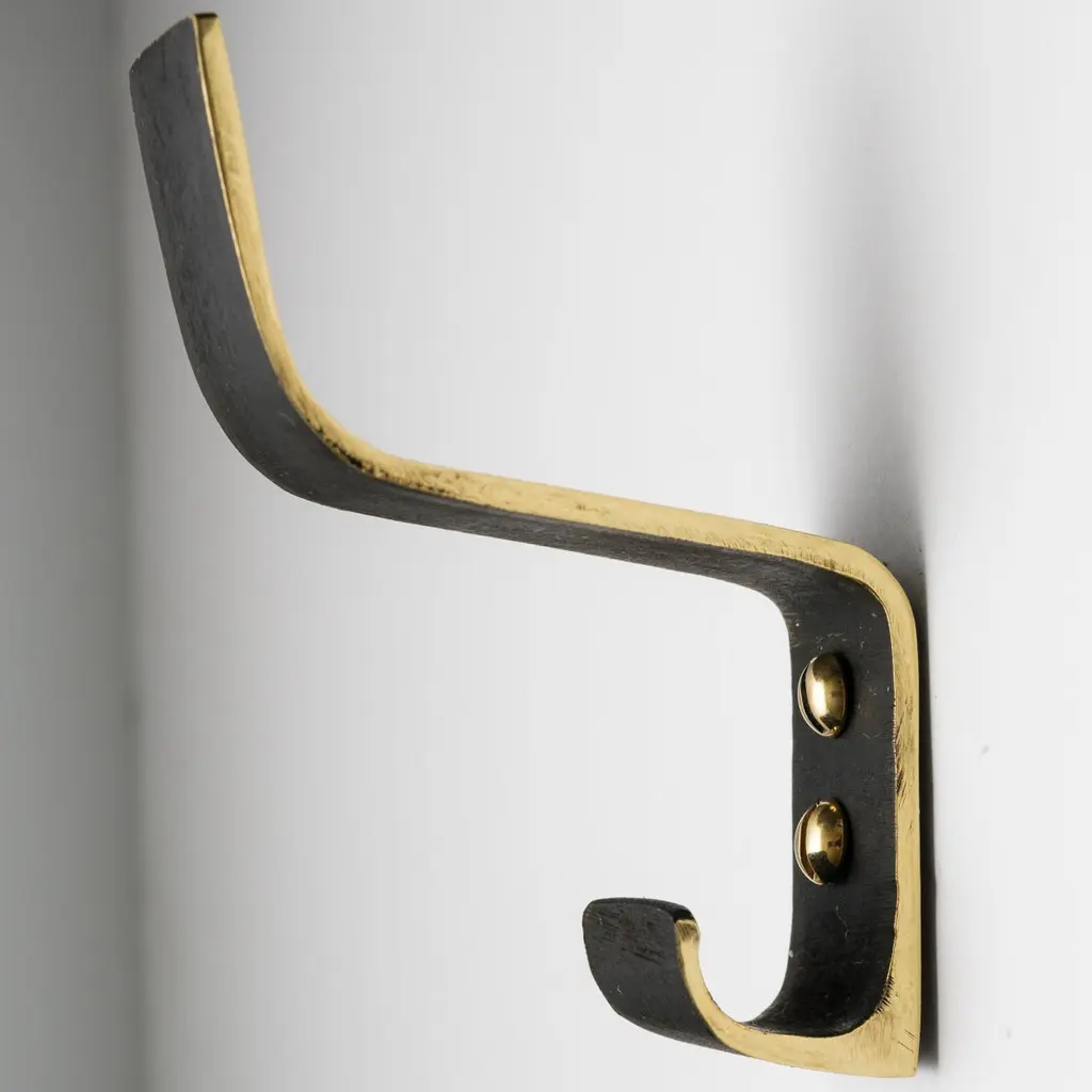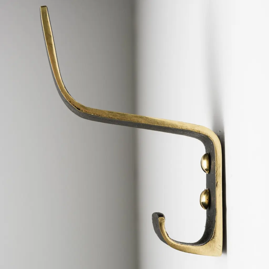 Carl Auböck model #5261 patinated brass hook. Designed in the 1950s, this versatile and Minimalist Viennese hook is executed in patinated and polished brass by Werkstätte Carl Auböck, Austria. Produced by Carl Auböck IV in the original Auböck workshop in the 7th district of Vienna using the same exacting standards, high-quality materials, original molds and techniques of his legendary namesake. Auböck's design career was long and varied, reaching its pinnacle of prestige at the Triennale di Milano in 1954, where he received four gold medals in recognition of his iconic work.Price is per item. Available in unlimited quantities in choice of polished brass, patinated brass, or nickel. This listing is for the patinated brass finish.Two hooks in stock and ready to ship. Please note that in-stock availability is subject to change at any time. Allow additional 3-4 weeks or more for items not in stock.Please note that only one representative example of each item is shown in the images. Finish varies from item to item due to the handmade nature of their fabrication and due to the unique chemical patination process, which is meant to simulate 80-100 years of exposure of brass to sunlight.Made to order. All sales are final.