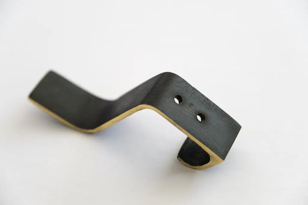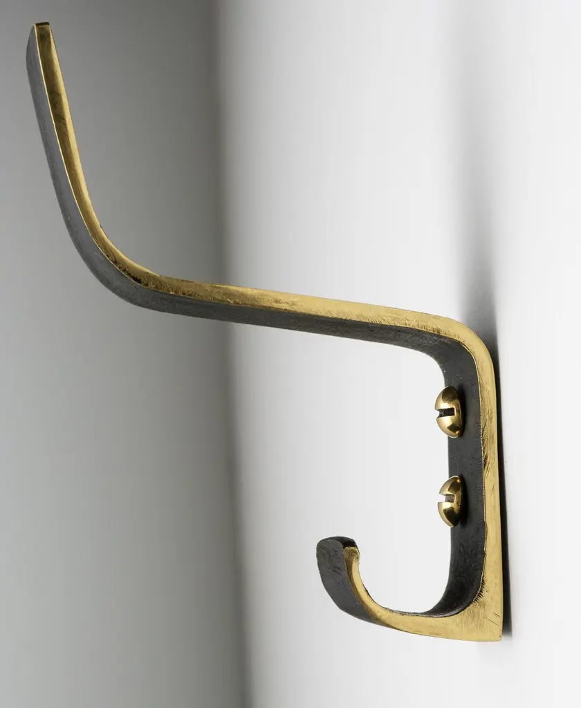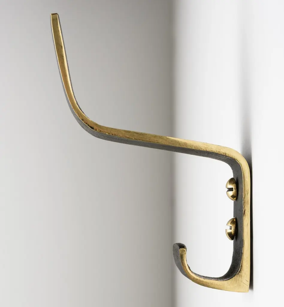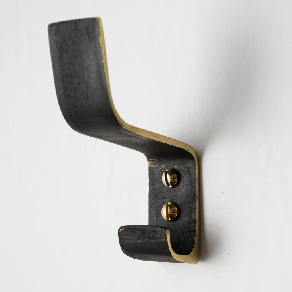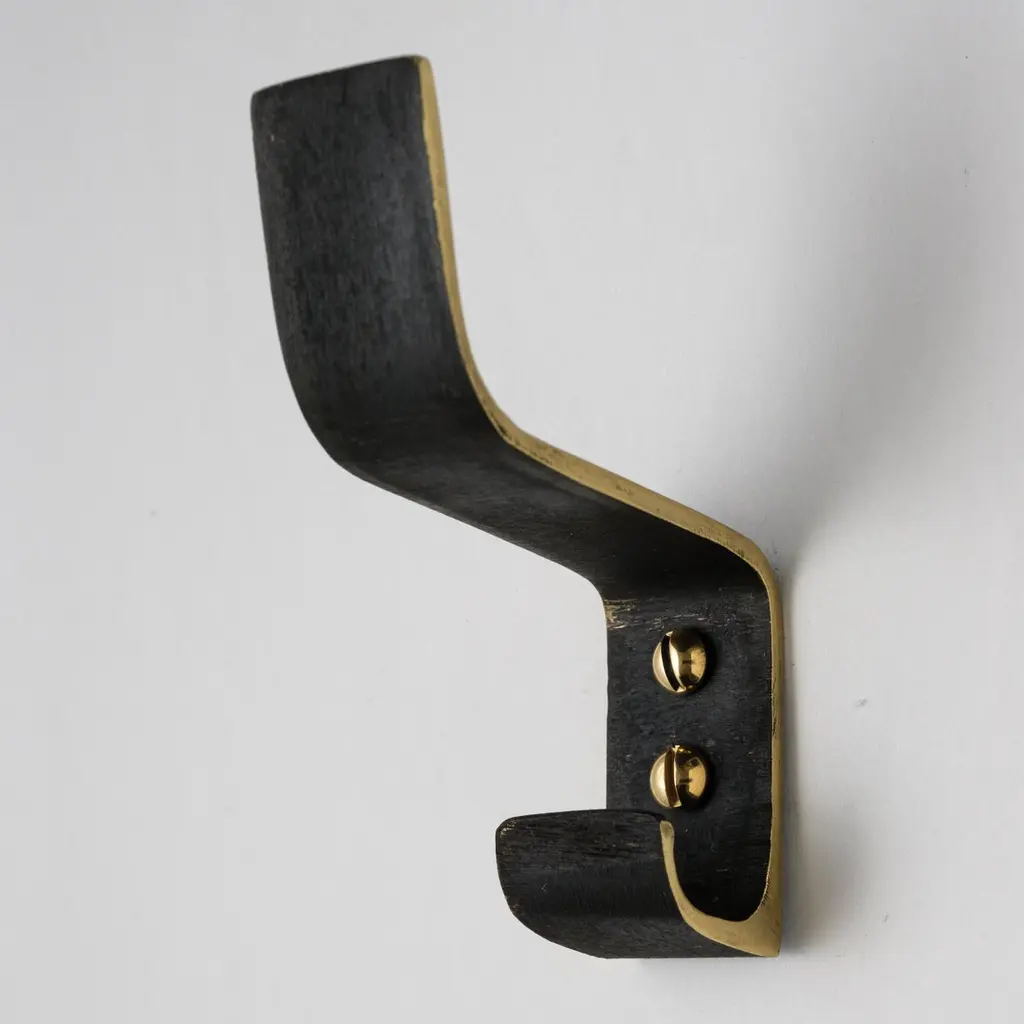 Carl Auböck model #5261 patinated brass hook. Designed in the 1950s, this versatile and Minimalist Viennese hook is executed in patinated and polished brass by Werkstätte Carl Auböck, Austria. Produced by Carl Auböck IV in the original Auböck workshop in the 7th district of Vienna using the same exacting standards, high-quality materials, original molds and techniques of his legendary namesake. Auböck's design career was long and varied, reaching its pinnacle of prestige at the Triennale di Milano in 1954, where he received four gold medals in recognition of his iconic work.Price is per item. Available in unlimited quantities in choice of polished brass, patinated brass, or nickel. This listing is for the patinated brass finish.Two hooks in stock and ready to ship. Please note that in-stock availability is subject to change at any time. Allow additional 3-4 weeks or more for items not in stock.Please note that only one representative example of each item is shown in the images. Finish varies from item to item due to the handmade nature of their fabrication and due to the unique chemical patination process, which is meant to simulate 80-100 years of exposure of brass to sunlight.Made to order. All sales are final.