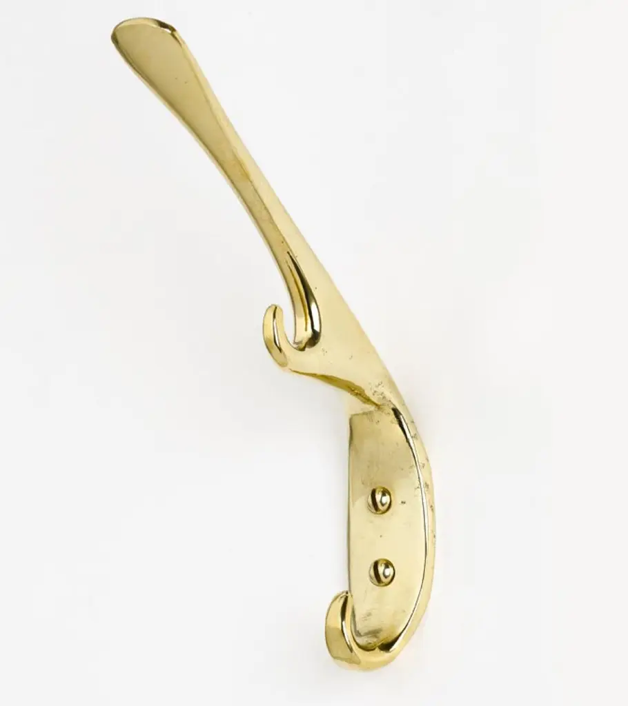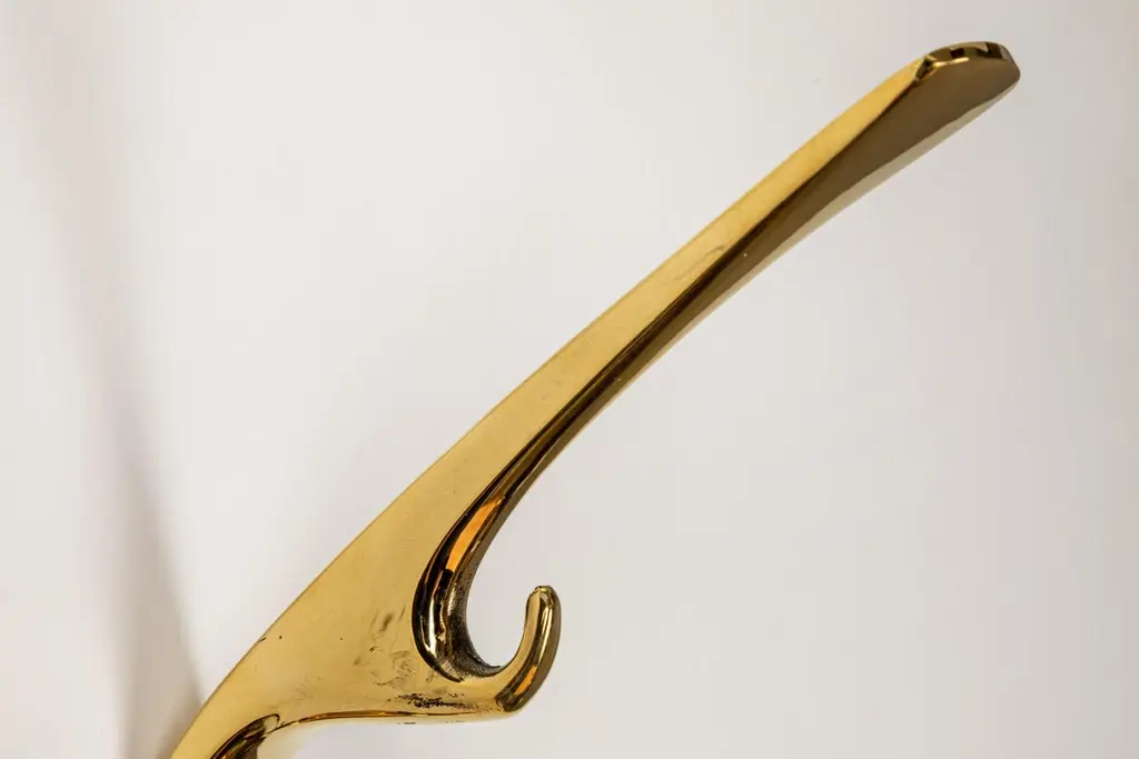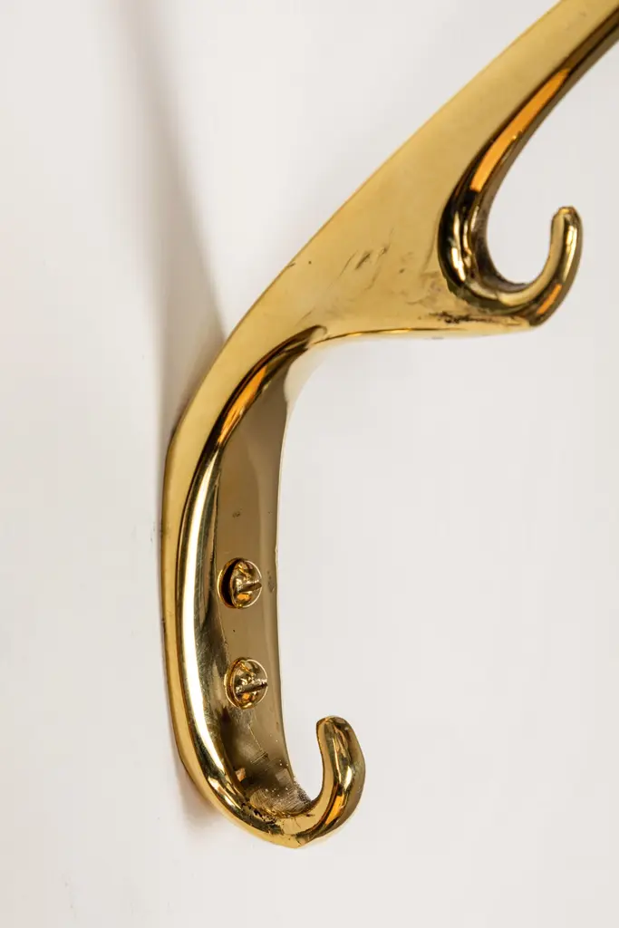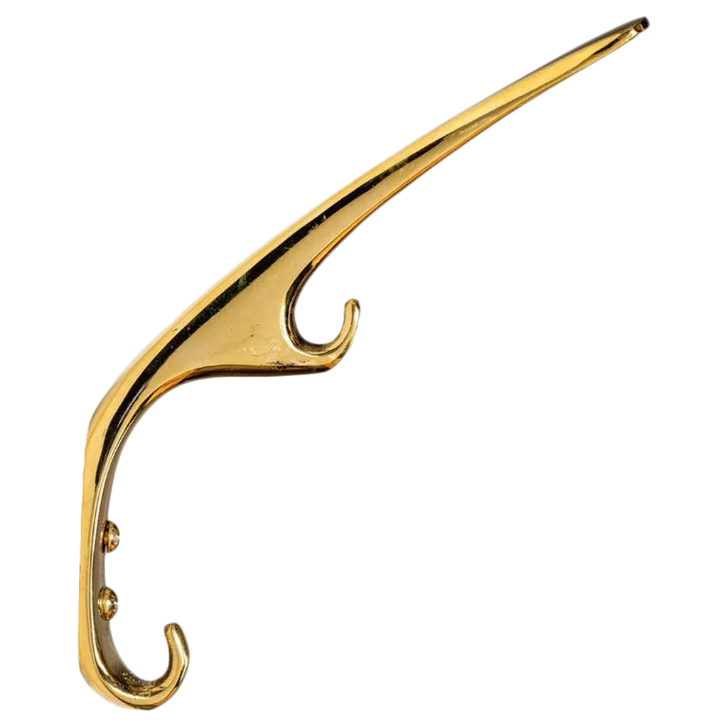 Carl Auböck brass #5439 brass hook. Designed in the 1950s, this versatile and Minimalist Viennese candleholder is executed in polished brass by Werkstätte Carl Auböck, Austria.Price is per item. Two in stock ready to ship. Available in unlimited quantities. Please note that in-stock availability is subject to change at any time. Allow additional 3-4 weeks for items not in stock. Can take up to 8 weeks. Produced by Carl Auböck IV in the original Auböck workshop in the 7th district of Vienna using the same exacting standards, high-quality materials, original molds and techniques of his legendary namesake. Auböck's design career was long and varied, reaching its pinnacle of prestige at the Triennale di Milano in 1954, where he received four gold medals in recognition of his iconic work.Please note that only one representative example of each item is shown in the images. Finish varies from item to item due to the handmade nature of their fabrication.