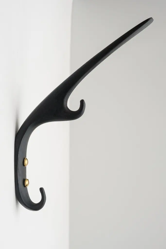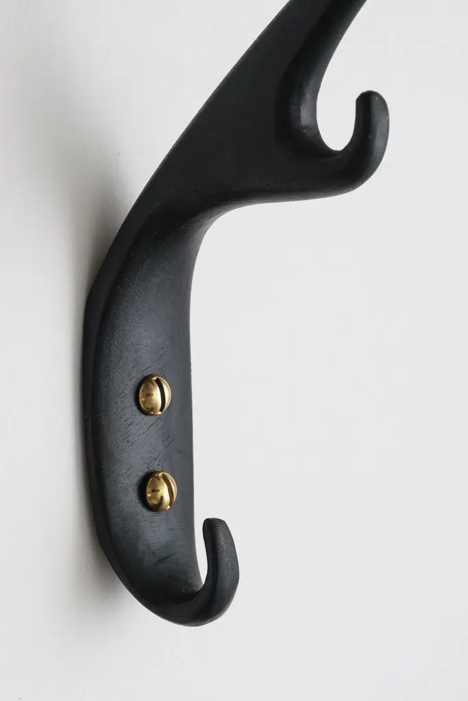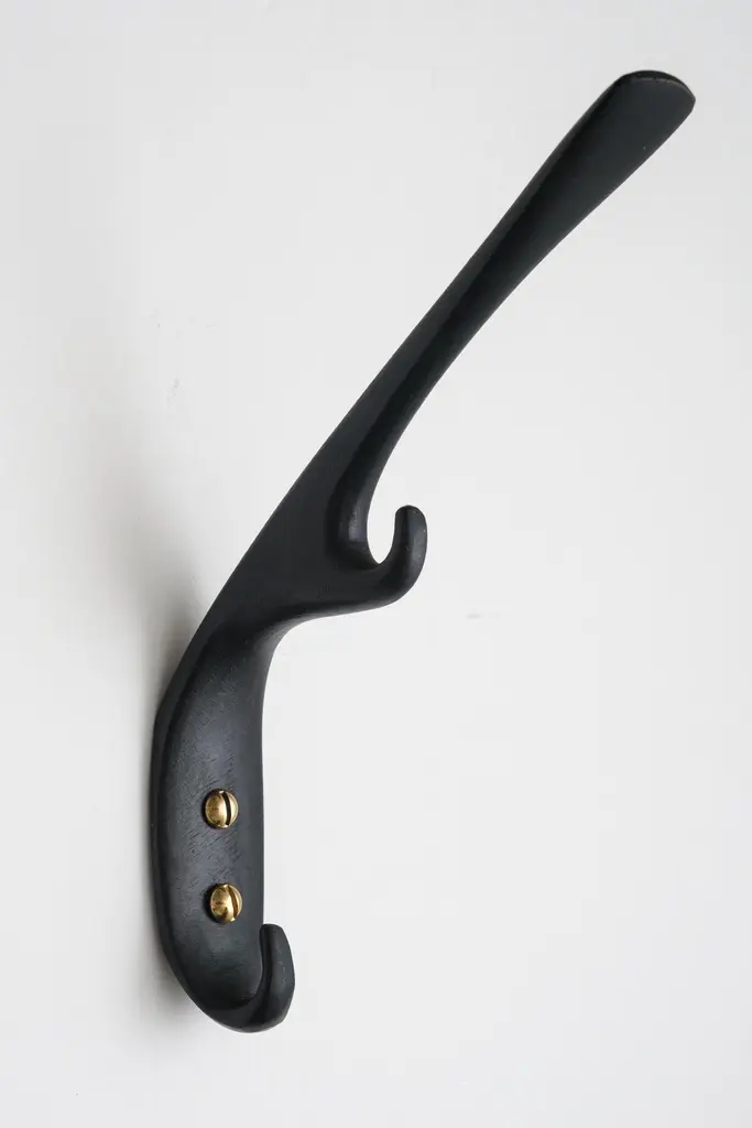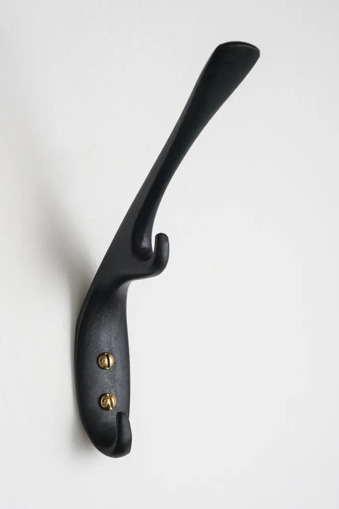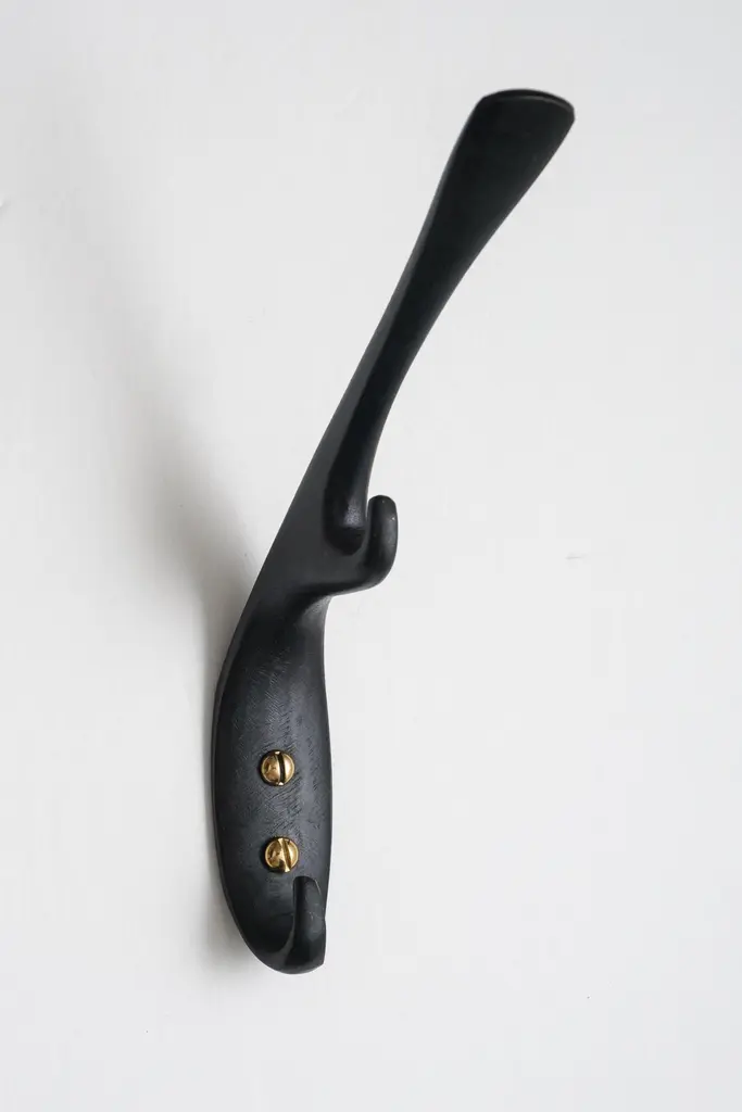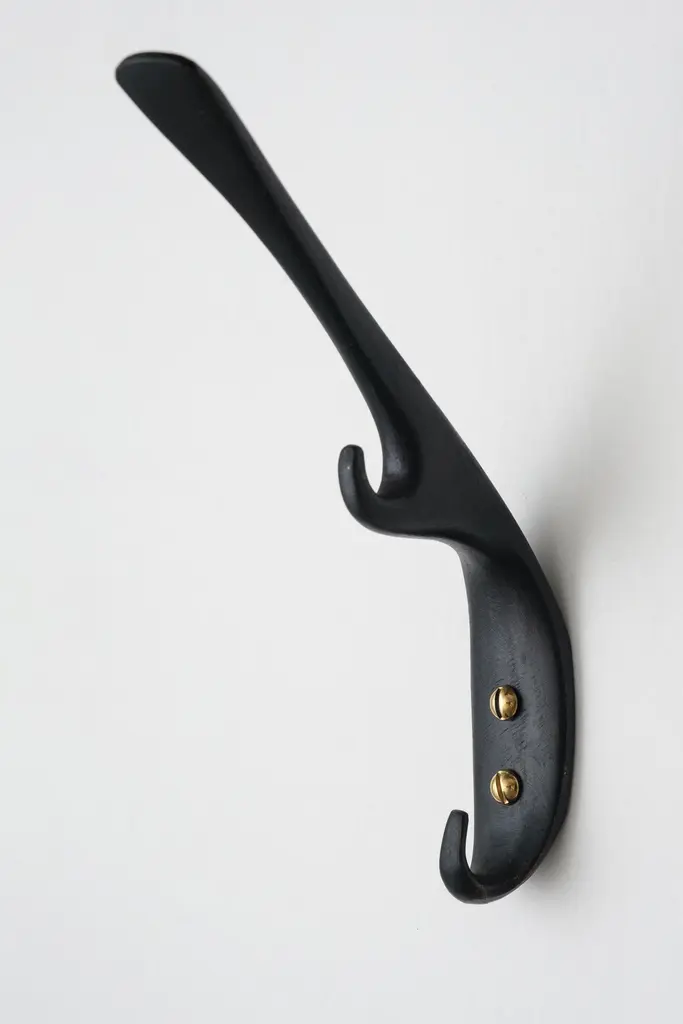 Carl Auböck #5439 patinated brass hook. Designed in the 1950s, this versatile and Minimalist Viennese hook is executed in darkly patinated and polished brass by Werkstätte Carl Auböck, Austria.Produced by Carl Auböck IV in the original Auböck workshop in the 7th district of Vienna using the same exacting standards, high-quality materials, original molds and techniques of his legendary namesake. Auböck's design career was long and varied, reaching its pinnacle of prestige at the Triennale di Milano in 1954, where he received four gold medals in recognition of his iconic work.Price is per item. Available in choice of polished brass, patinated brass, or nickel finishes.4 hooks in stock and ready to ship. Inventory availability subject to change without notice. Out of stock lead time can add 2-3 weeks or more.Please note that only one representative example of each item is shown in the images. Finish varies from item to item due to the handmade nature of their fabrication and due to the unique chemical patination process, which is meant to simulate 100 years of exposure of brass to sunlight.Made to order. All sales are final.