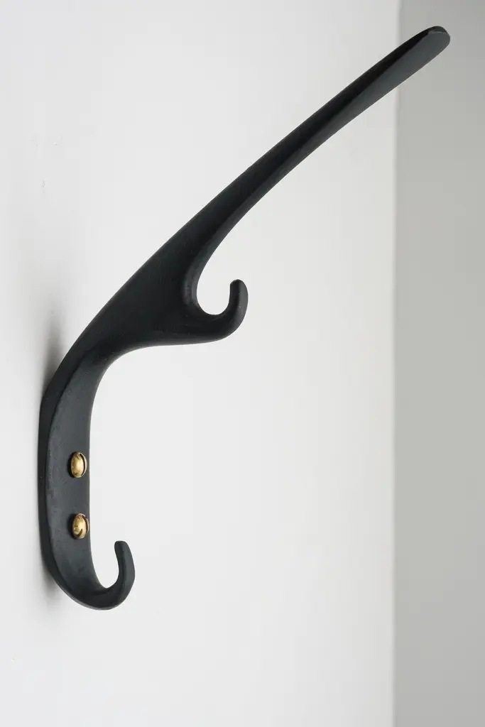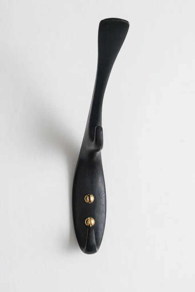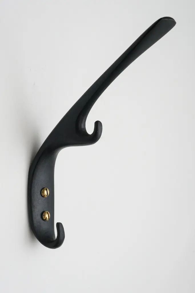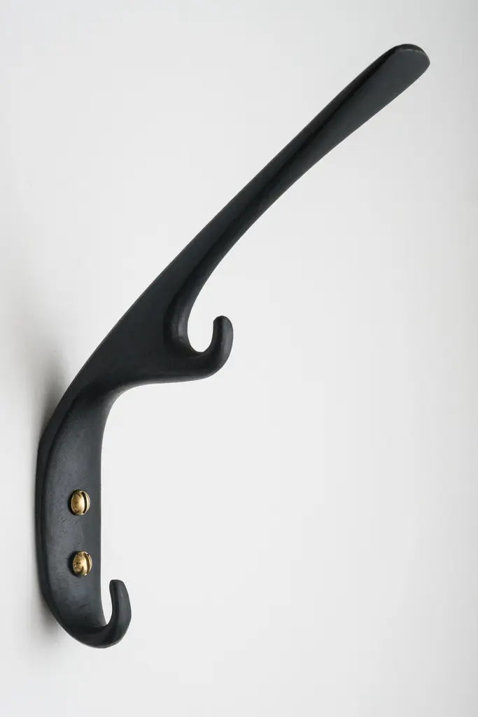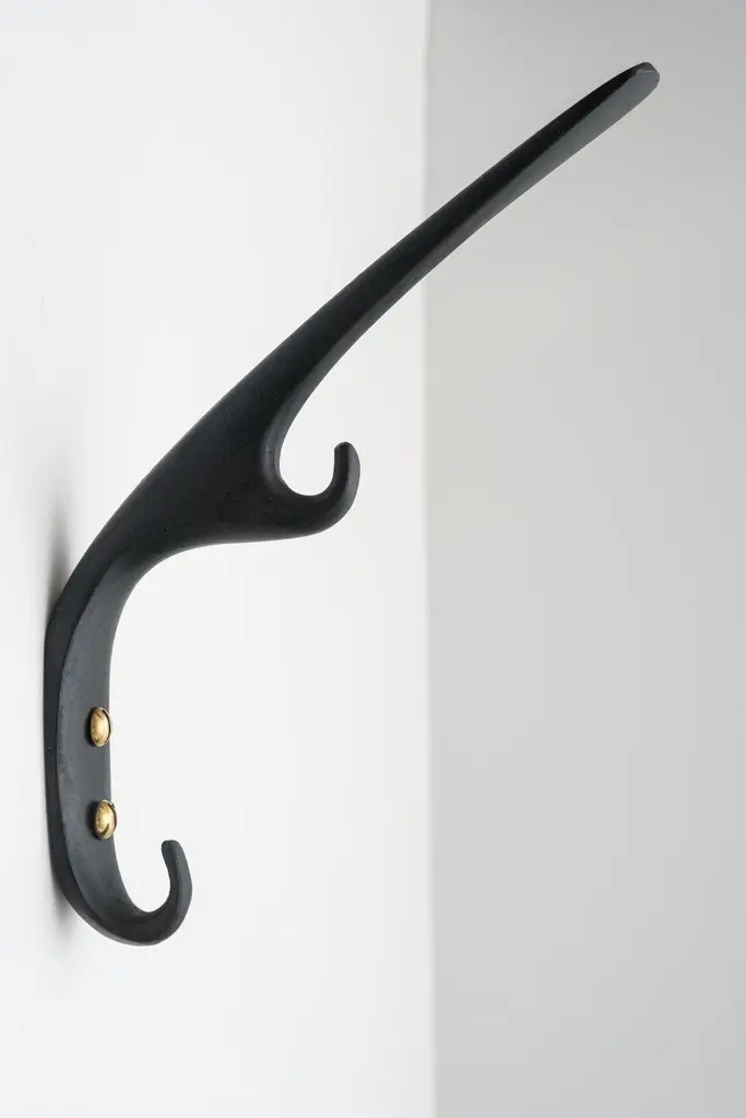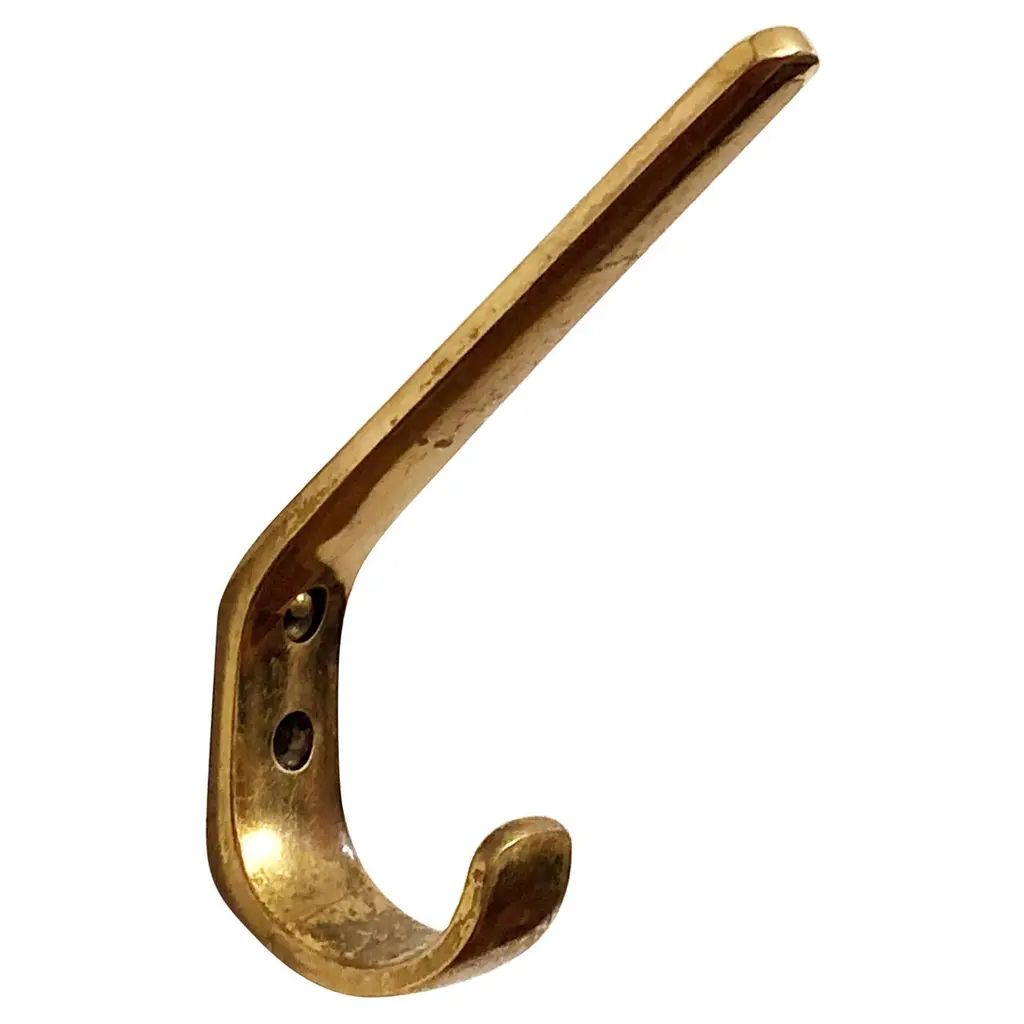 Carl Auböck #5439 patinated brass hook. Designed in the 1950s, this versatile and Minimalist Viennese hook is executed in darkly patinated and polished brass by Werkstätte Carl Auböck, Austria.Produced by Carl Auböck IV in the original Auböck workshop in the 7th district of Vienna using the same exacting standards, high-quality materials, original molds and techniques of his legendary namesake. Auböck's design career was long and varied, reaching its pinnacle of prestige at the Triennale di Milano in 1954, where he received four gold medals in recognition of his iconic work.Price is per item. Available in choice of polished brass, patinated brass, or nickel finishes.4 hooks in stock and ready to ship. Inventory availability subject to change without notice. Out of stock lead time can add 2-3 weeks or more.Please note that only one representative example of each item is shown in the images. Finish varies from item to item due to the handmade nature of their fabrication and due to the unique chemical patination process, which is meant to simulate 100 years of exposure of brass to sunlight.Made to order. All sales are final.