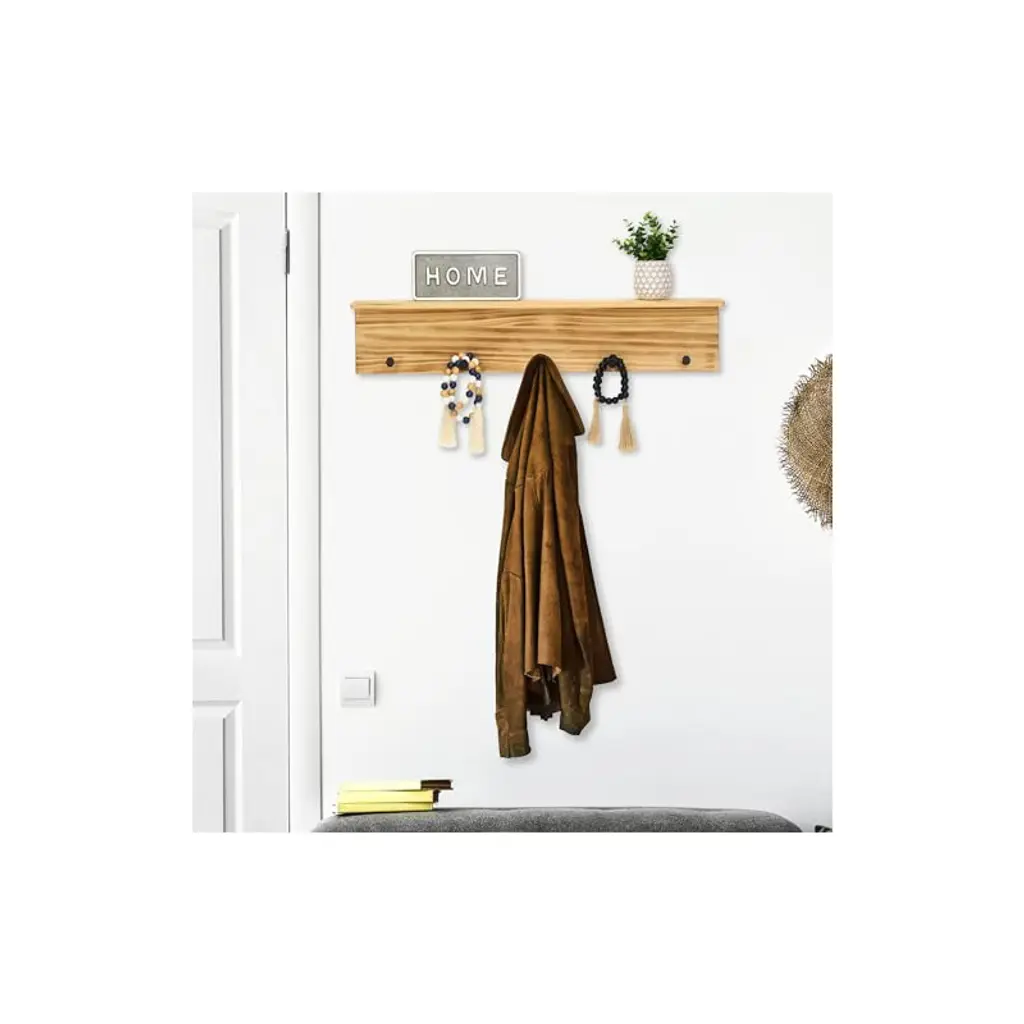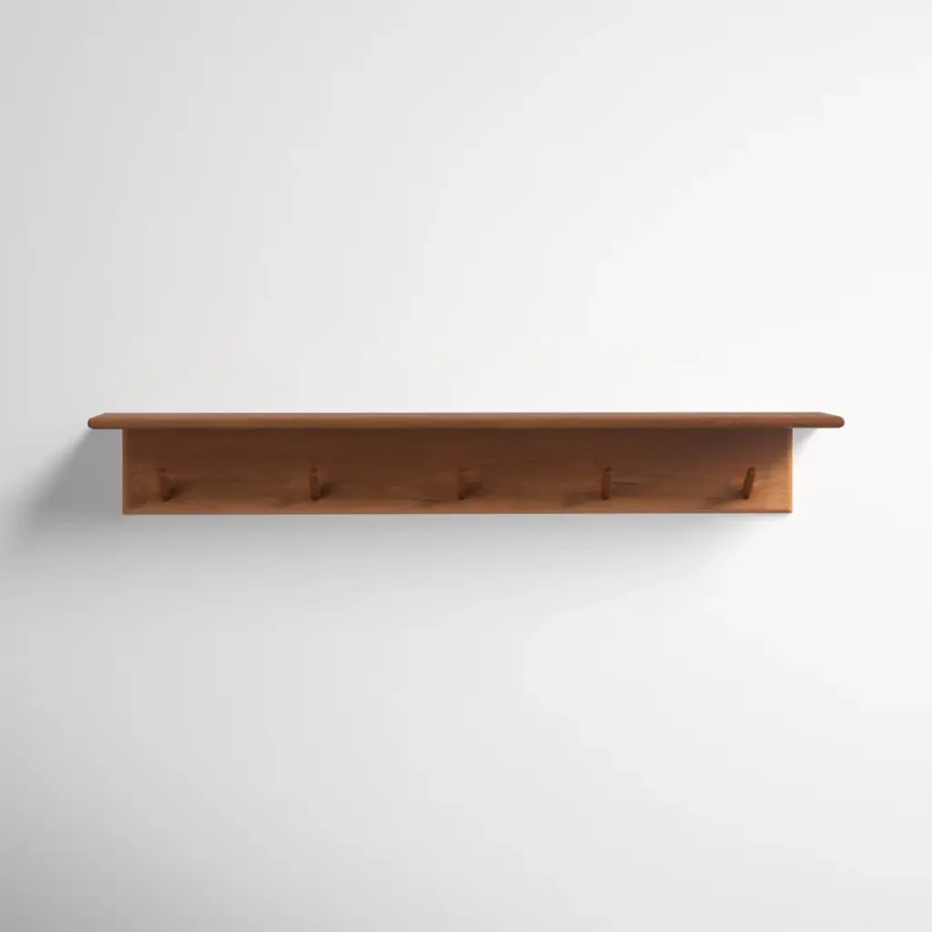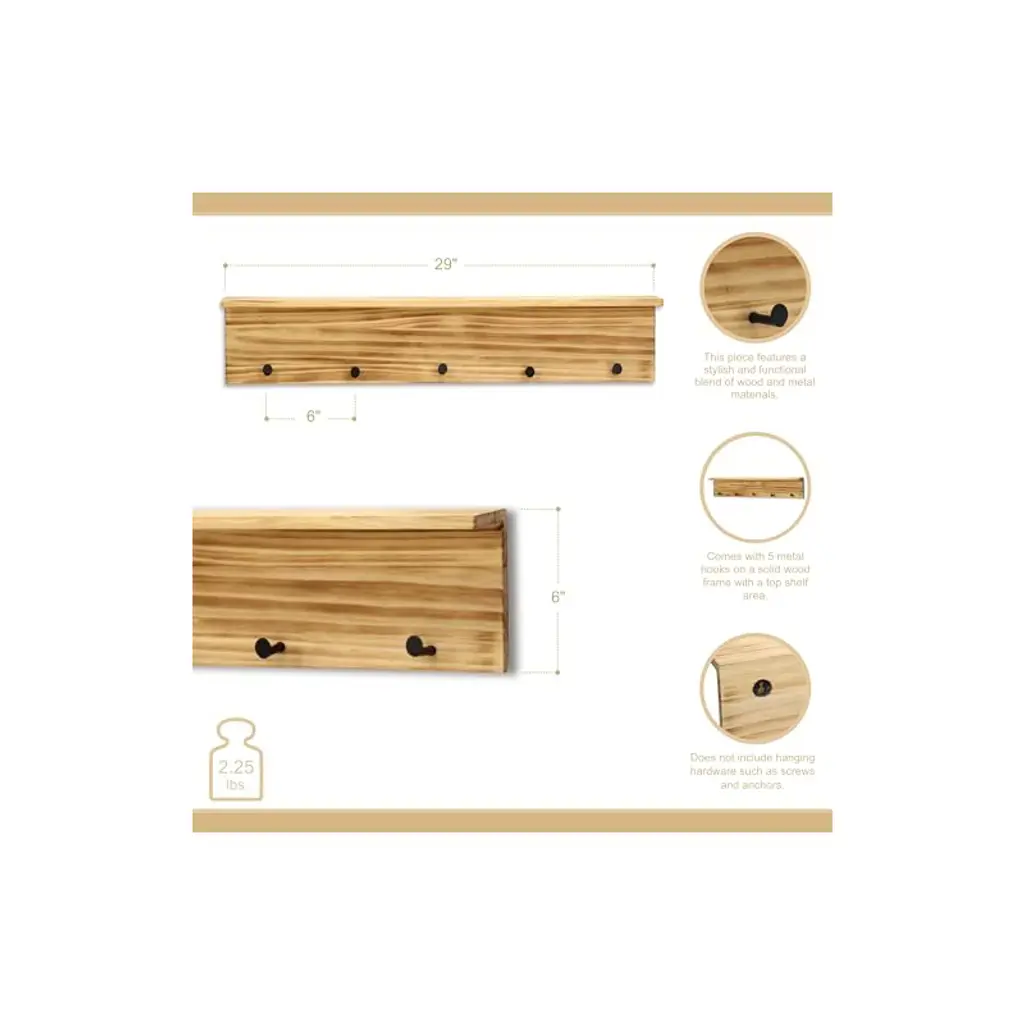 The Aldervale 5 Hook Shelf offers both style and functionality. Handcrafted with a blend of wood and metal, it features five sturdy hooks on a solid wood frame, providing ample space to hang coats, bags, or hats. The top shelf area adds extra storage or display space. Simply unbox and enjoy the convenience of this beautifully crafted piece. Please note, hanging hardware not included.