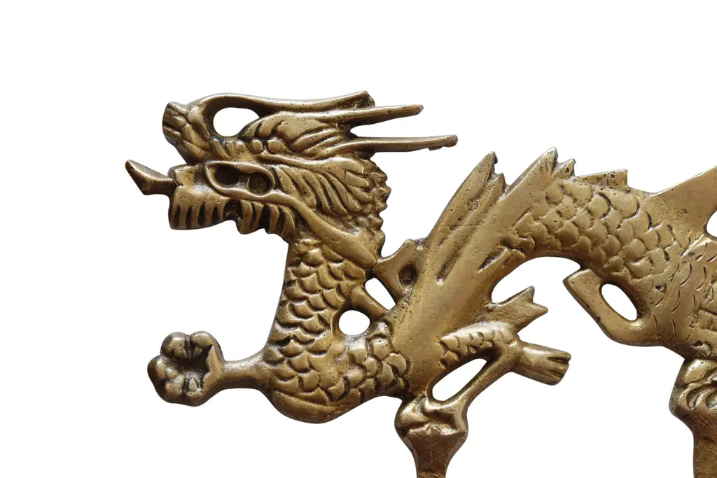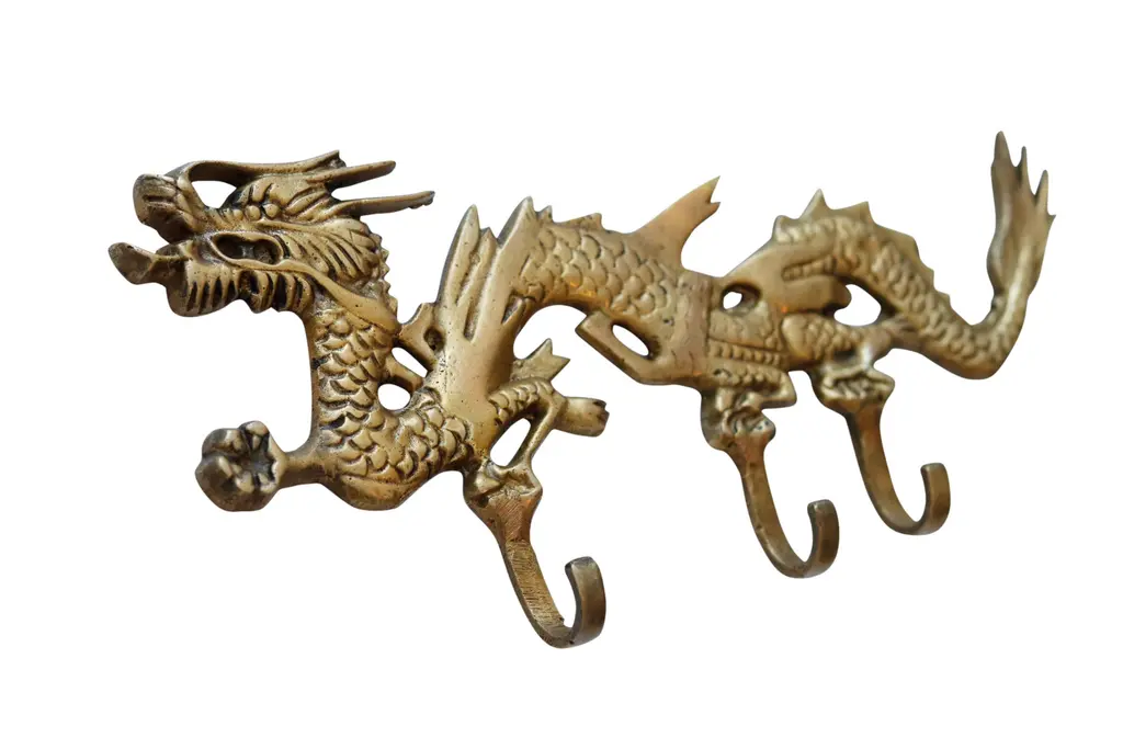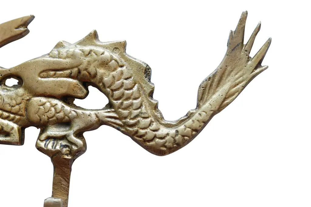 A Chinoiserie brass wall fixture with three hooks. A central bar is cast in the shape of a Chinese dragon decorated with scales and trailing fins at the face and along the body. The piece is cast to give the look of the dragon holding the hooks with the front clawed foot in a fist.