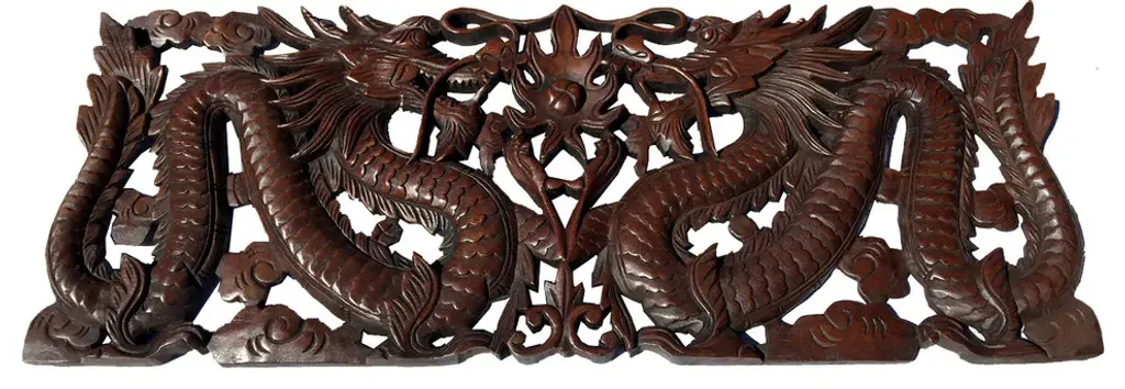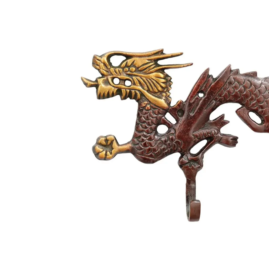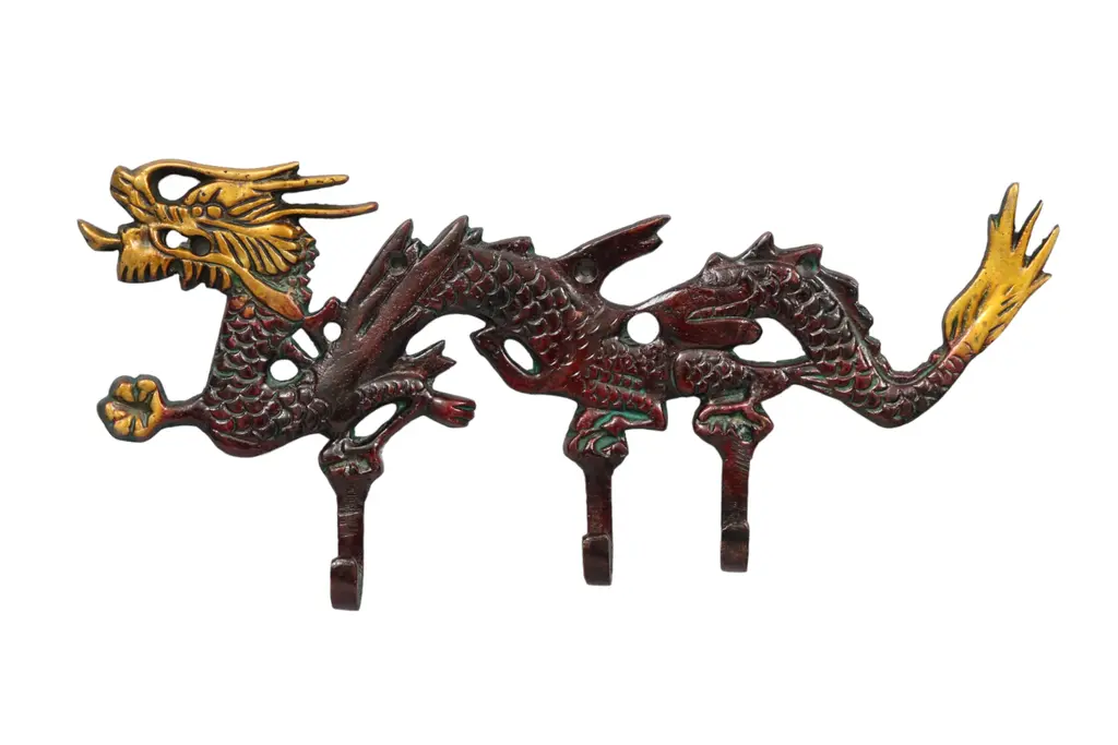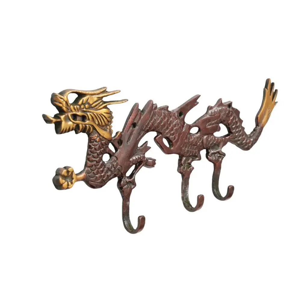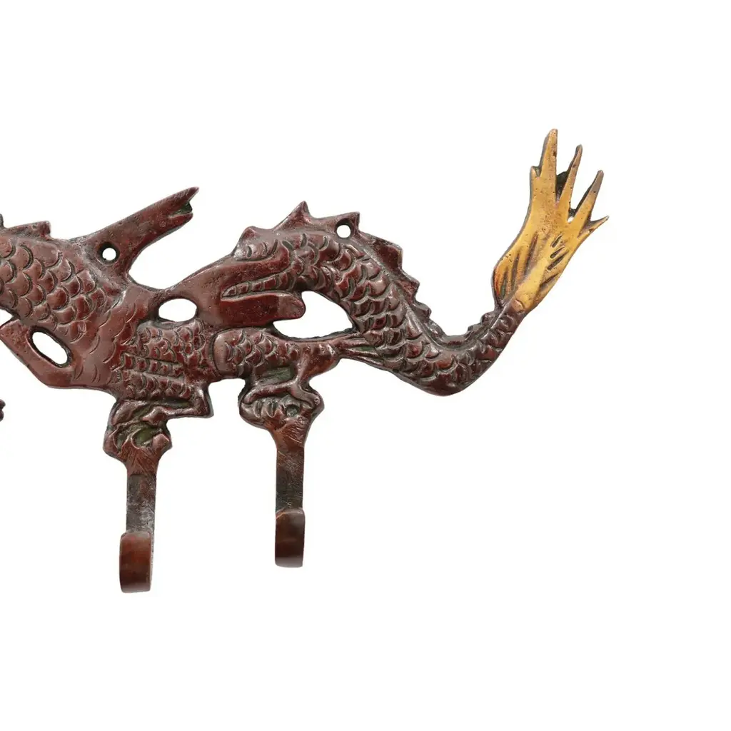 A Chinoiserie red brass wall fixture with three hooks. A central bar is cast in the shape of a Chinese dragon decorated with scales and trailing fins at the face and along the body. The piece is cast to give the look of the dragon holding the hooks with the front clawed foot in a fist.