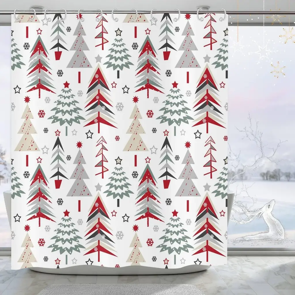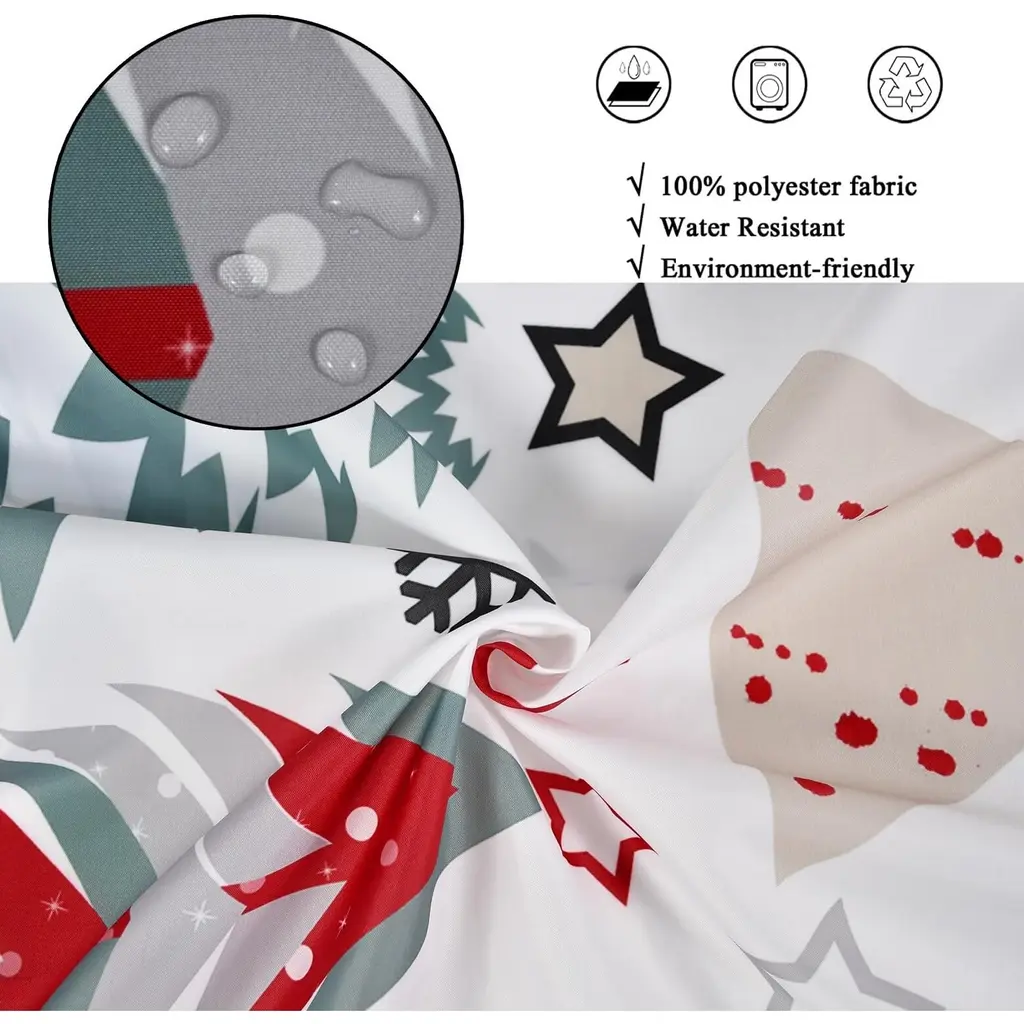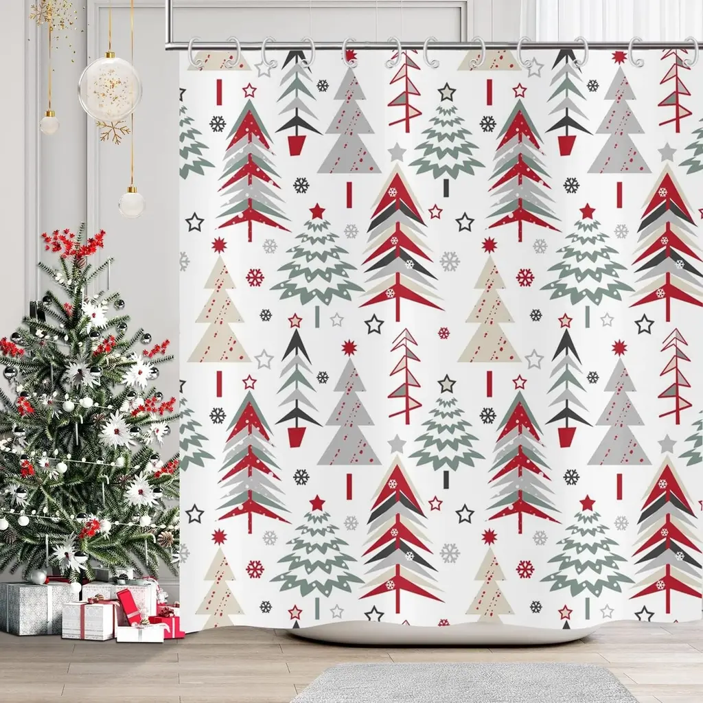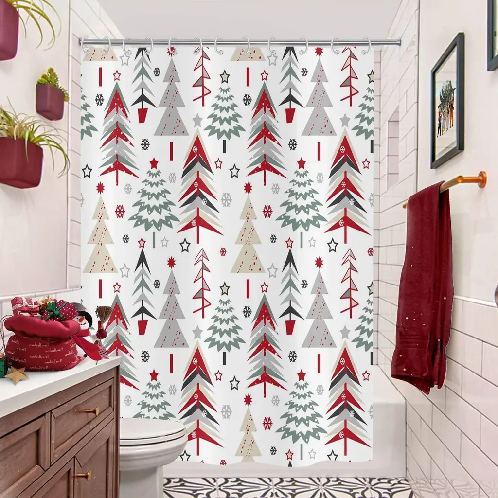 Celebrate the festive season with this Christmas Shower Curtain, featuring a striking design of red stars and snowflakes. Measuring 72" x 72", this waterproof curtain adds a cheerful touch to your bathroom decor while keeping your space dry. Made from high-quality, durable fabric, it is designed for easy maintenance and long-lasting use. The set includes matching hooks for hassle-free installation, making it a perfect choice for your holiday decorating needs. This shower curtain brings warmth and joy to your home, transforming your bathroom into a cozy winter wonderland!