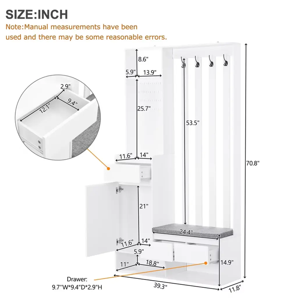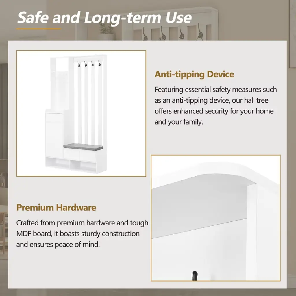 Say goodbye to entryway clutter with this all-in-one hall tree. Combining a pegboard, hooks, drawer, cabinet, open shelf, and cushioned bench, it offers both style and storage in one sleek unit. The pegboard allows for personalized organization, while the thick padded bench adds comfort. Built from durable MDF with an anti-tip kit for safety, this multifunctional piece ensures your space stays tidy, stylish, and secure for daily use.