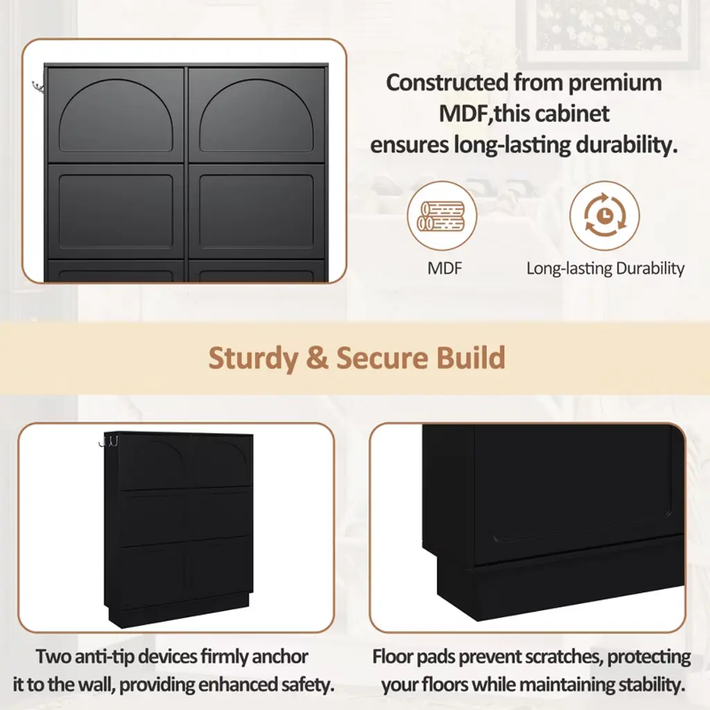 This elegant shoe cabinet combines smart storage with timeless style. Featuring six double-layer flip drawers with adjustable partitions, it stores 12¨C24 pairs of shoes, from boots to heels. Crafted from premium MDF with anti-tip devices, it offers durability and safety. The slim 9.45" profile, arched cream panels, and added hooks blend beauty with function, while ventilation holes keep your footwear fresh and odor-free.